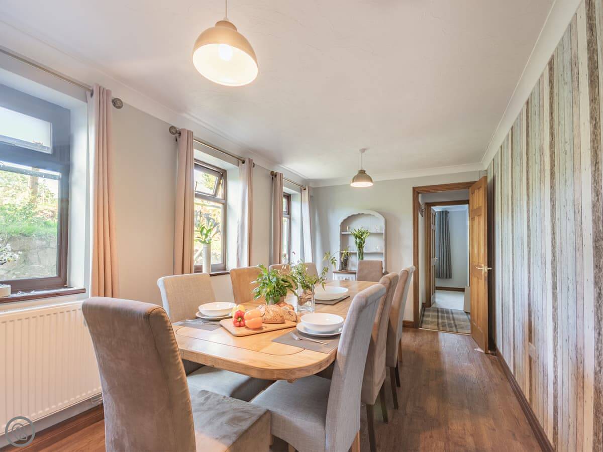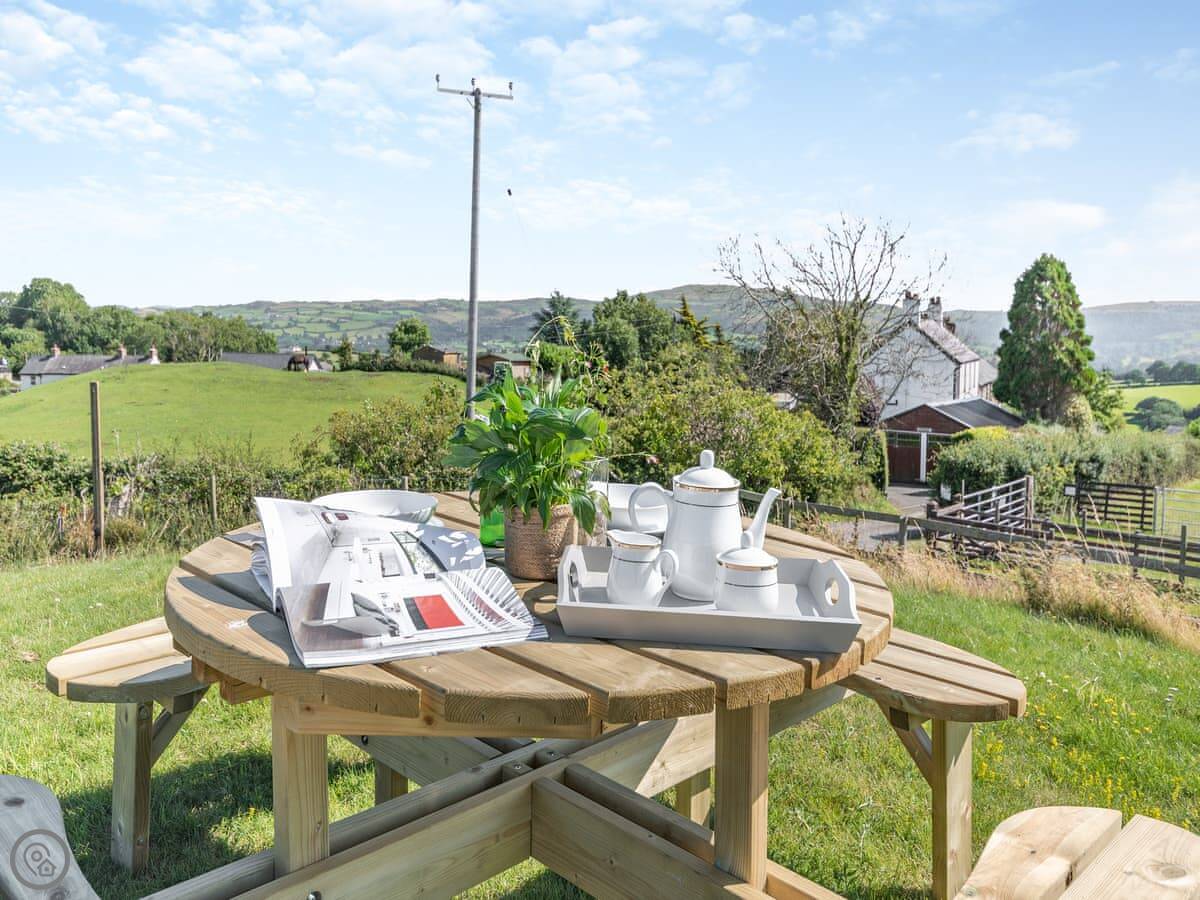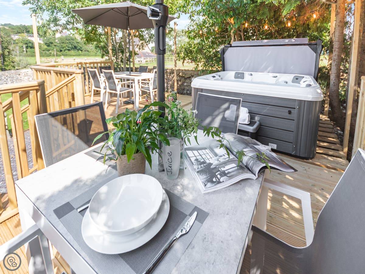 The living room has a wood burner. The dining table seats ten. The kitchen has what you'd need. There's a hot tub outside. The garden has a patio with an outdoor dining area for ten and a separate picnic spot on a bit of a rise.