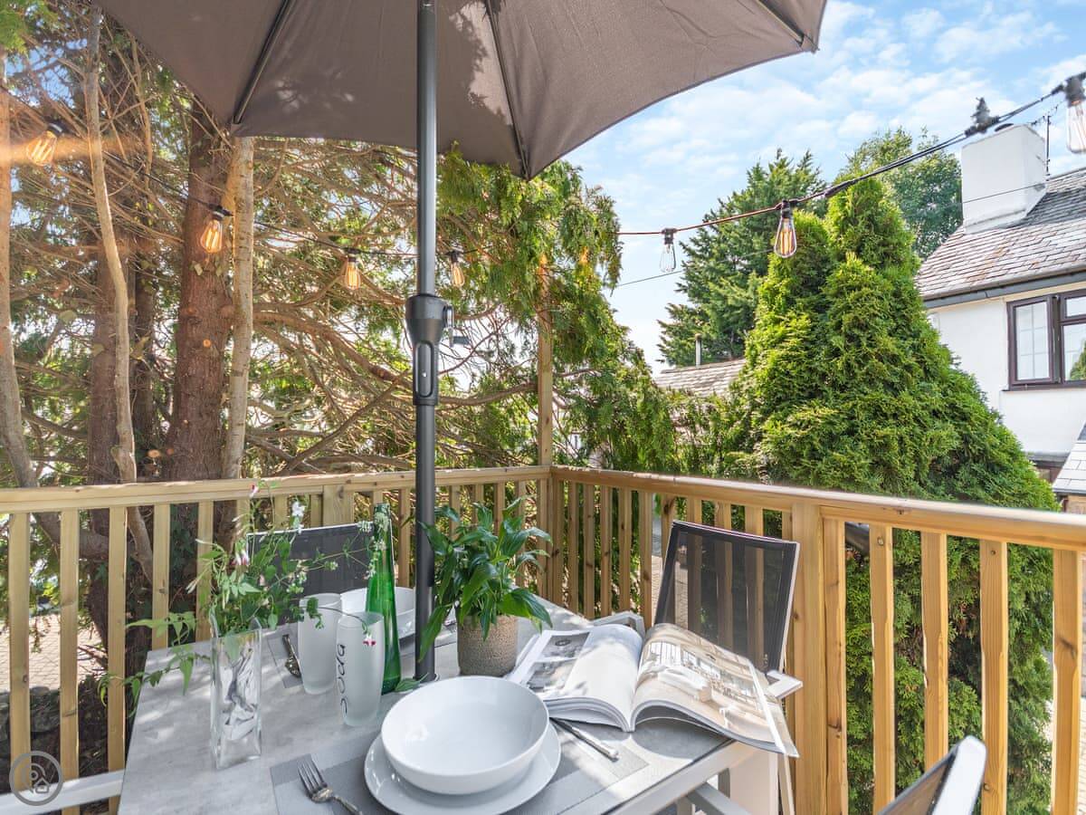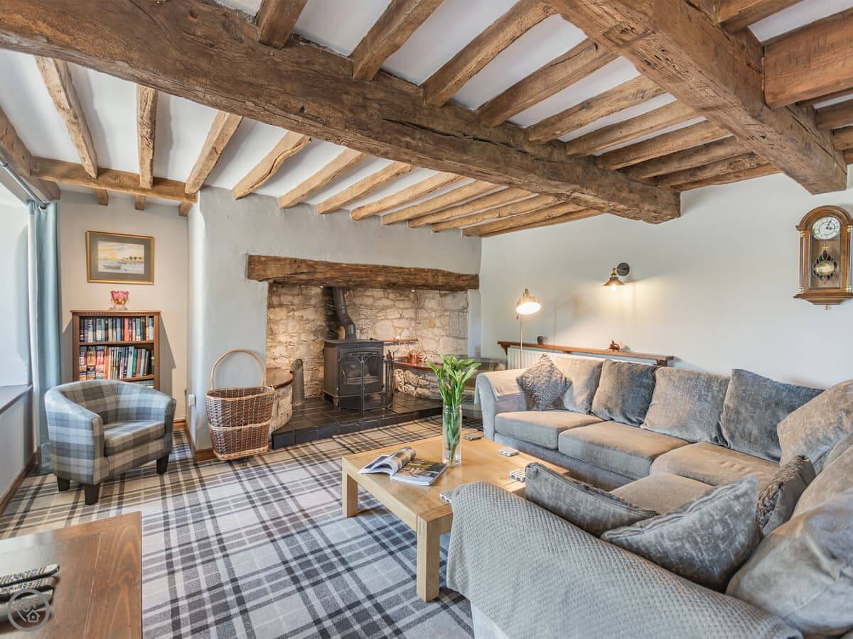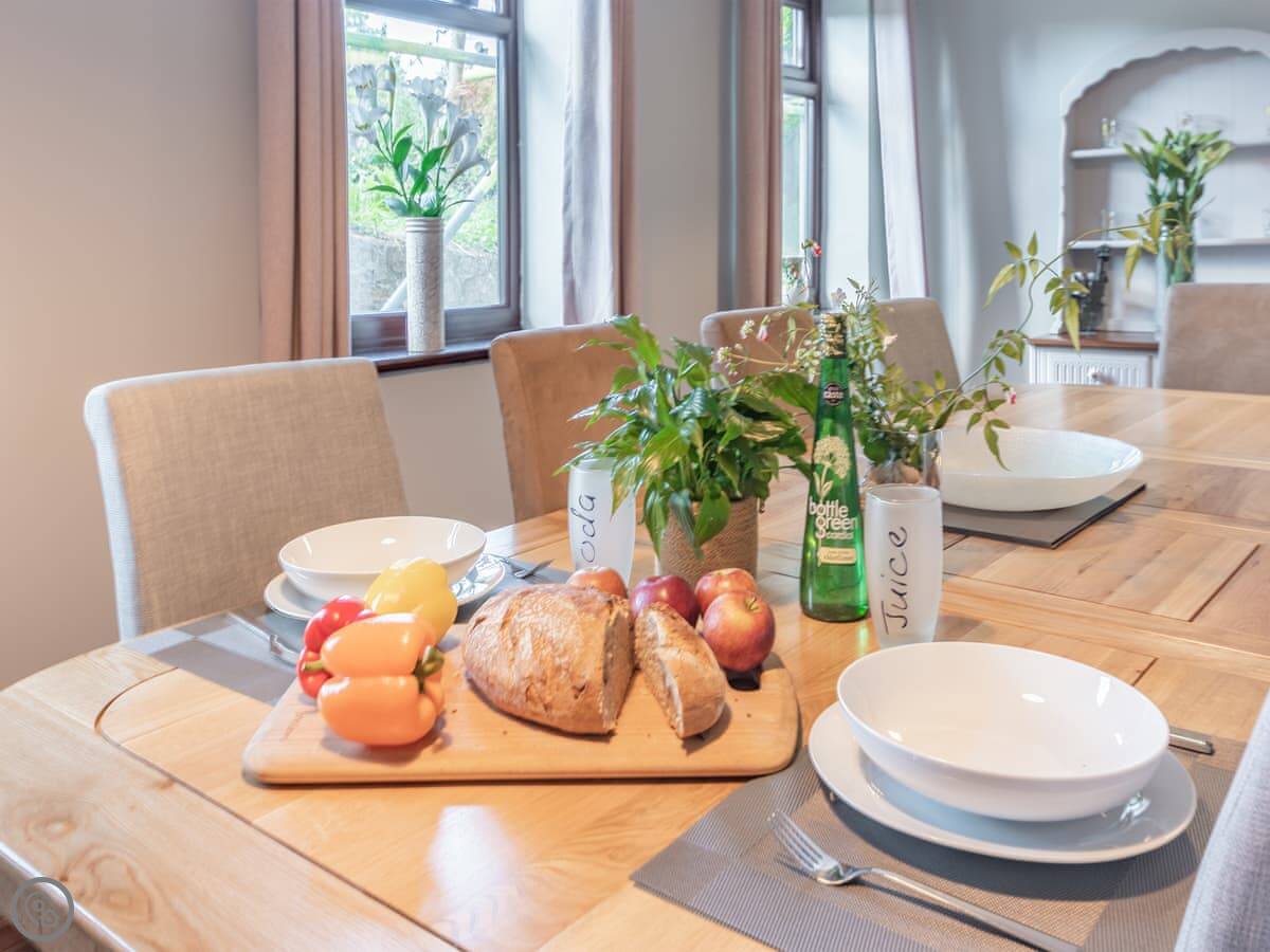 The living room has a wood burner. The dining table seats ten. The kitchen has what you'd need. There's a hot tub outside. The garden has a patio with an outdoor dining area for ten and a separate picnic spot on a bit of a rise.