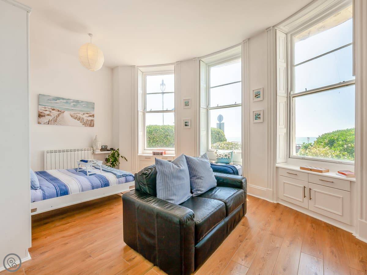 The Beach Studio is on Brighton seafront, opposite the beach. It's basically one big open room with a kitchen at the back and the living bit by the windows.