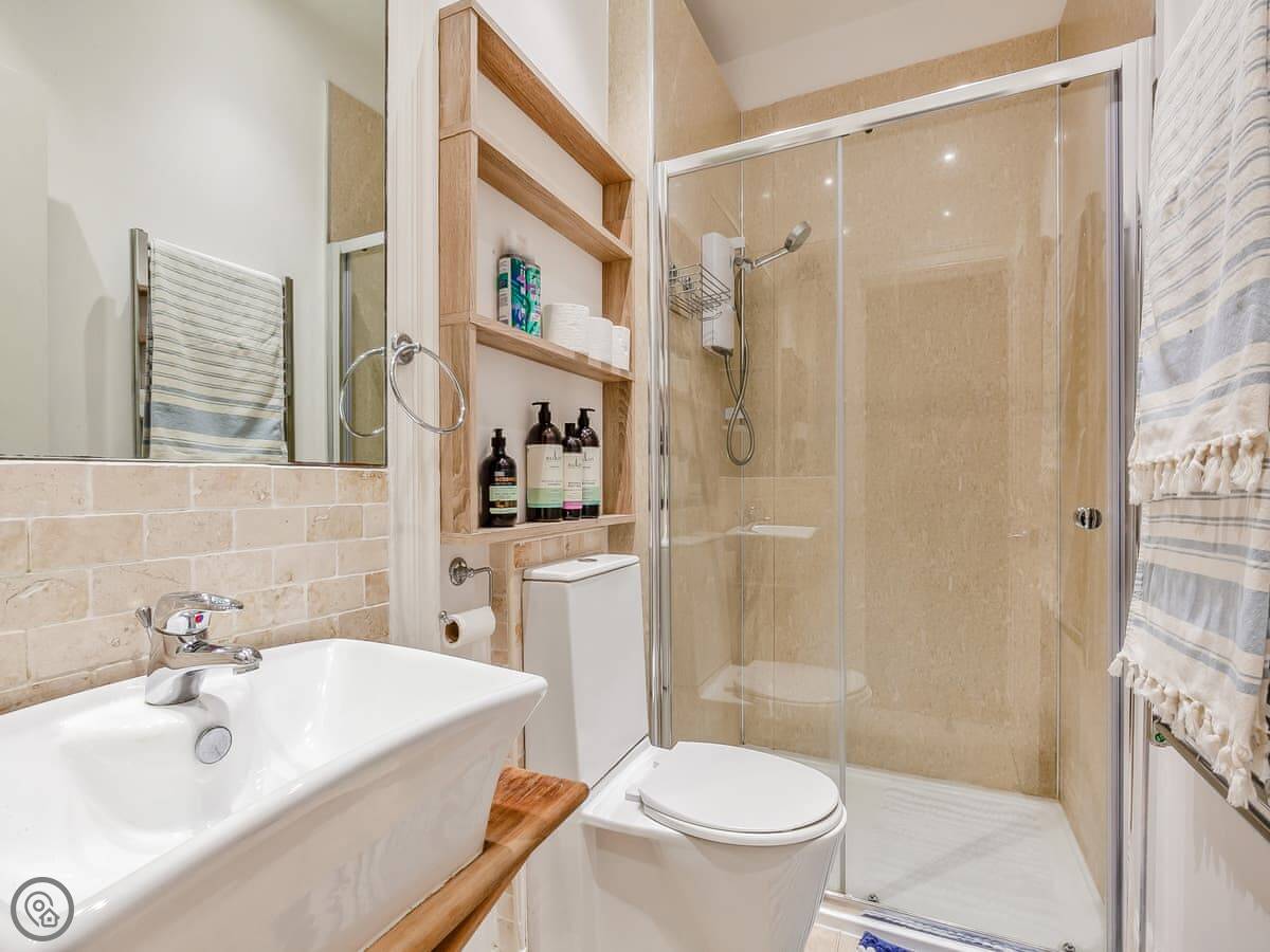 It sleeps four, but there's one main bed. It's a double that pulls down from the wall. There's also a sofa bed. The bathroom has a shower. It's got a 4 Star rating. The place is modern and clean. The big windows are great, you can see the whole beach.