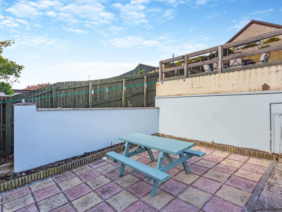 Outside, there's a patio with decking. You get a view out to sea from there. That's where the name comes from, you can sometimes see the shape of a mermaid on the horizon. It's just a rock formation, but it's a nice feature.