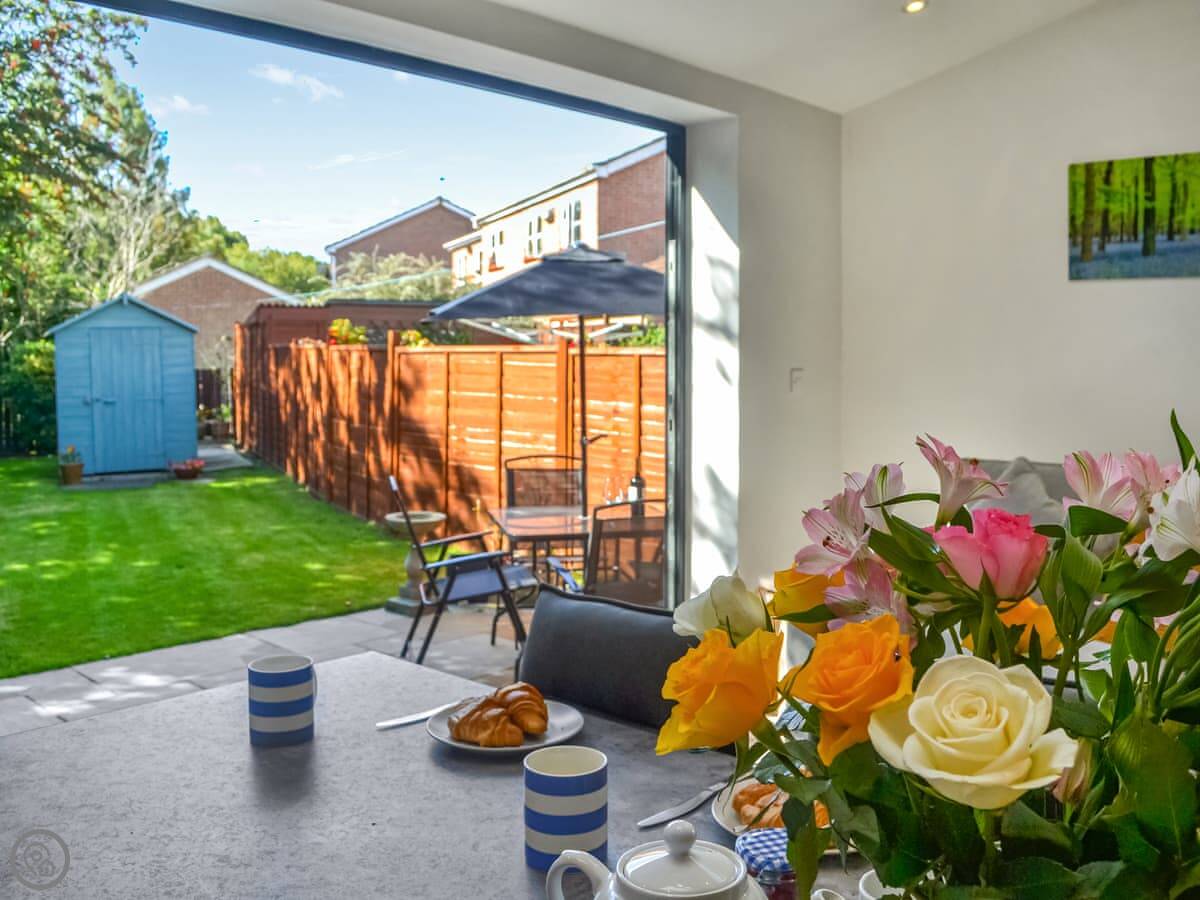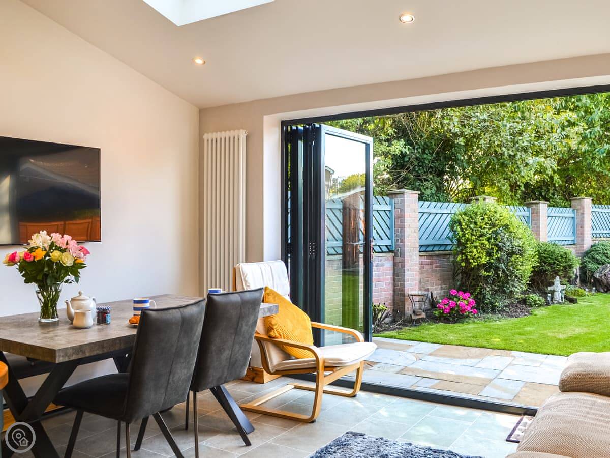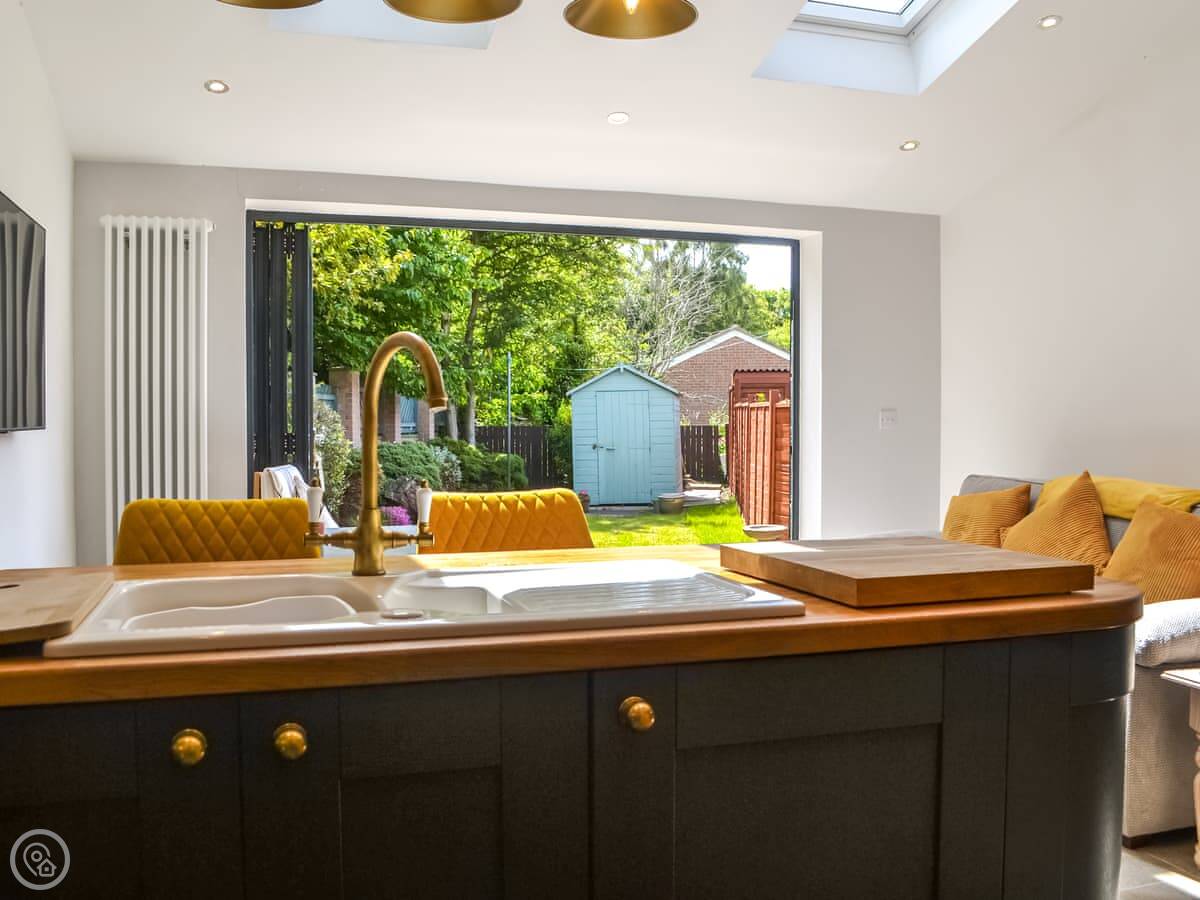 The main living space is a big open kitchen and dining area. There are bi-fold doors that open up to the garden. It's a good room to spend time in. There's a separate living room with a gas fire for cooler evenings.