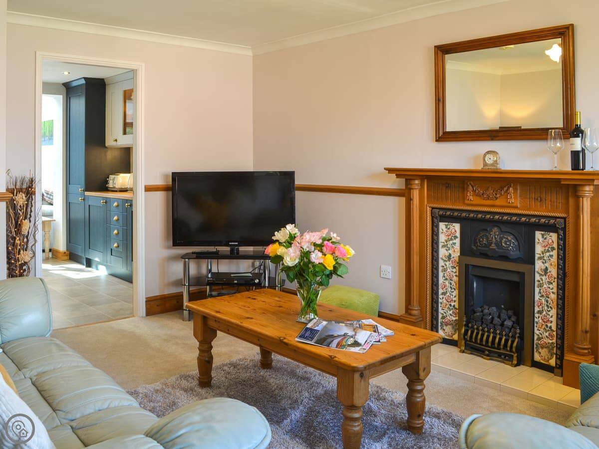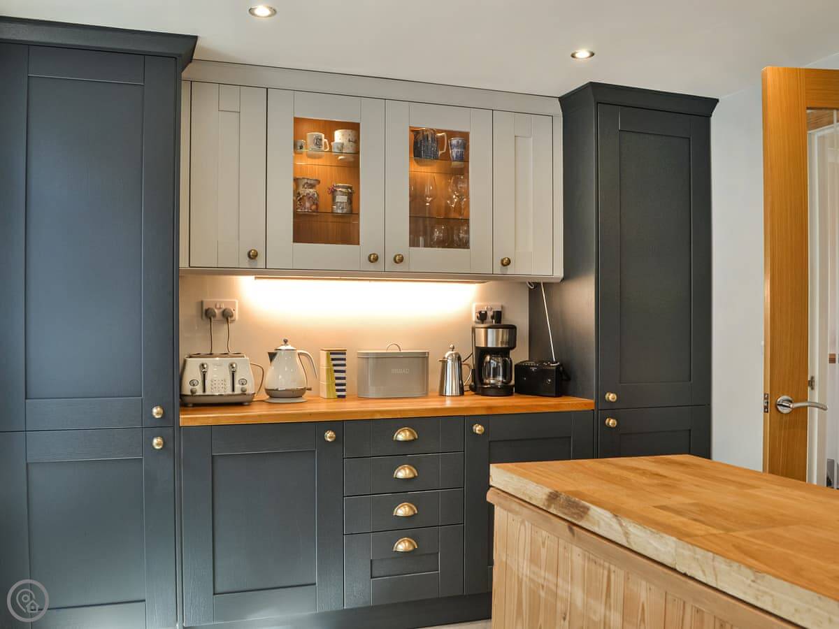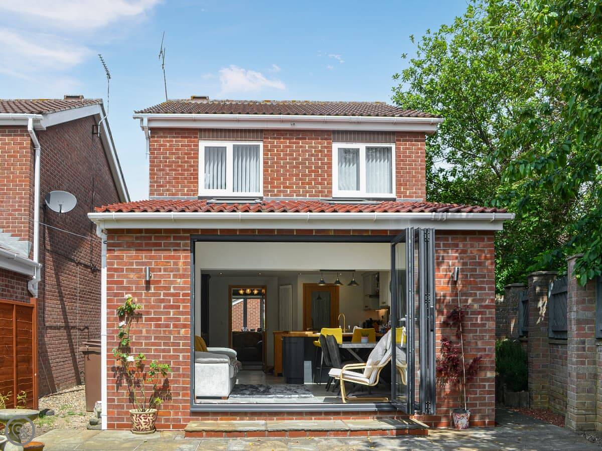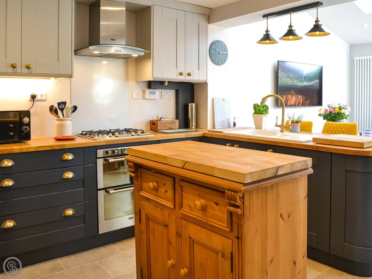 The main living space is a big open kitchen and dining area. There are bi-fold doors that open up to the garden. It's a good room to spend time in. There's a separate living room with a gas fire for cooler evenings.