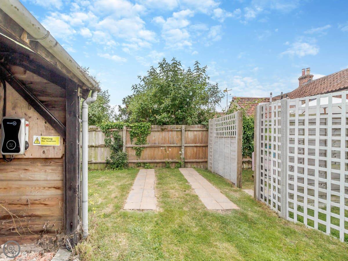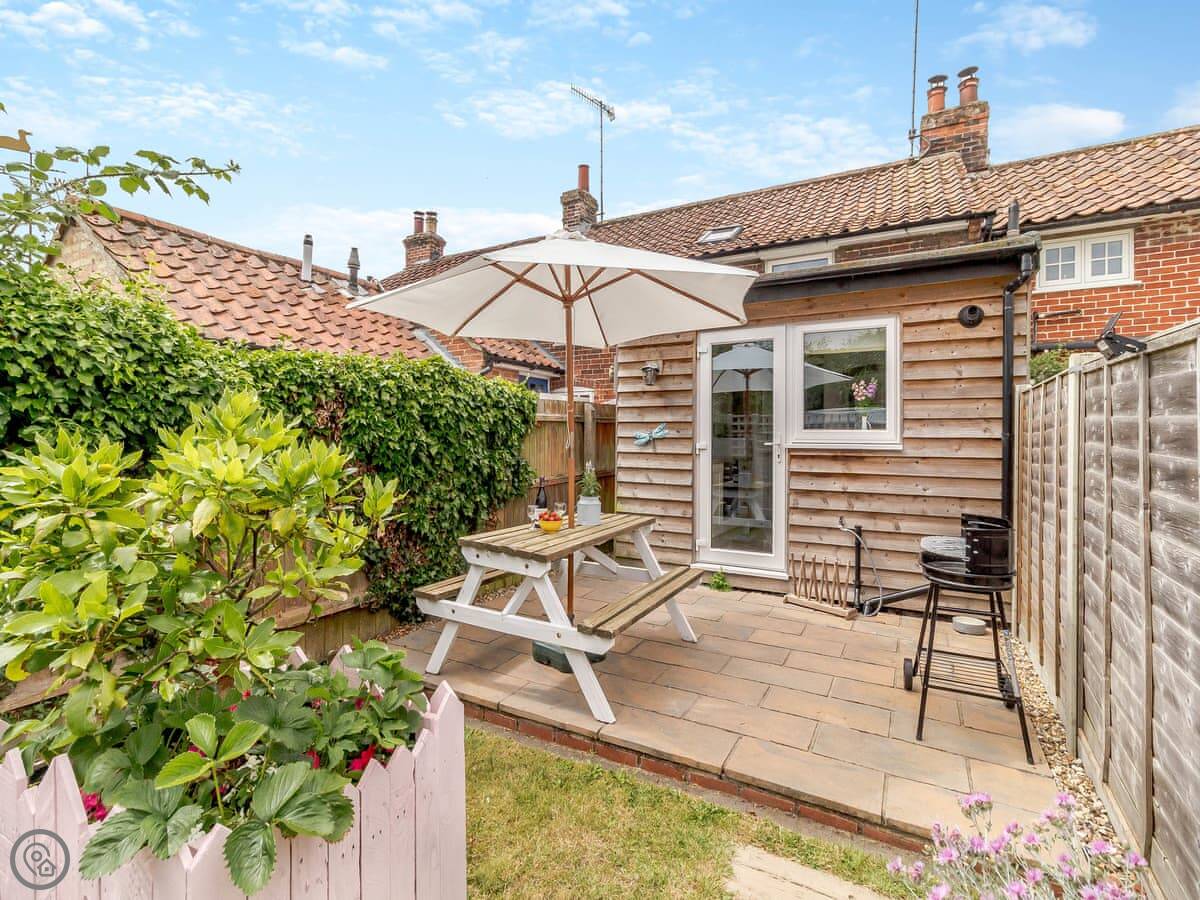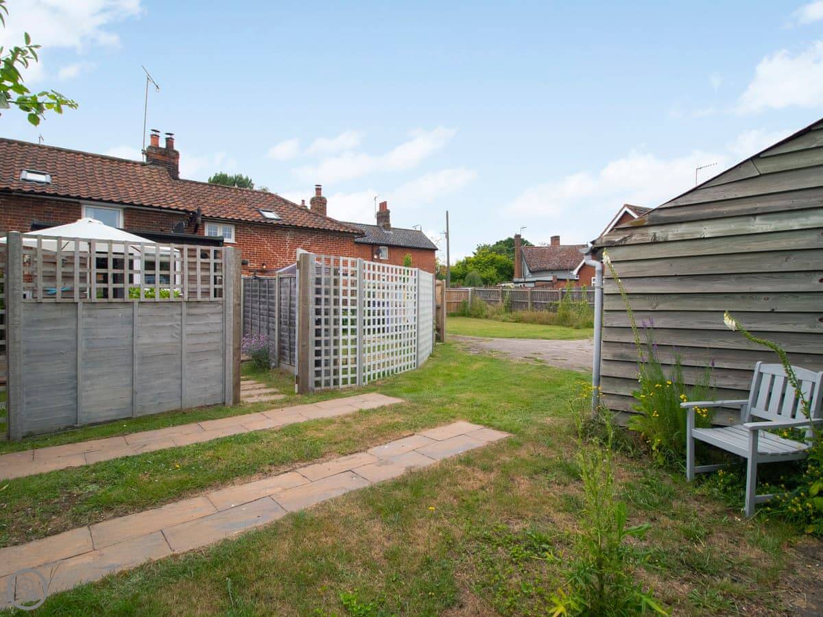 Inside, there's a wood burner in the living room and some beams. The kitchen has what you need. The garden is enclosed, which is good for dogs or kids. It's a lawn with seating, and the view is over fields. The River Deben is nearby.