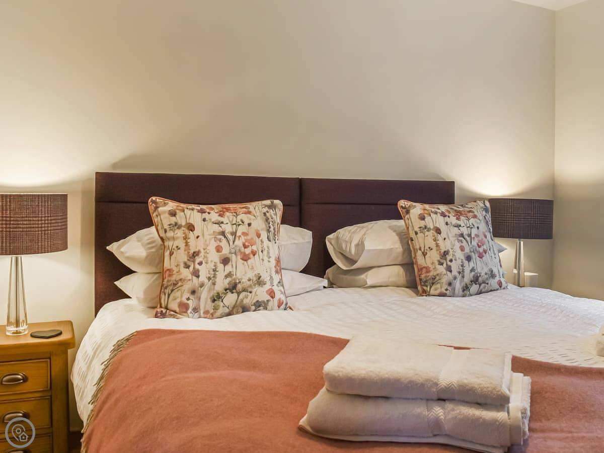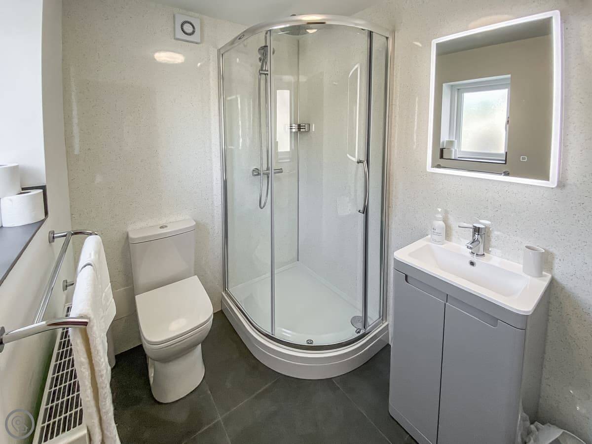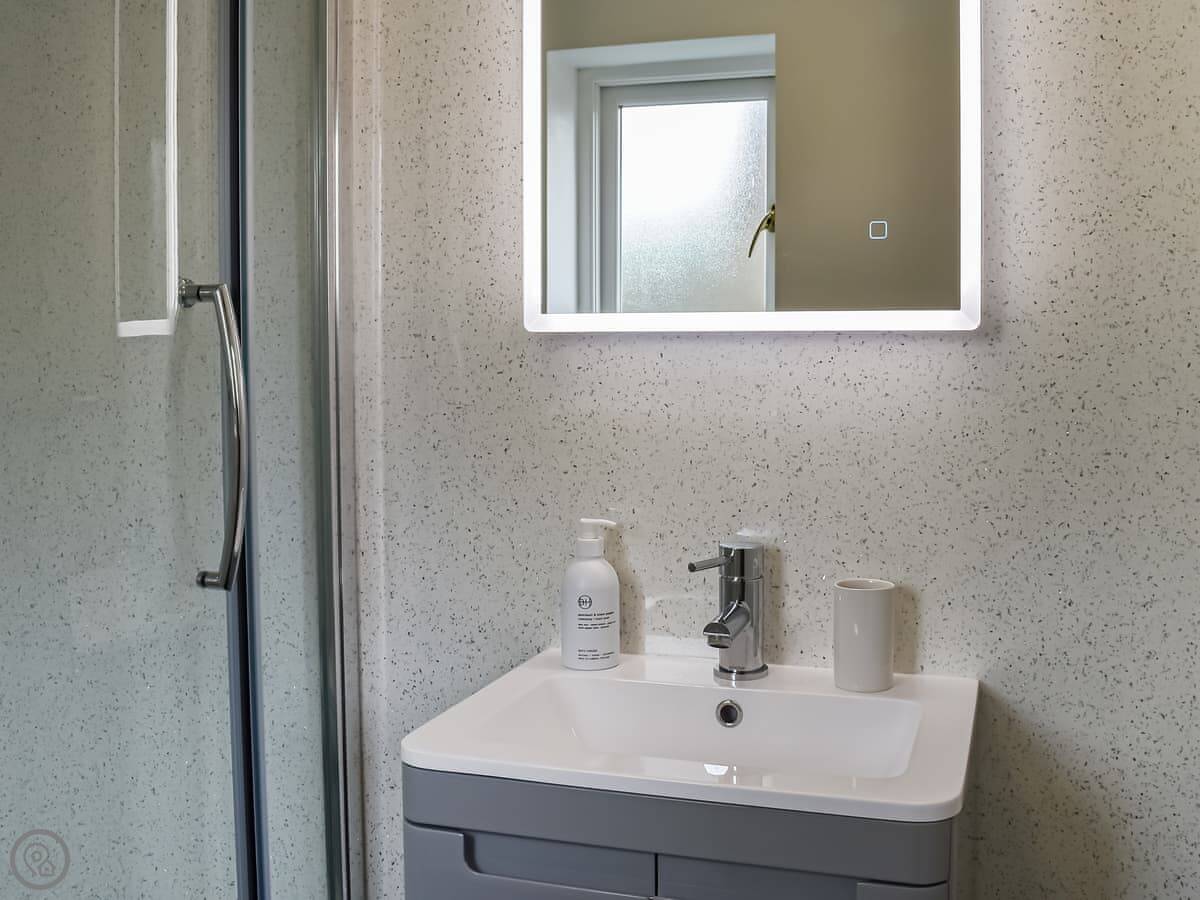 It's got a 5 Star rating. It's modern inside. The bedroom has a super king bed, which can be split into two singles if you ask in advance. The shower is big, a proper walk-in one. There's a wood burner in the living room. You get a Smart TV and Wi-Fi.