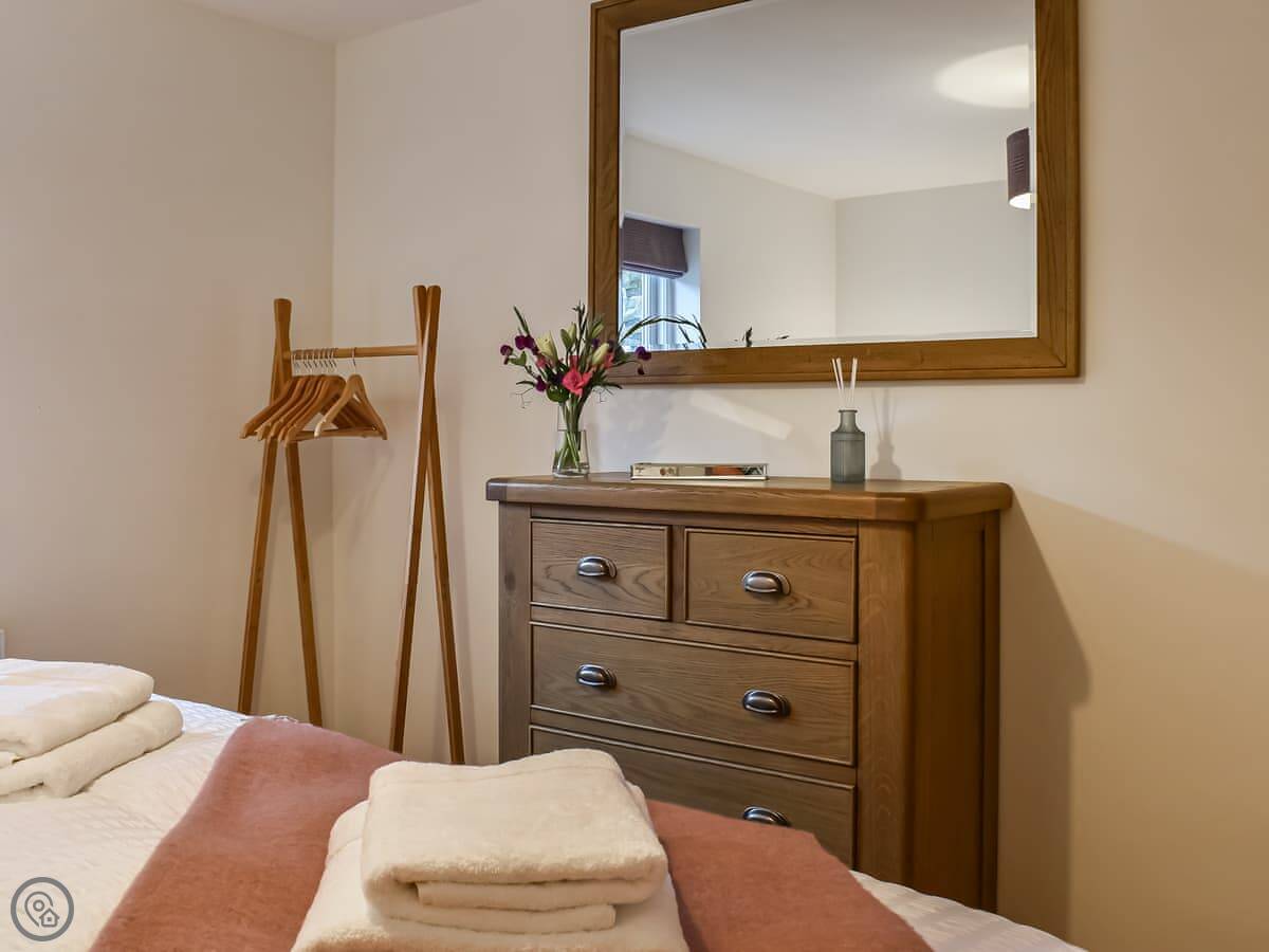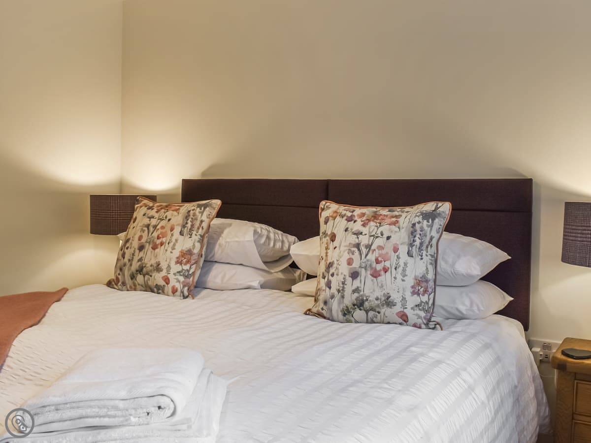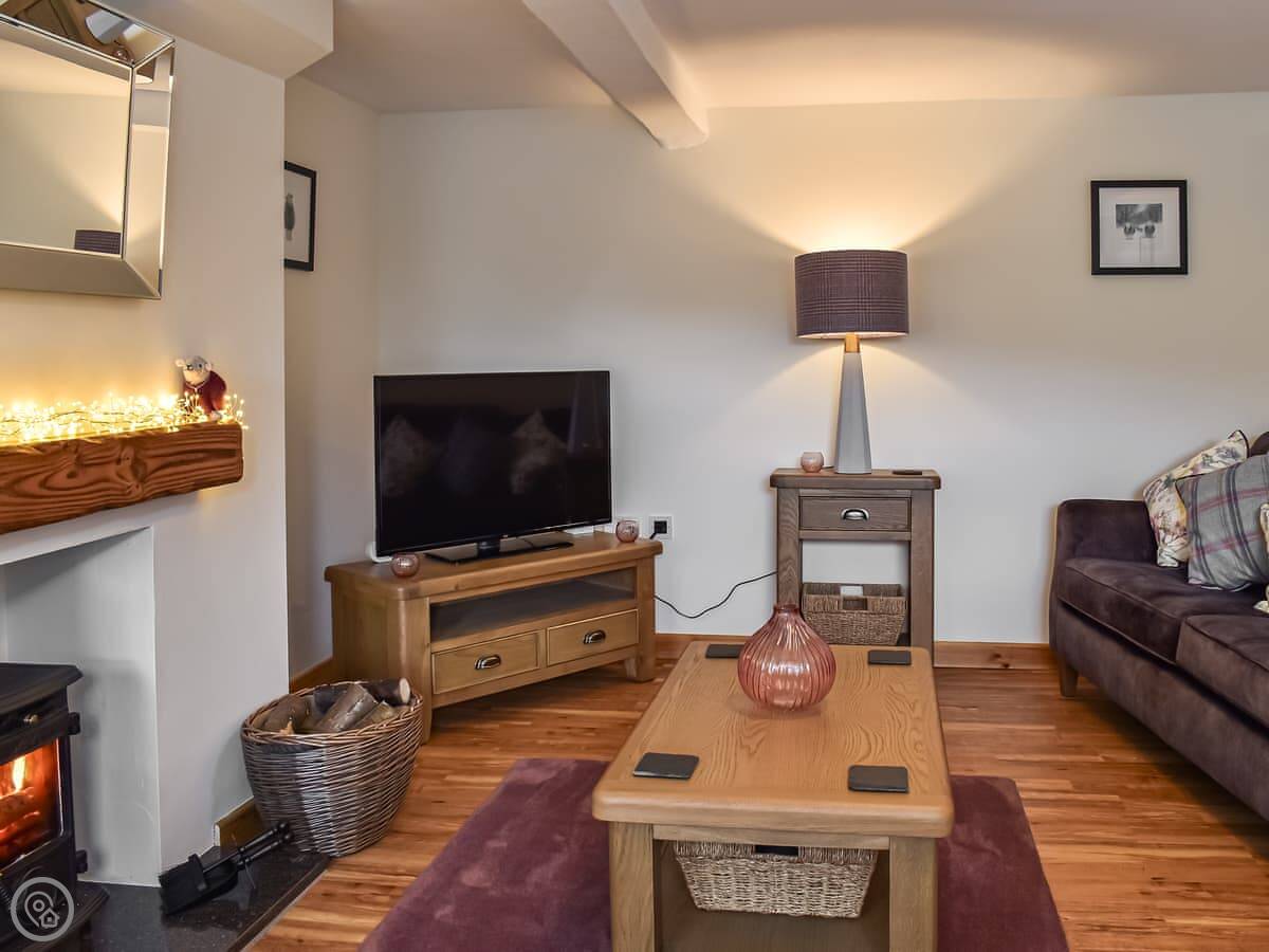 It's got a 5 Star rating. It's modern inside. The bedroom has a super king bed, which can be split into two singles if you ask in advance. The shower is big, a proper walk-in one. There's a wood burner in the living room. You get a Smart TV and Wi-Fi.