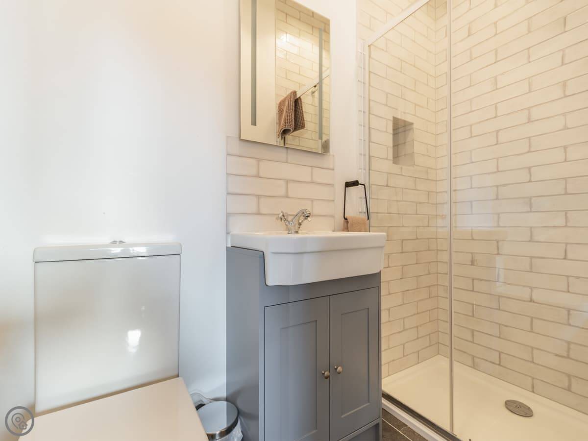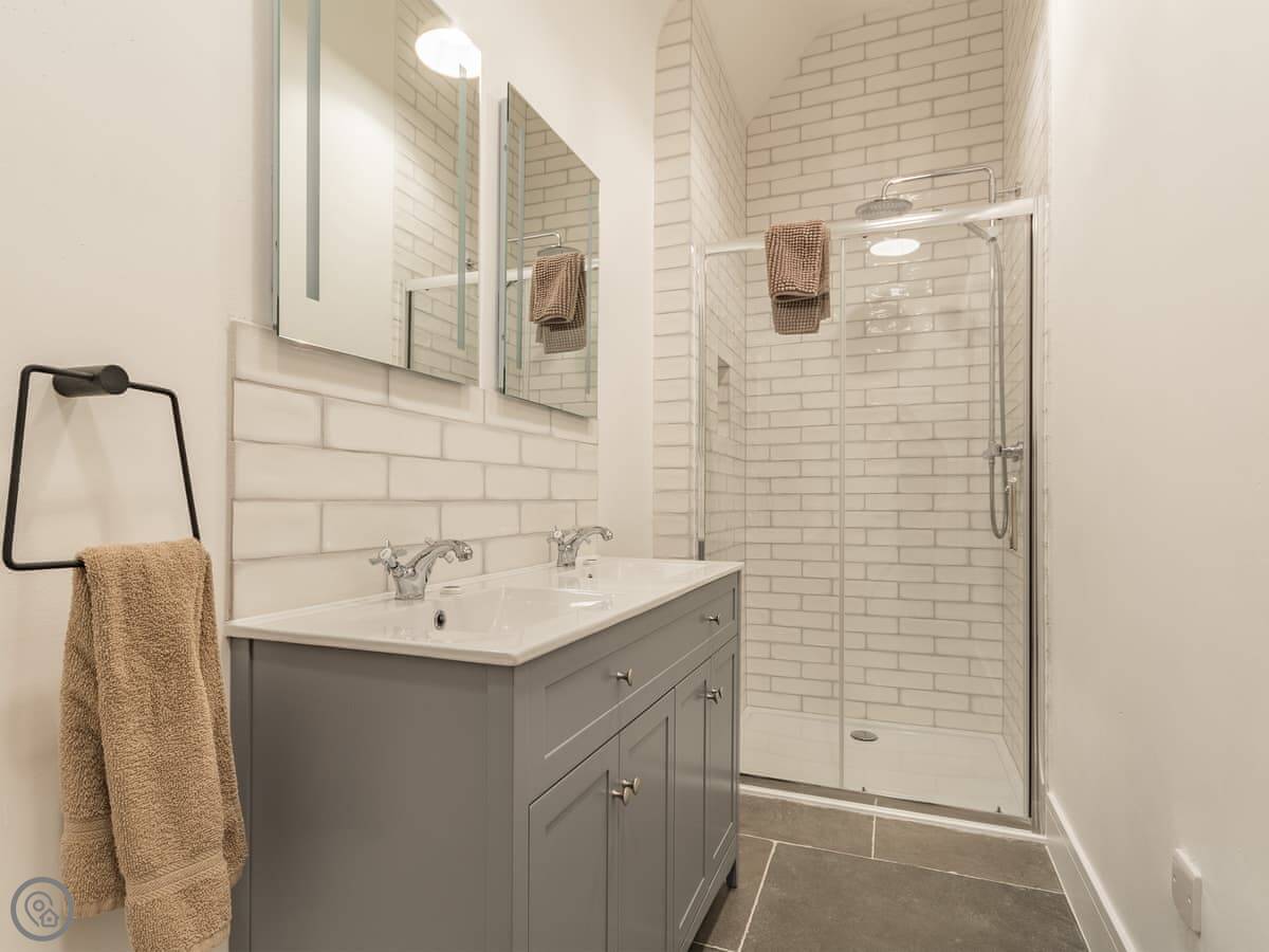 It sleeps seven. There are two bedrooms and two bathrooms. One bedroom has a very large bed and the other has bunk beds and singles, so it's set up for families. It's a 5 Star place, which means it's comfortable and well-finished. It has underfloor heating, which is good in winter.