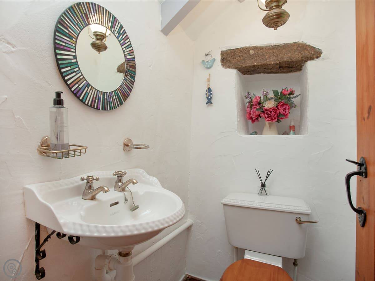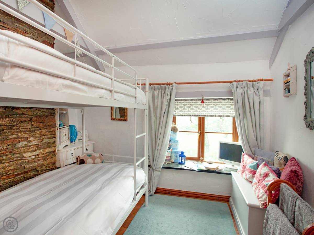 Inside, it's a proper old cottage. You'll want to come in through the back door. The stairs are narrow cottage stairs, made of slate. They're a bit steep. Upstairs there's a double room and a bunk room. Downstairs there's another double with the ensuite.