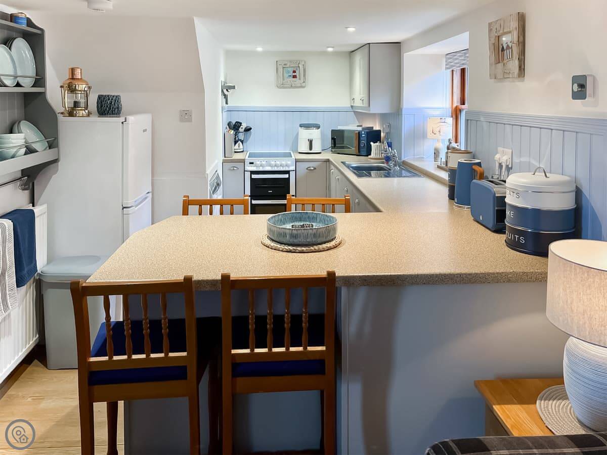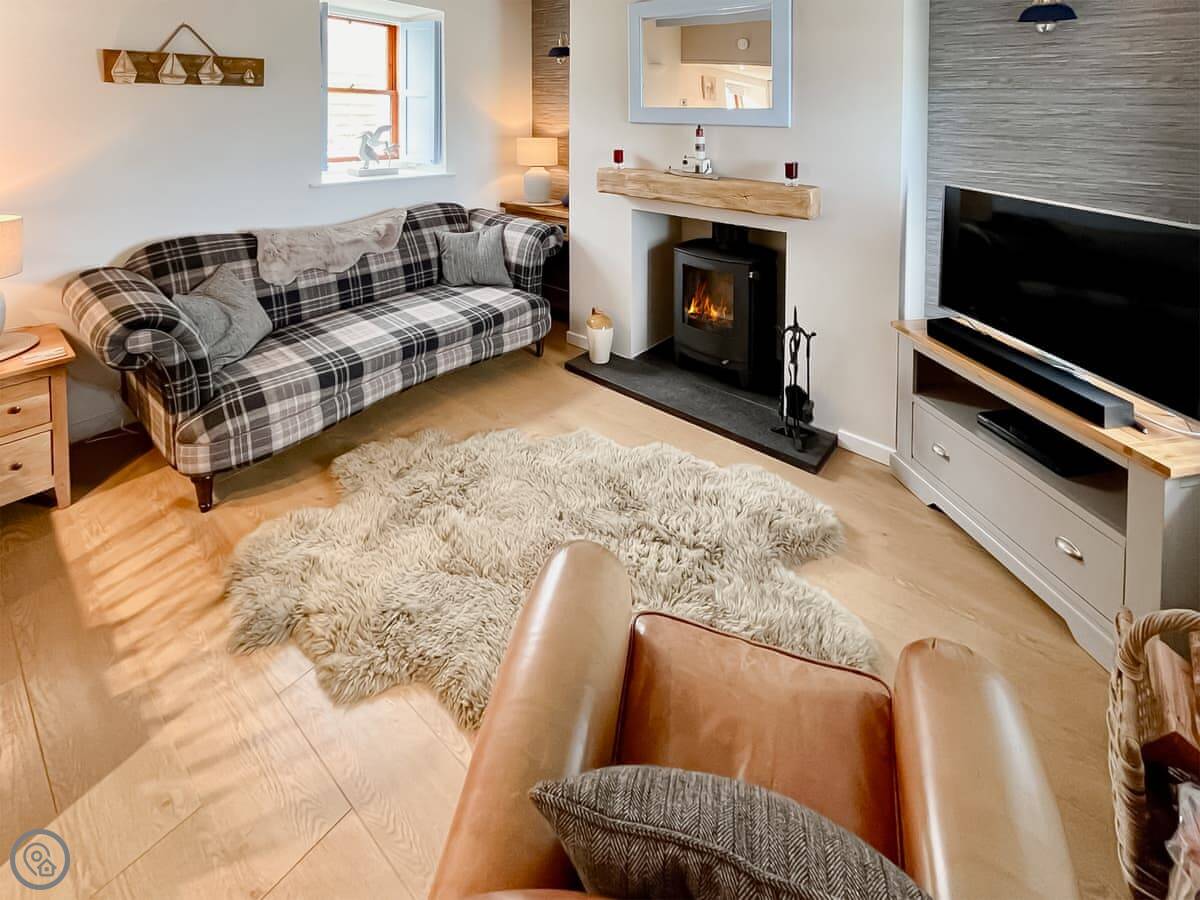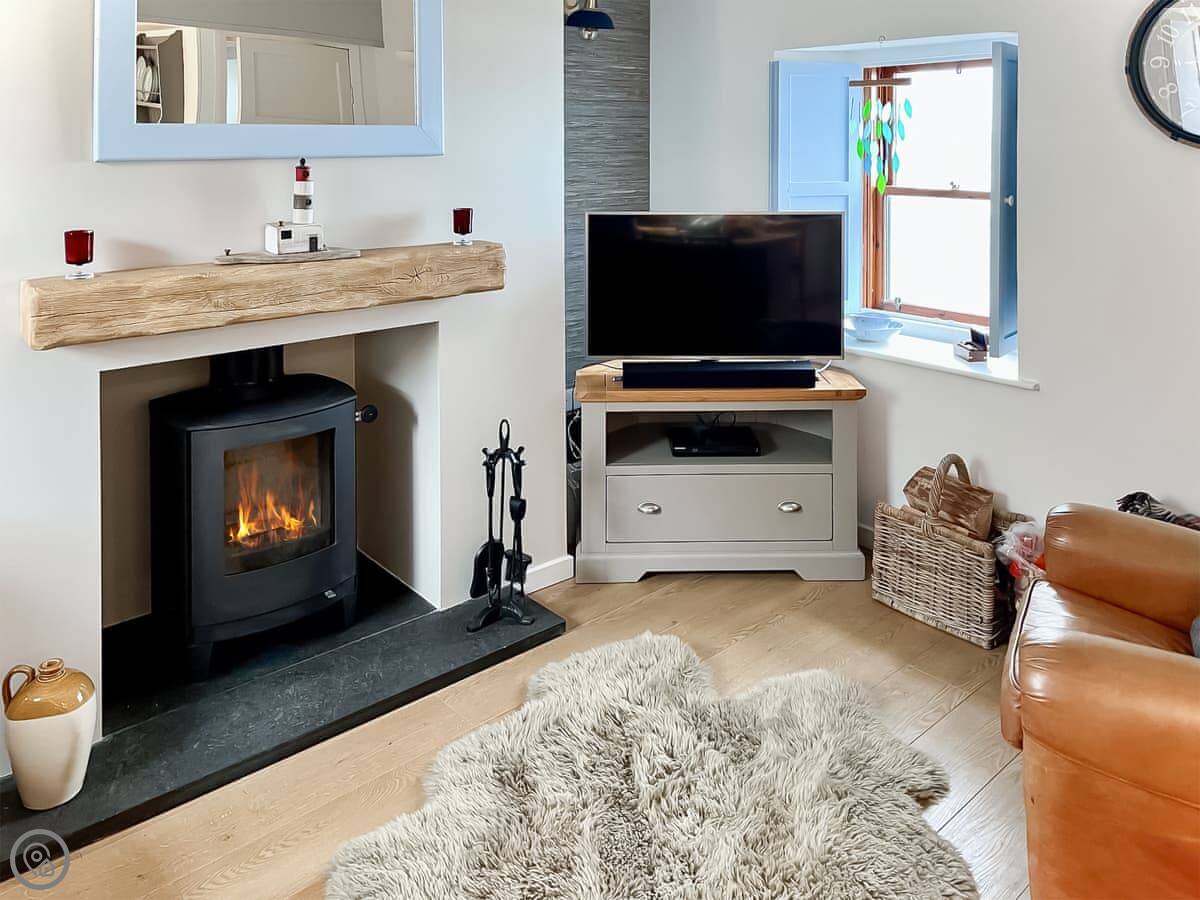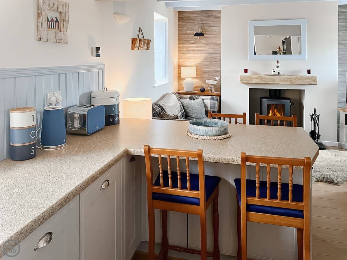 The main room is open plan. Kitchen, dining area, sitting room with a wood burning stove. There's a TV and wi-fi. The patio garden is enclosed, which is handy if you bring a dog.
