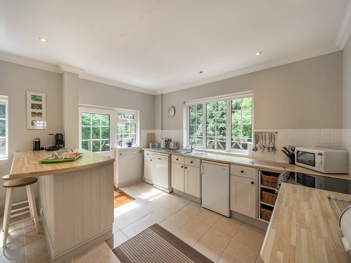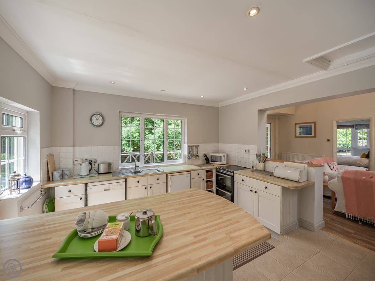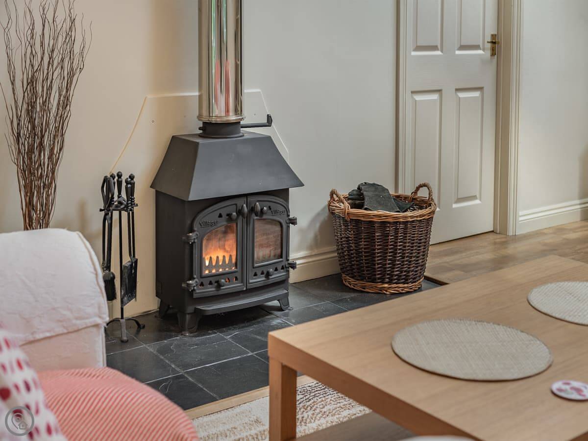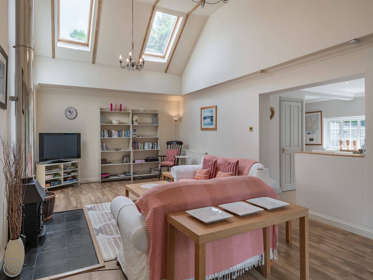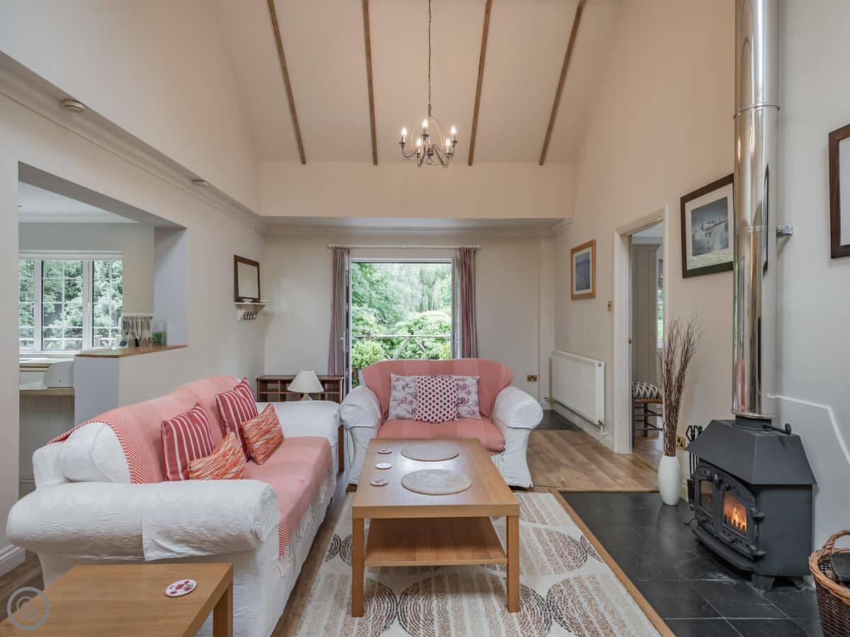 The living area has a wood burner and high ceilings so it feels quite spacious. There's a smart TV and WiFi. The kitchen's well-equipped and there's a utility bit with a washing machine.
