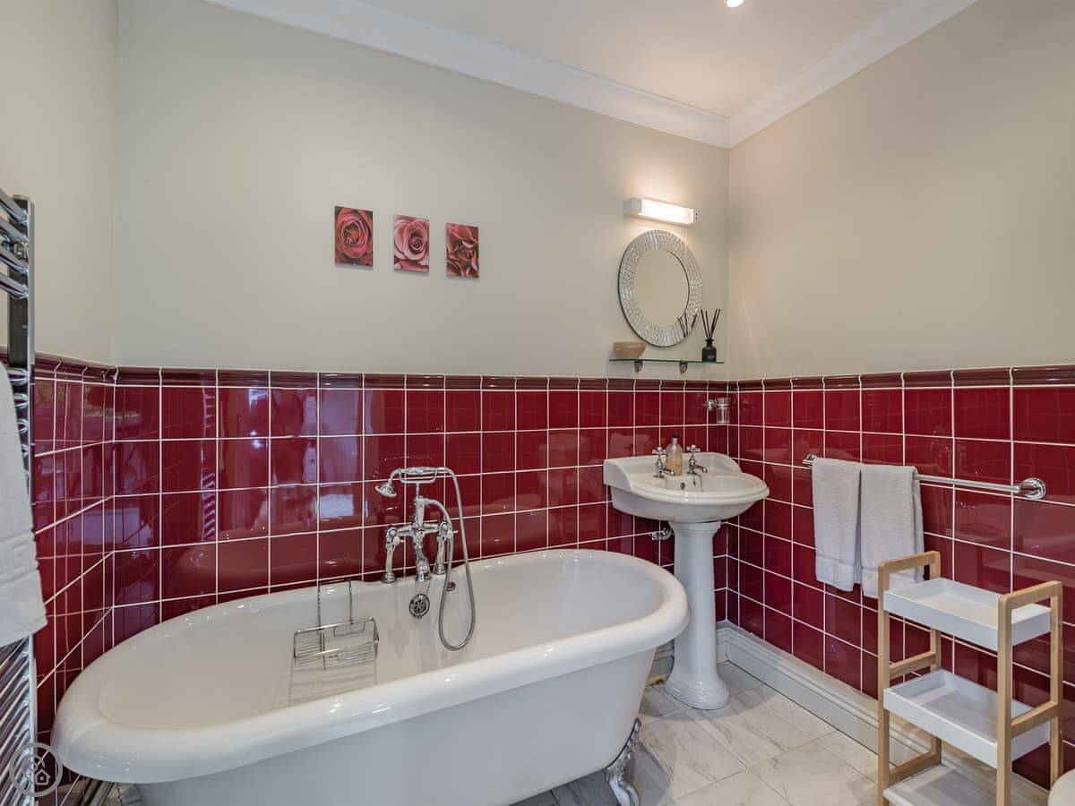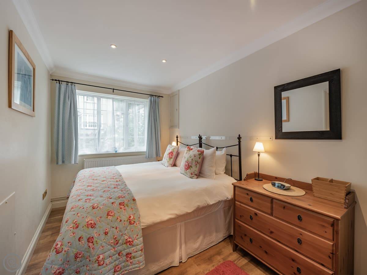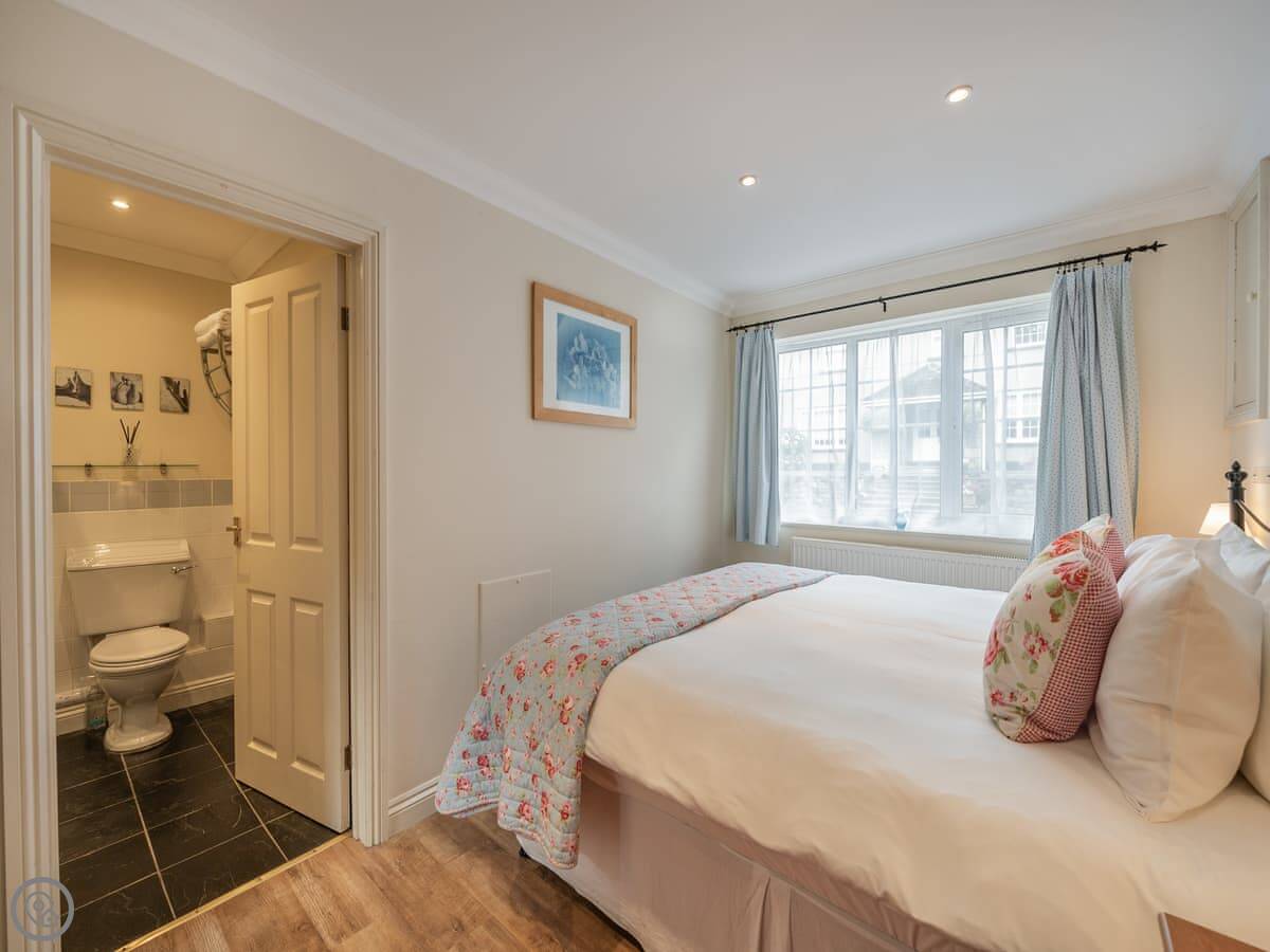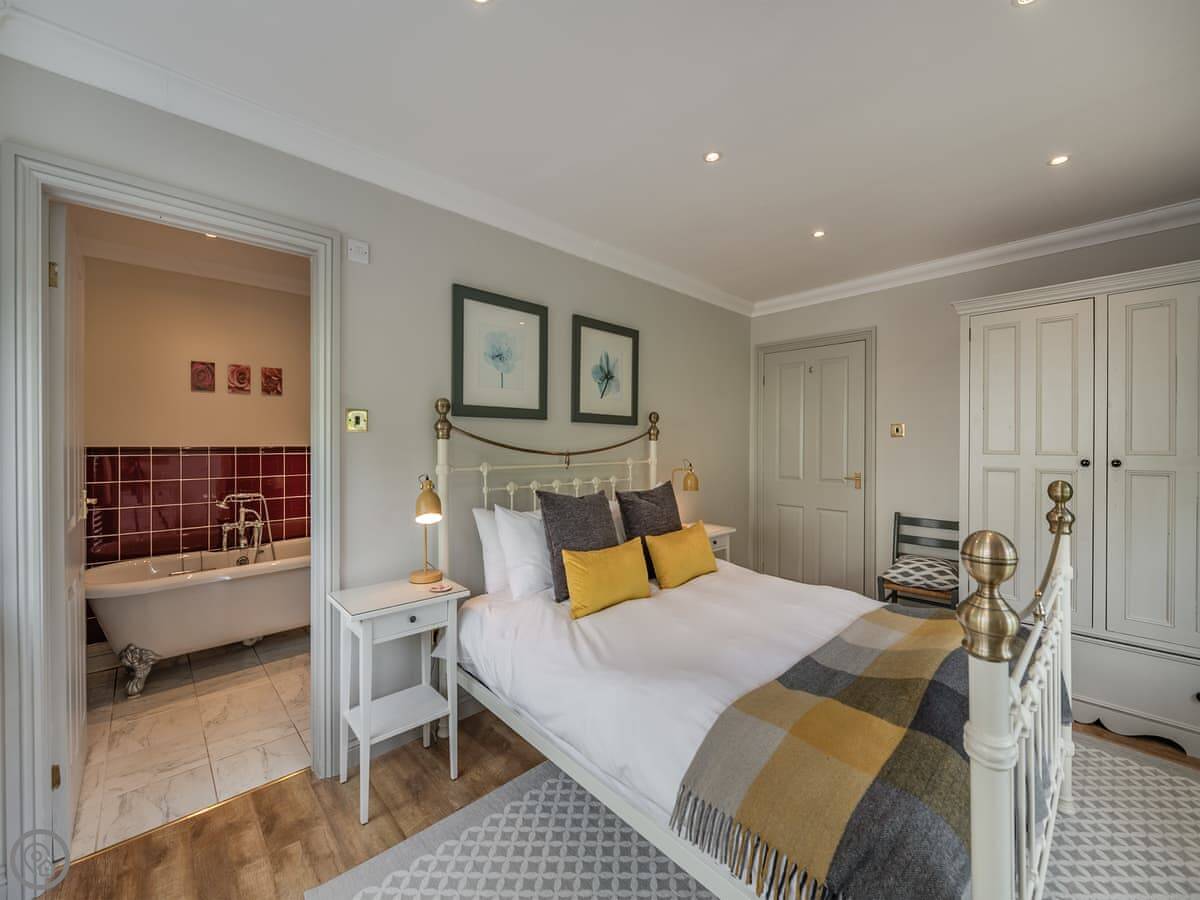 Sleeps four. Two bedrooms, both have their own bathrooms. One has a shower, the other has a roll-top bath with a handheld shower head. The main bed can split into two singles if you ask beforehand.