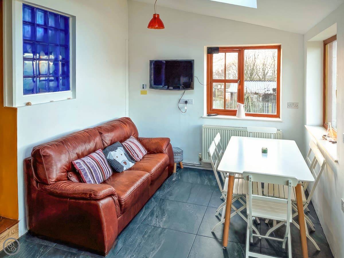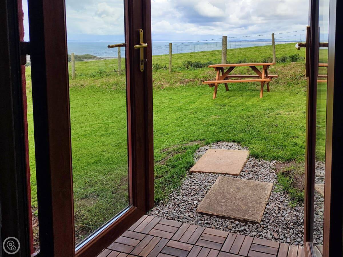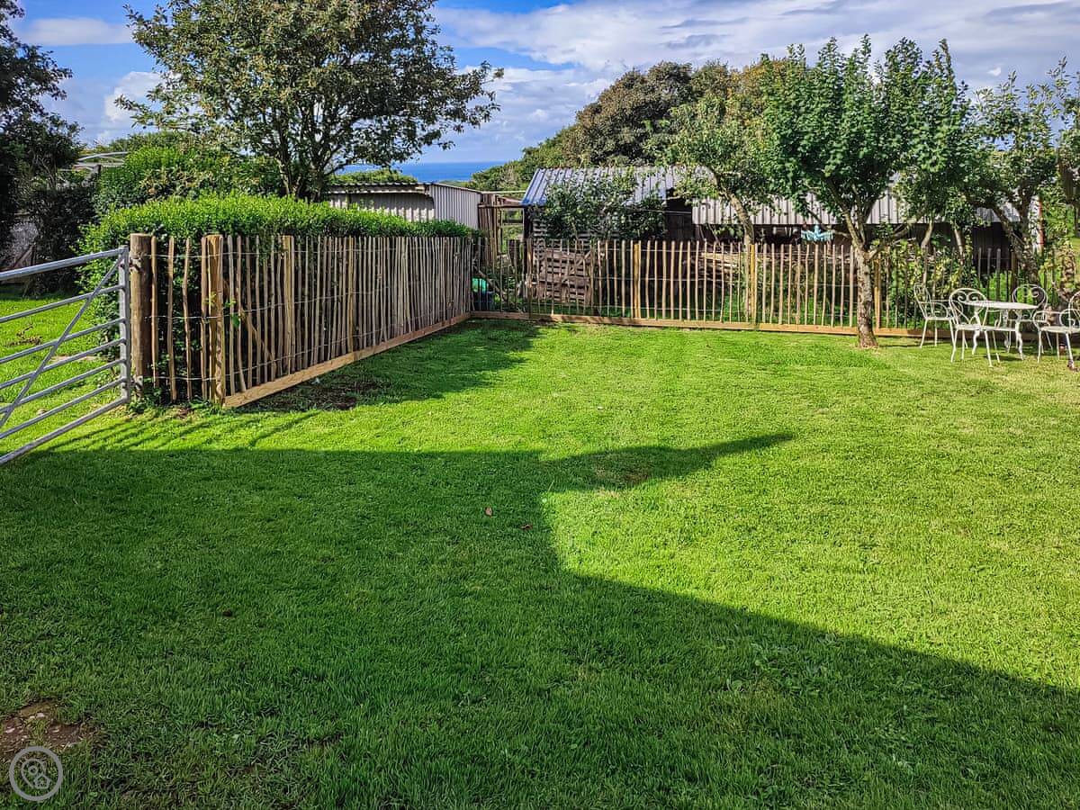 The bathroom is a wet room style with a walk-in shower. There's a kitchen and living area together, with doors out to the garden. The garden is a small lawn where you can sit.