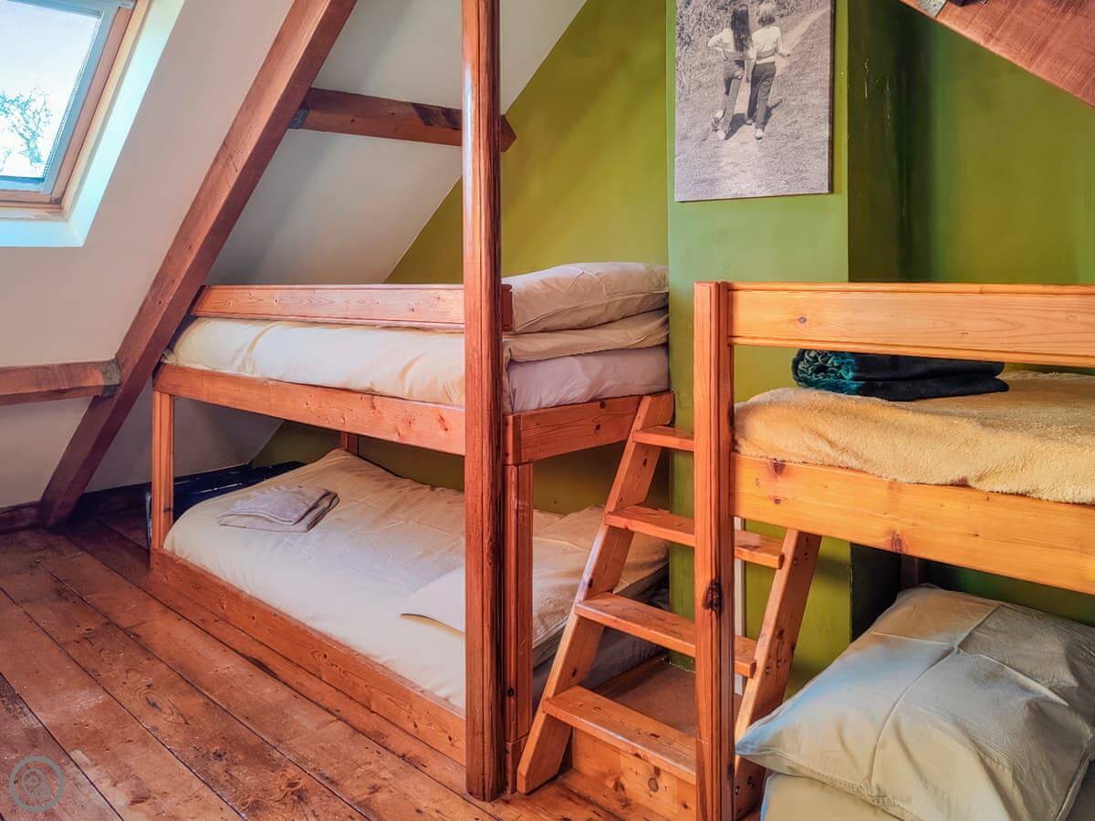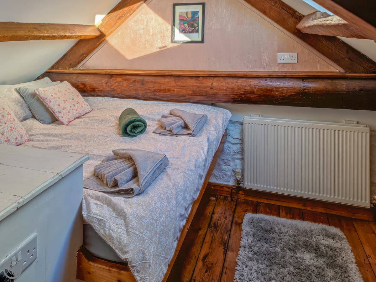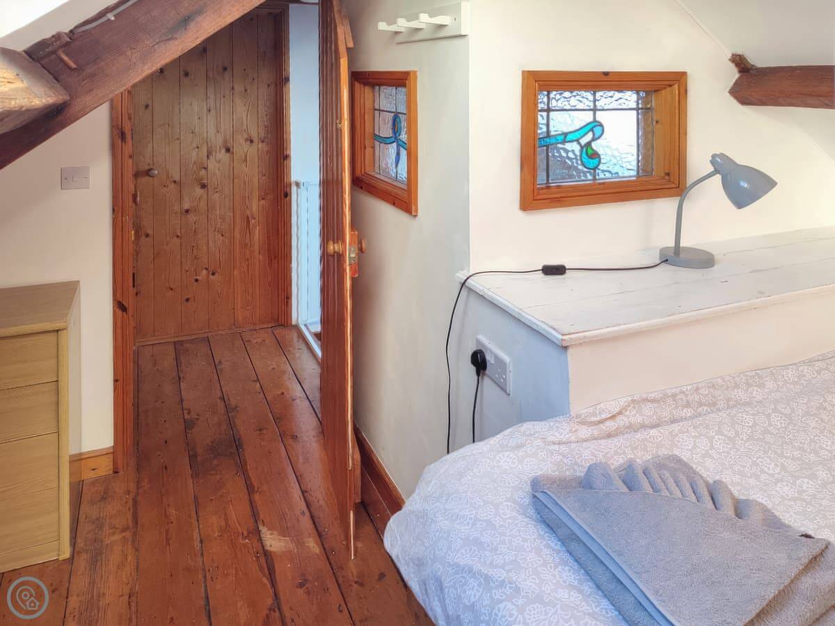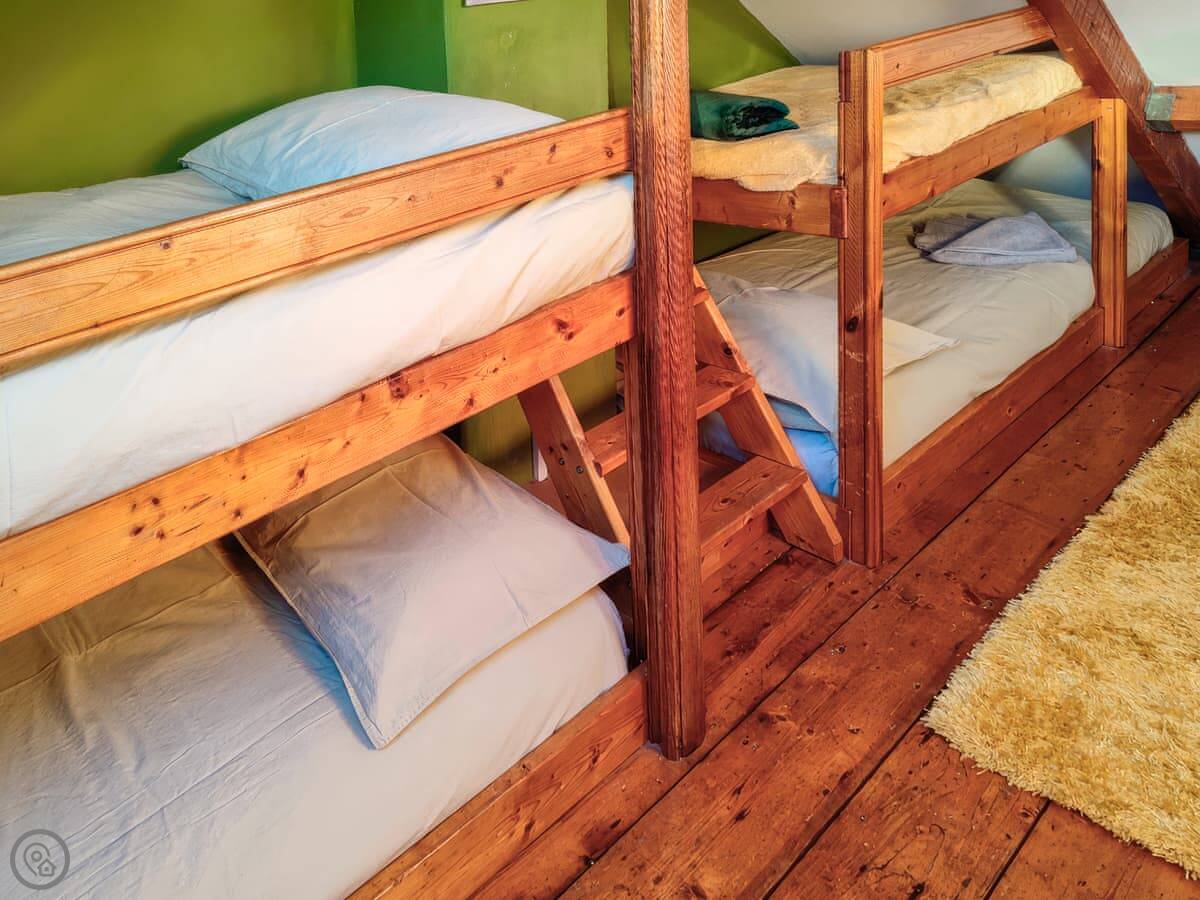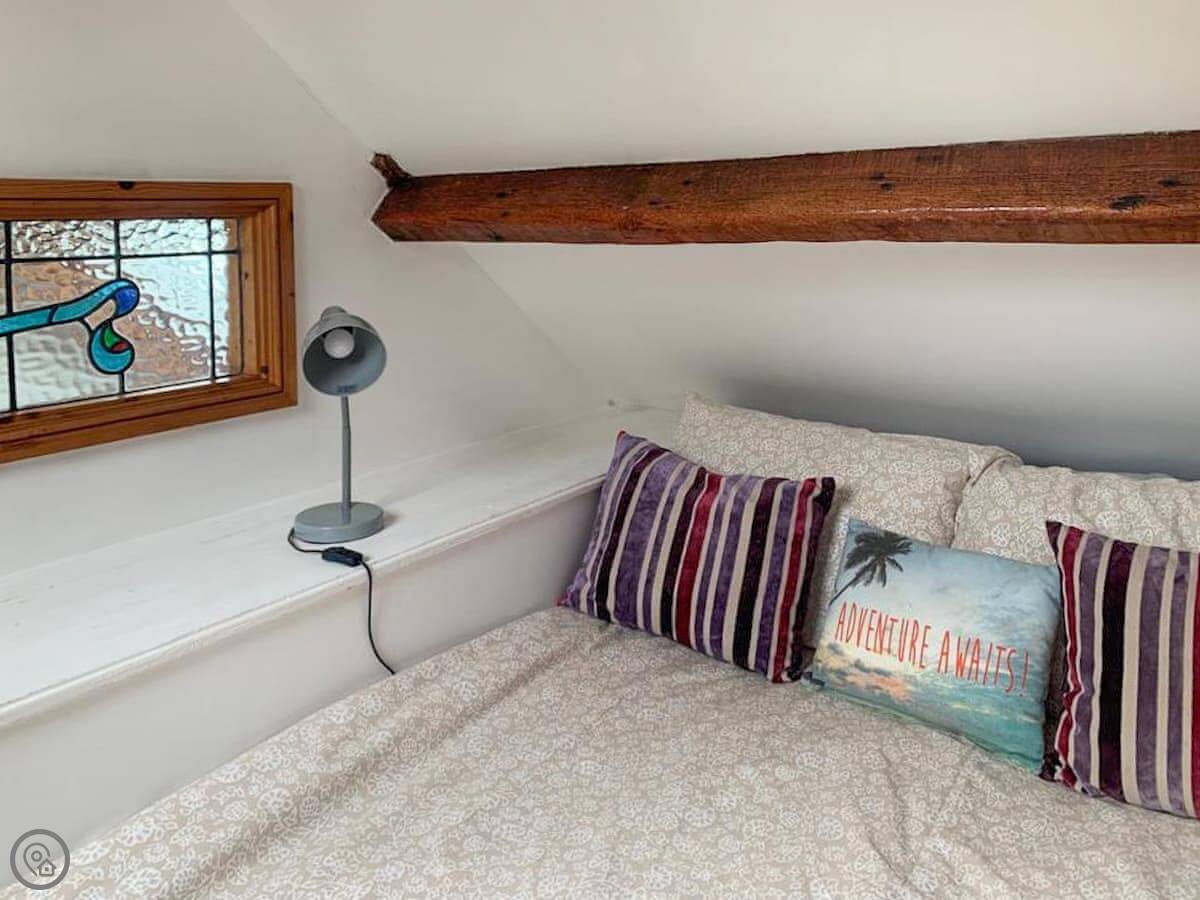 It sleeps four. There are three bedrooms, but one of them is really for children. One double bedroom and a bathroom are on the ground floor. The stairs go up to two more bedrooms. One has a custom double bed built into the eaves. You have to climb into it, but it's cosy once you're in. The other room has three small single beds, also built in. They're only suitable for children.
