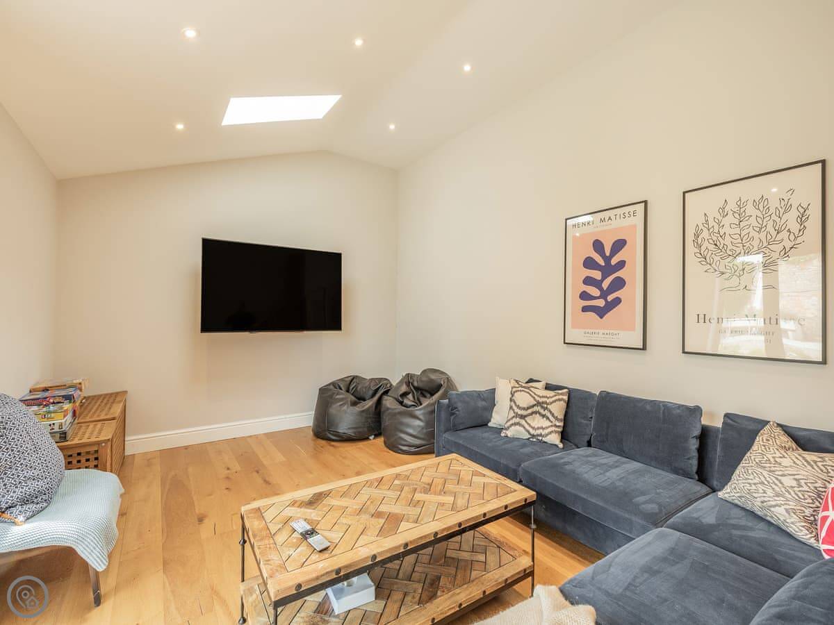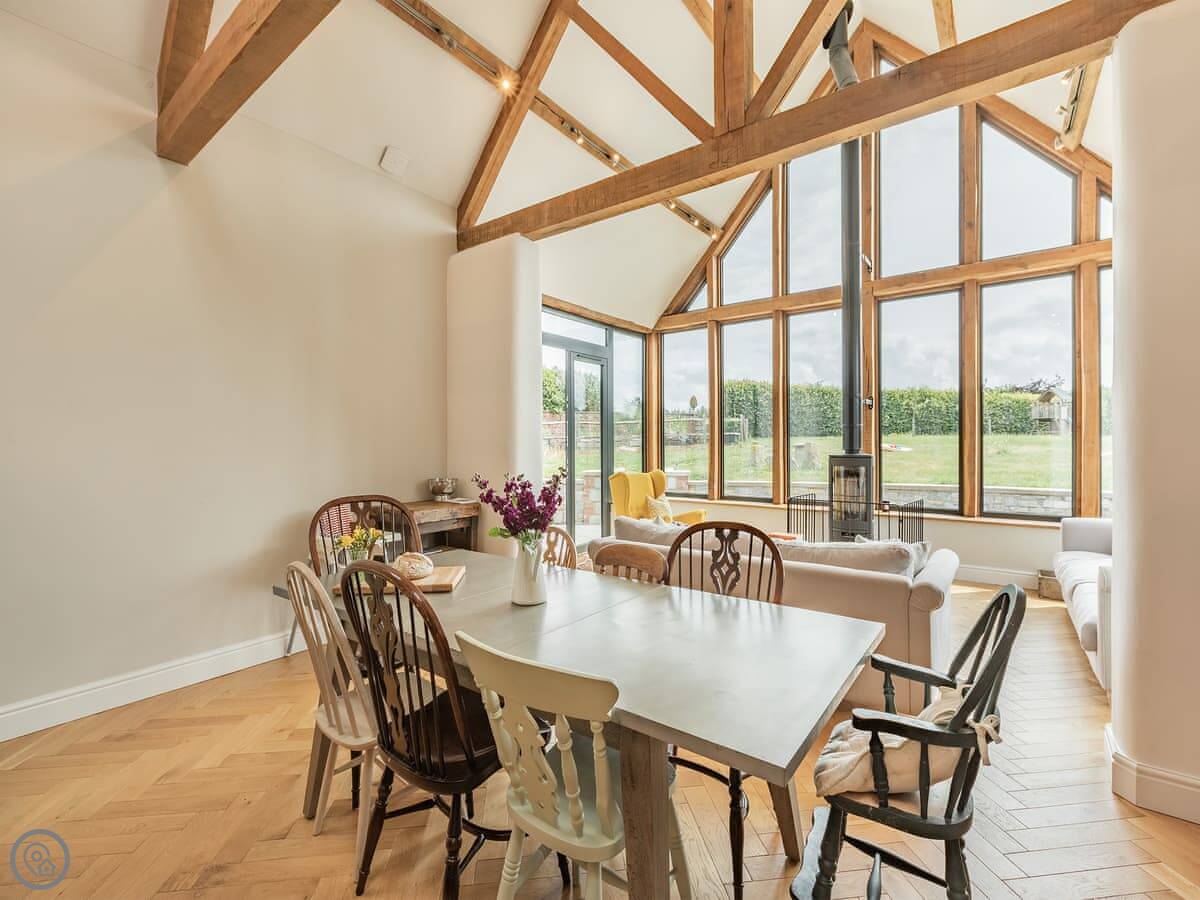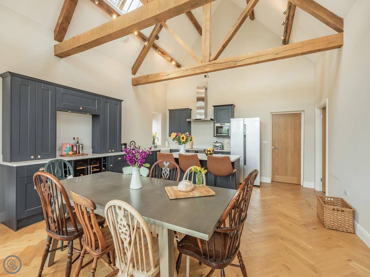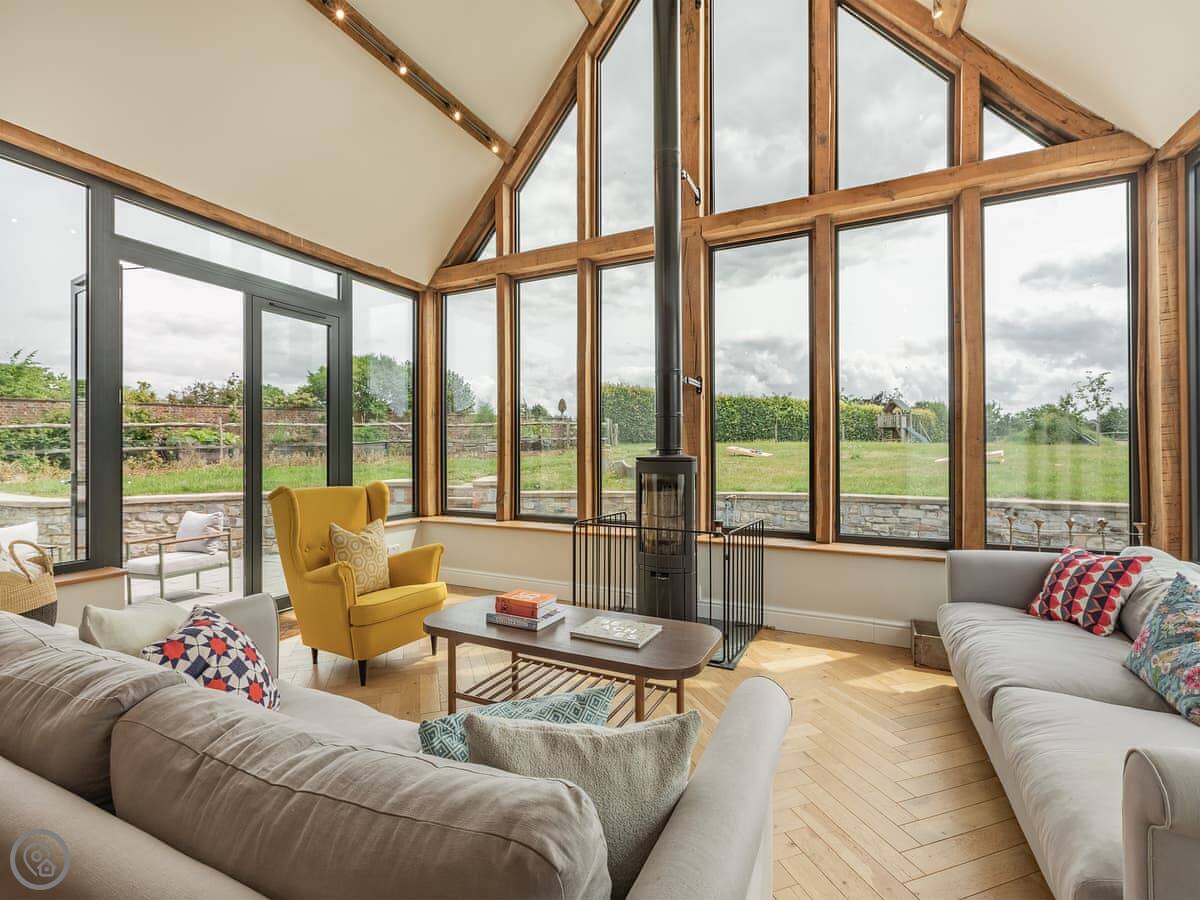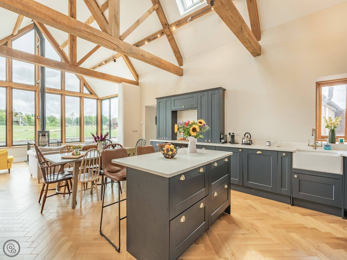 Inside, it's basically one big room downstairs for the kitchen, dining, and living area. The kitchen's got an island, a big fridge freezer, and a couple of wine fridges. There's a wood burner in the living space. Off that, there's another sitting room with a big TV.