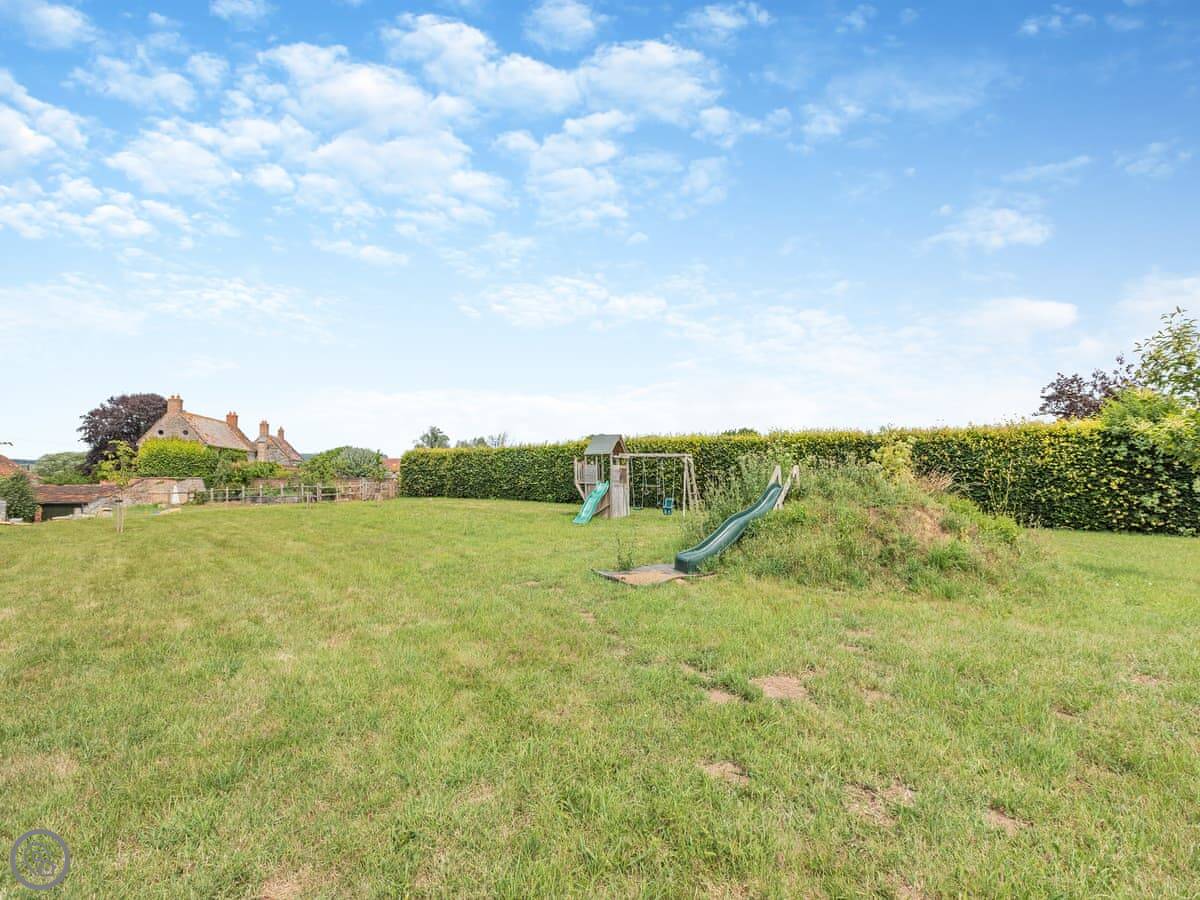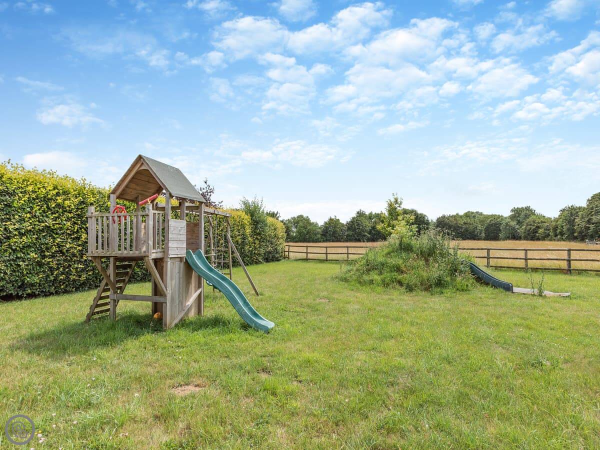 The garden is a good size, fully enclosed. There's a kids' playset and a pétanque court laid out on the lawn.