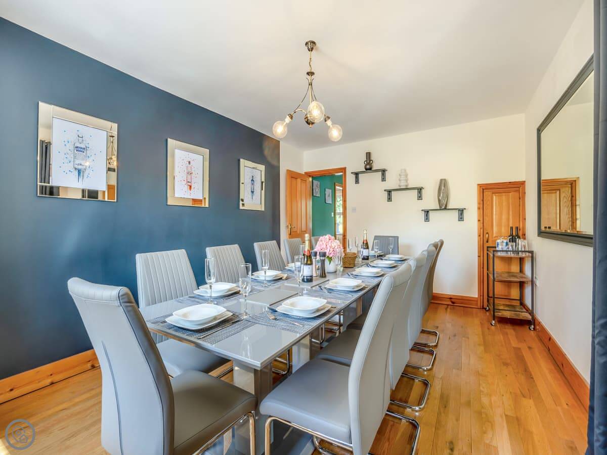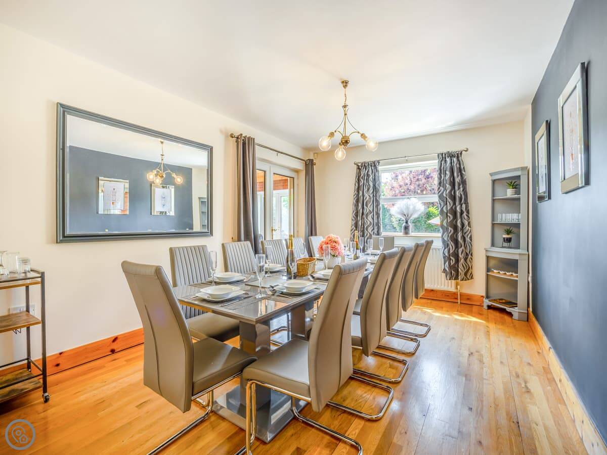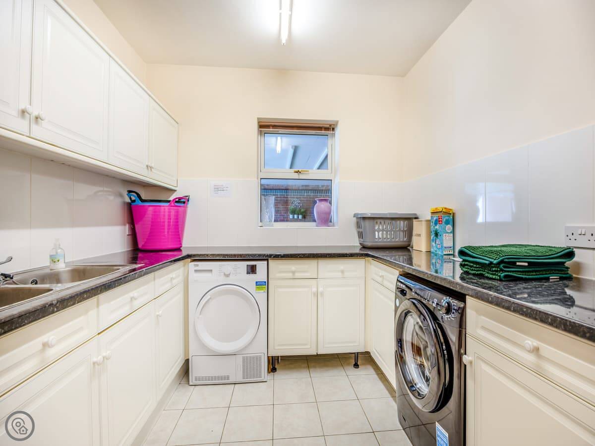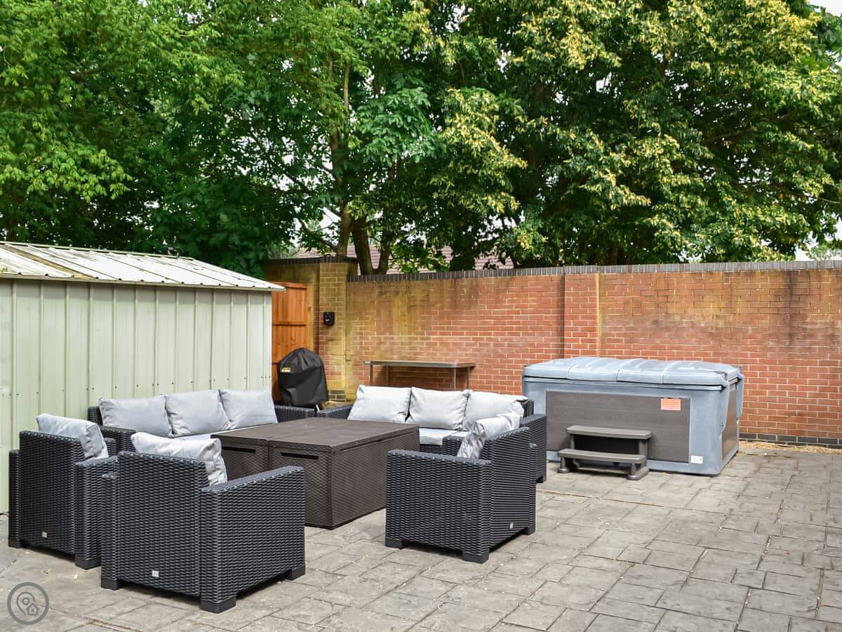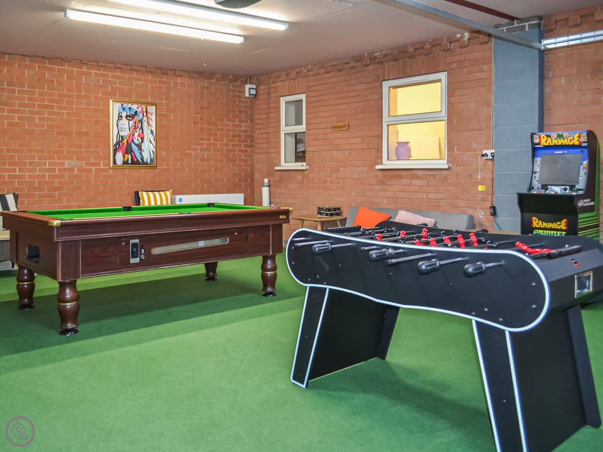 The place has a 5 Star rating. That means it's well kitted out and maintained. You've got two living spaces: a main sitting room with a TV and a games room. The kitchen is a good size for a group, with a dishwasher. There's a utility room off it with a washing machine and tumble dryer. Outside, there's an enclosed garden with a patio area, a BBQ, and a hot tub.
