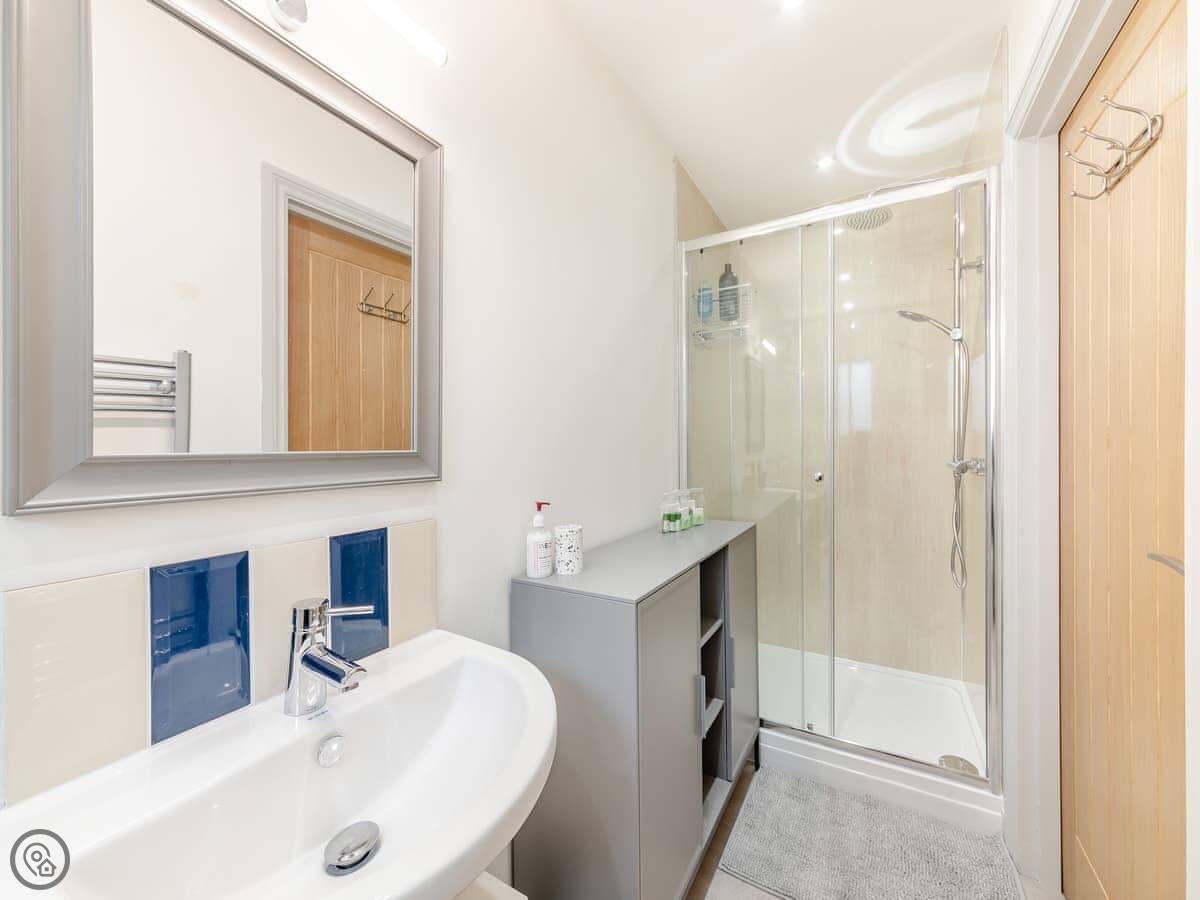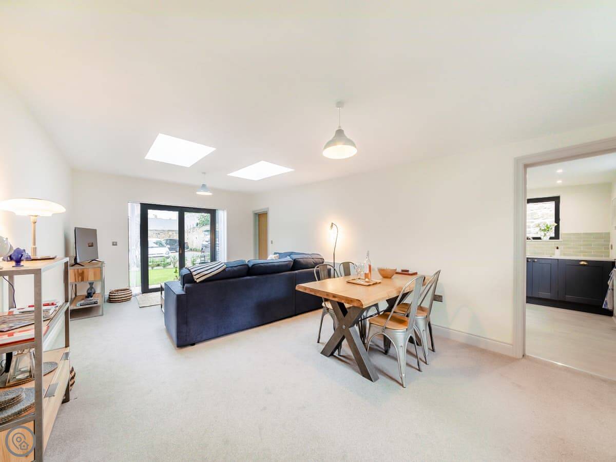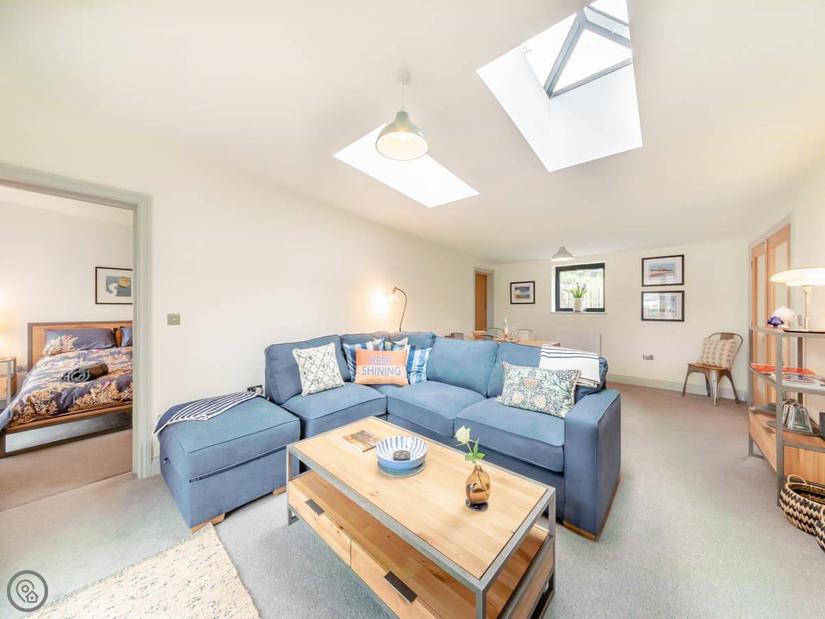 The place sleeps two. The main room is a decent sized lounge with a sofa, dining table, and doors out to the garden. The kitchen is separate. It's got a washing machine and a dishwasher. The bedroom is upstairs, and the bathroom is up there too with a walk-in shower. It's got a 4 Star rating.