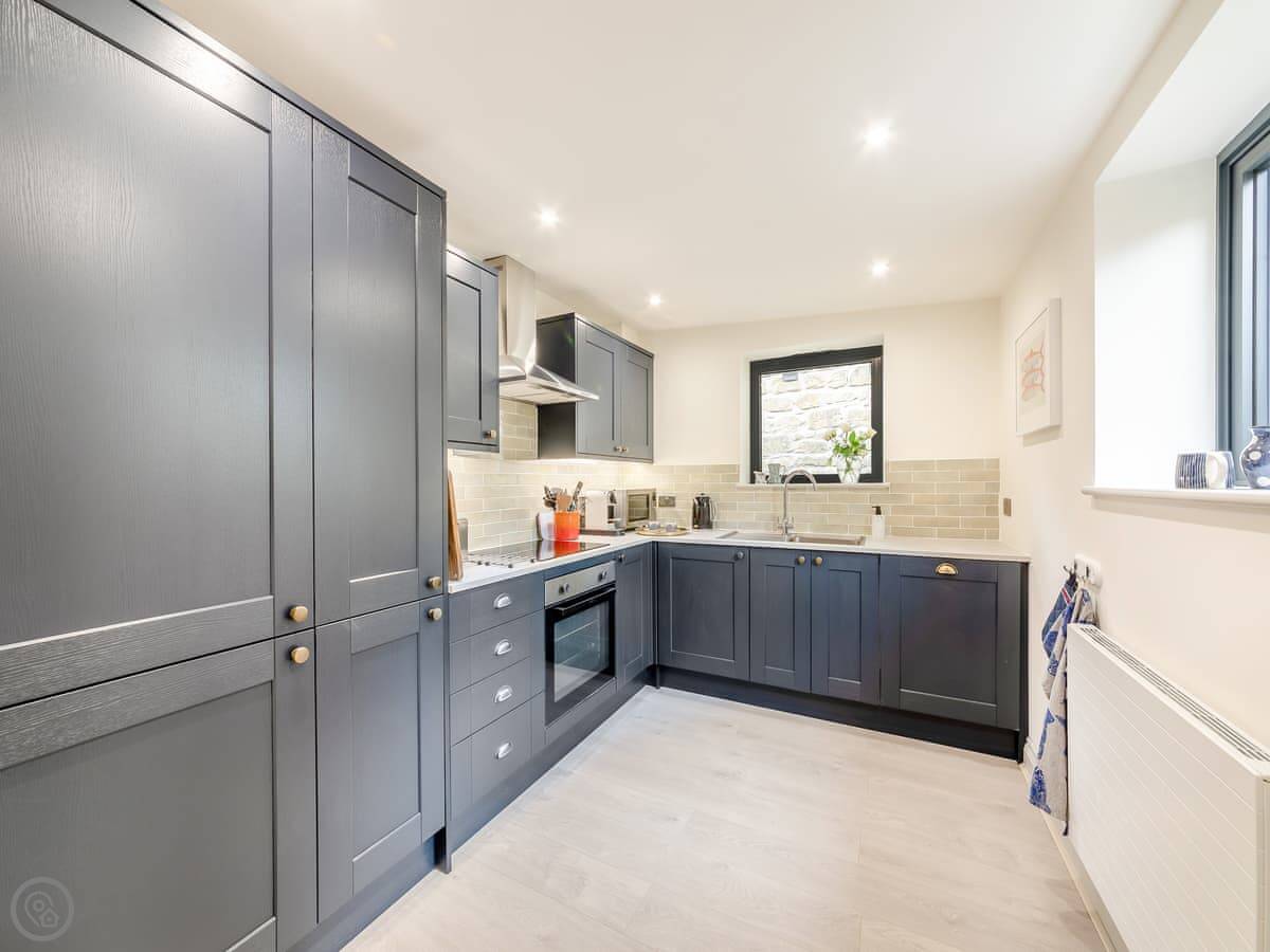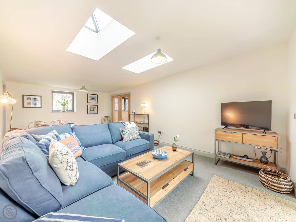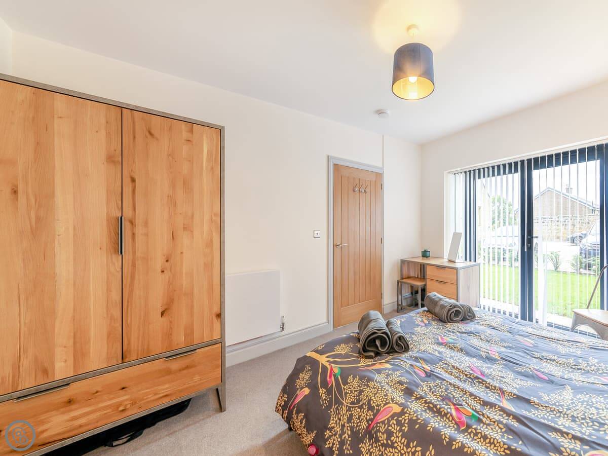 The place sleeps two. The main room is a decent sized lounge with a sofa, dining table, and doors out to the garden. The kitchen is separate. It's got a washing machine and a dishwasher. The bedroom is upstairs, and the bathroom is up there too with a walk-in shower. It's got a 4 Star rating.