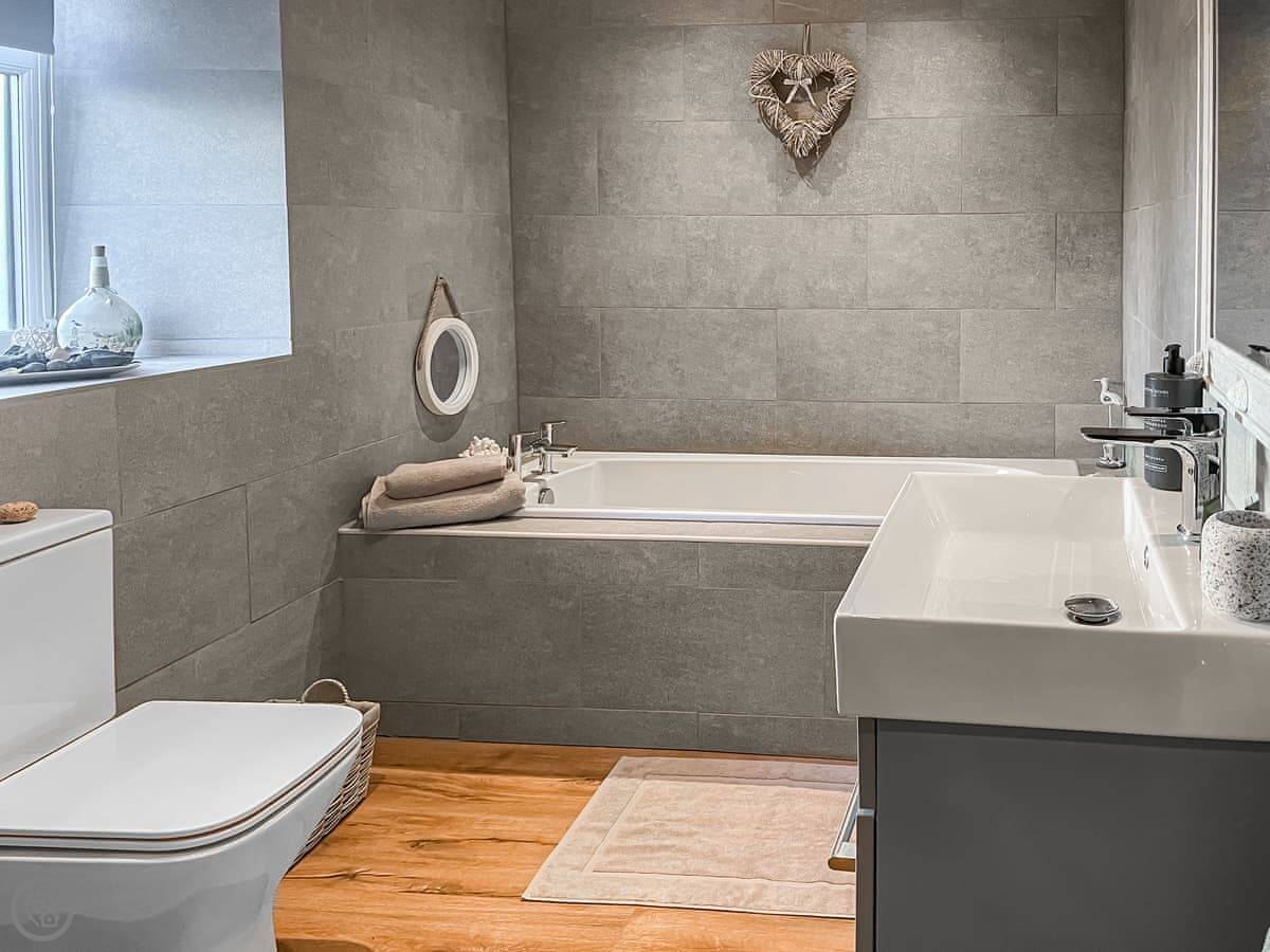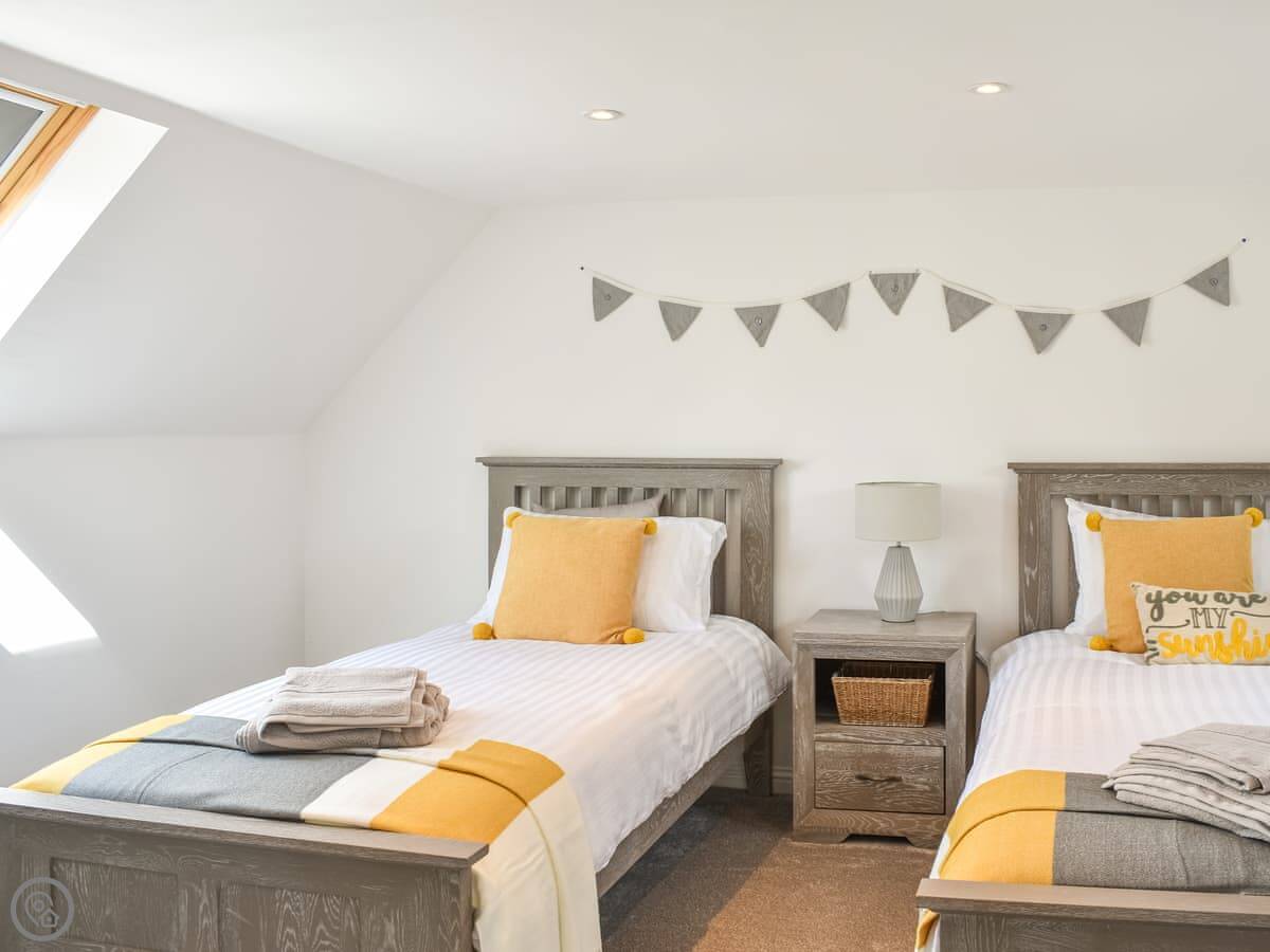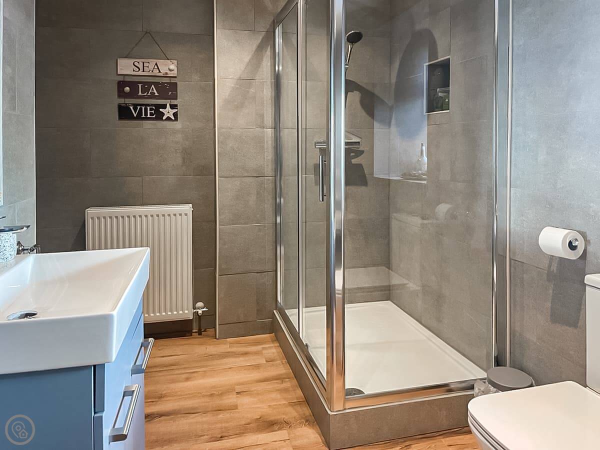 It sleeps four. Two bedrooms, one double and one with two singles. One bathroom with a bath and a separate walk-in shower. The rating is 5 Star, which means it's well-equipped and comfortable.
