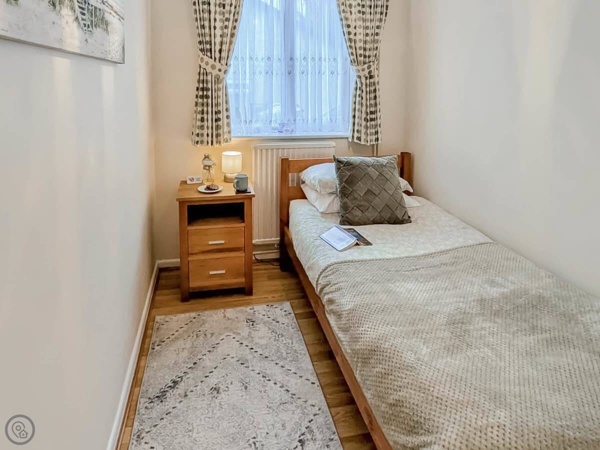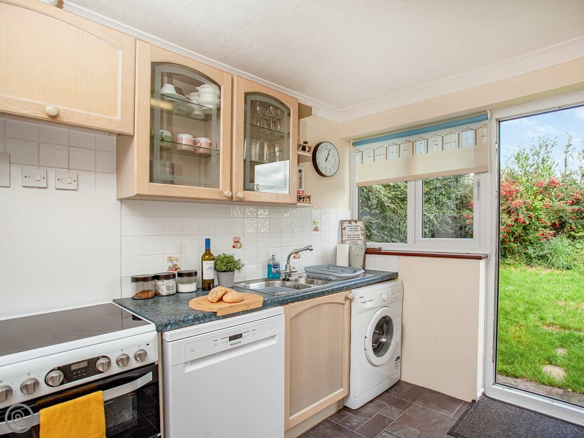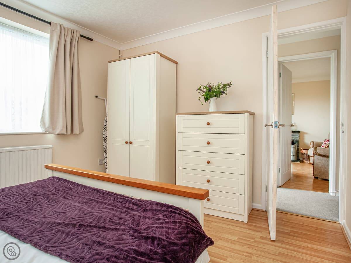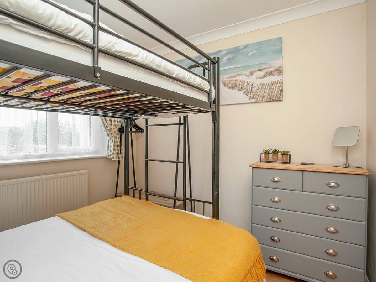 The main bedroom has a king size bed. The second room has a bunk setup with a double bed on the bottom and a single on top. The third room is a single. The living room has patio doors out to the front garden, which is enclosed. There's a woodburning stove. The kitchen has a dishwasher and washing machine. Bedding and towels are included. There's parking on the drive, and an electric vehicle charger.