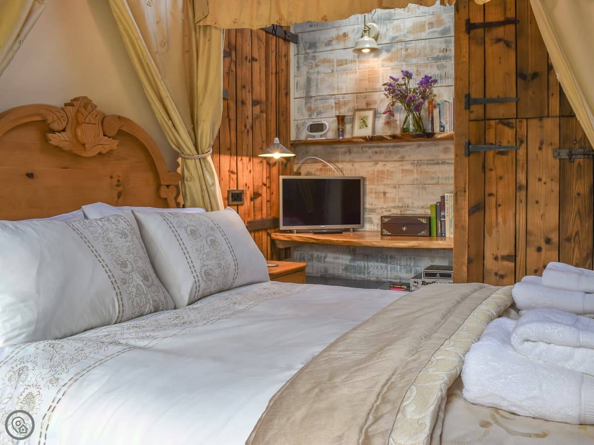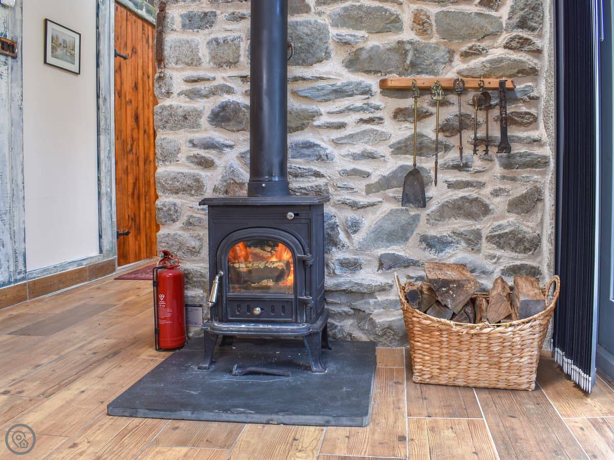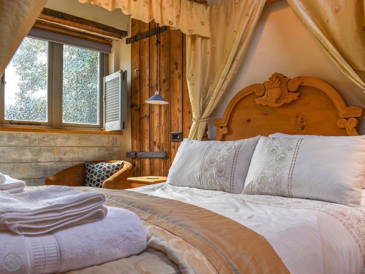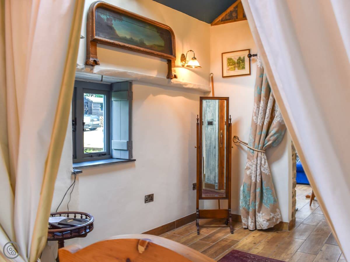 It sleeps two. One bedroom with a four poster bed and an en-suite shower. It's got a 4 Star rating. The place is full of stonework and beams. There's a wood burner in the main room and skylights that make it bright. The stairs are more like a step ladder, really. They're fine if you're steady on your feet.