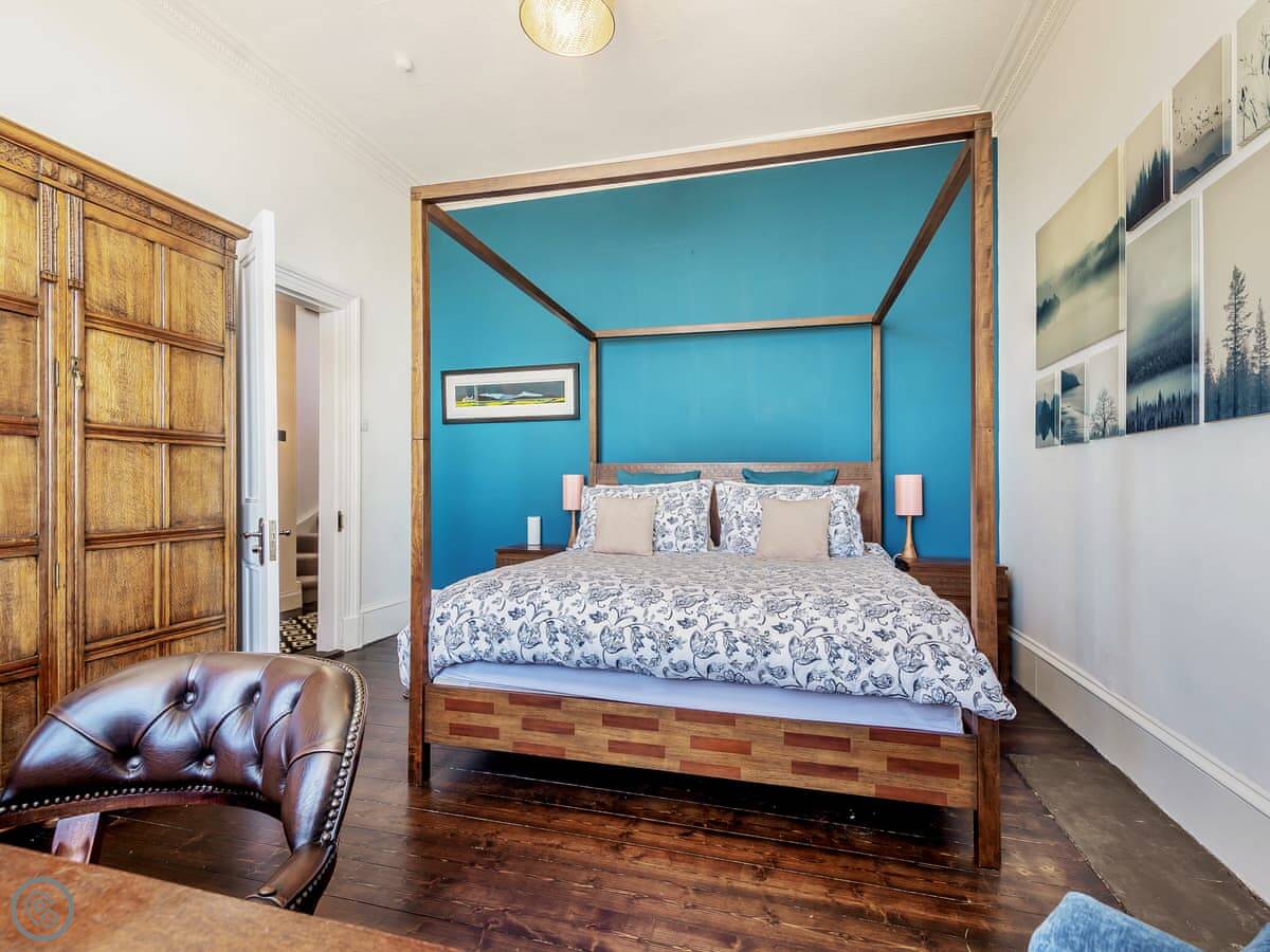It's got four bedrooms, three of them are kingsize. There are three bathrooms, one is an en-suite. Downstairs there's a kitchen, a living room, and a bathroom. The garden has a separate chalet. It has its own kitchenette, a kingsize bed, a sofa bed, and a walk-in shower. It's useful if some of your group want a bit of space.