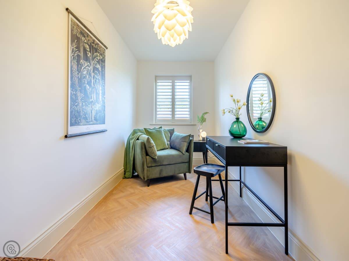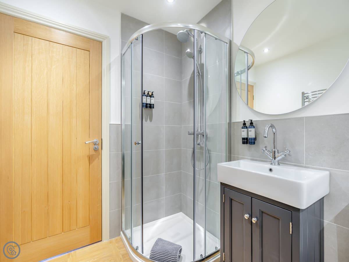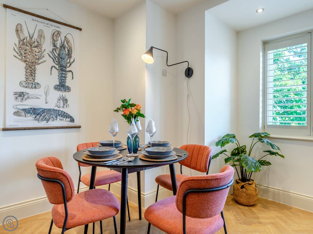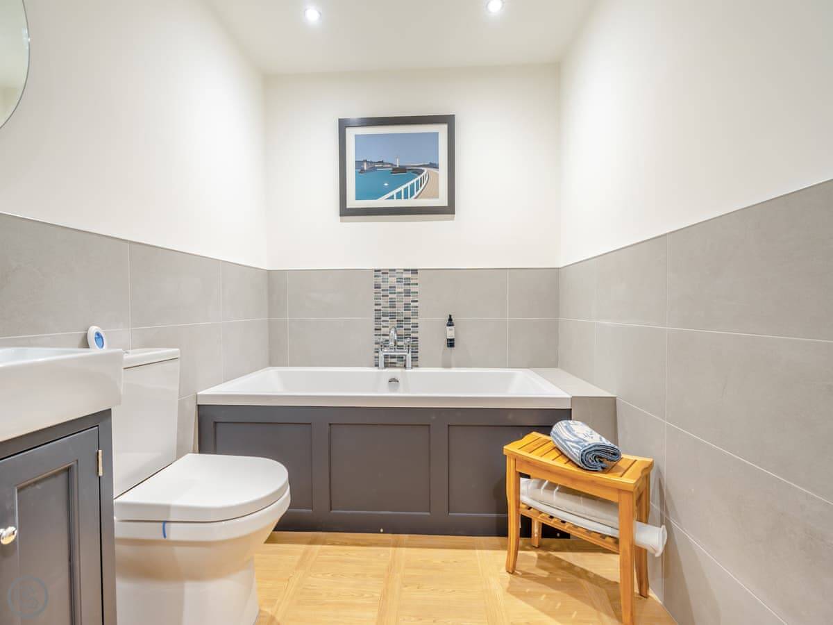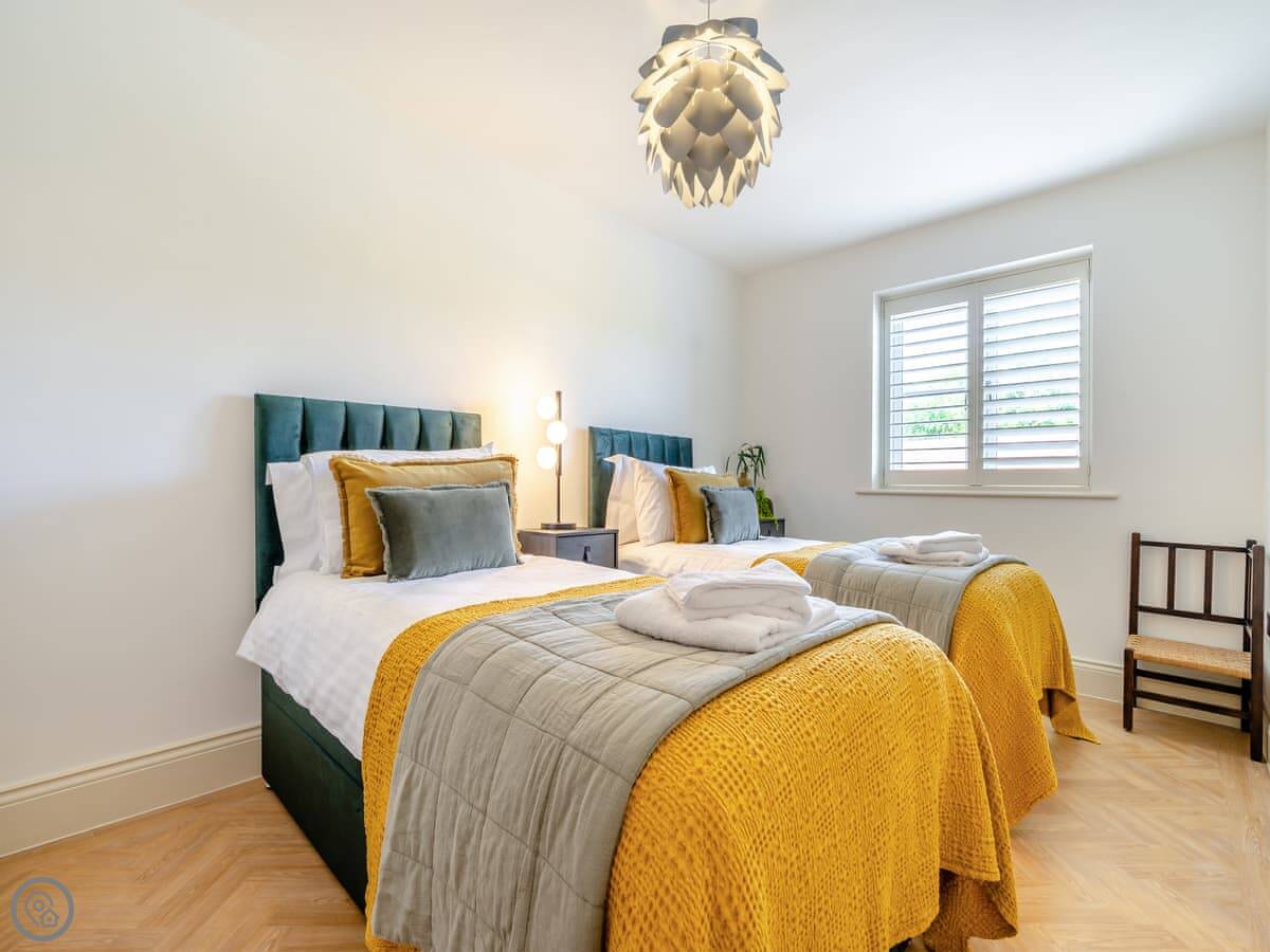 It sleeps four. Two bedrooms, both with double beds. Two bathrooms, one is an en-suite shower room. It's a 5 Star place, which means it's done up to a very high standard. Everything's new and it feels quite smart. The stairs up to the apartment are a standard flight, not steep.