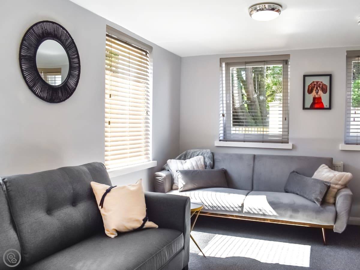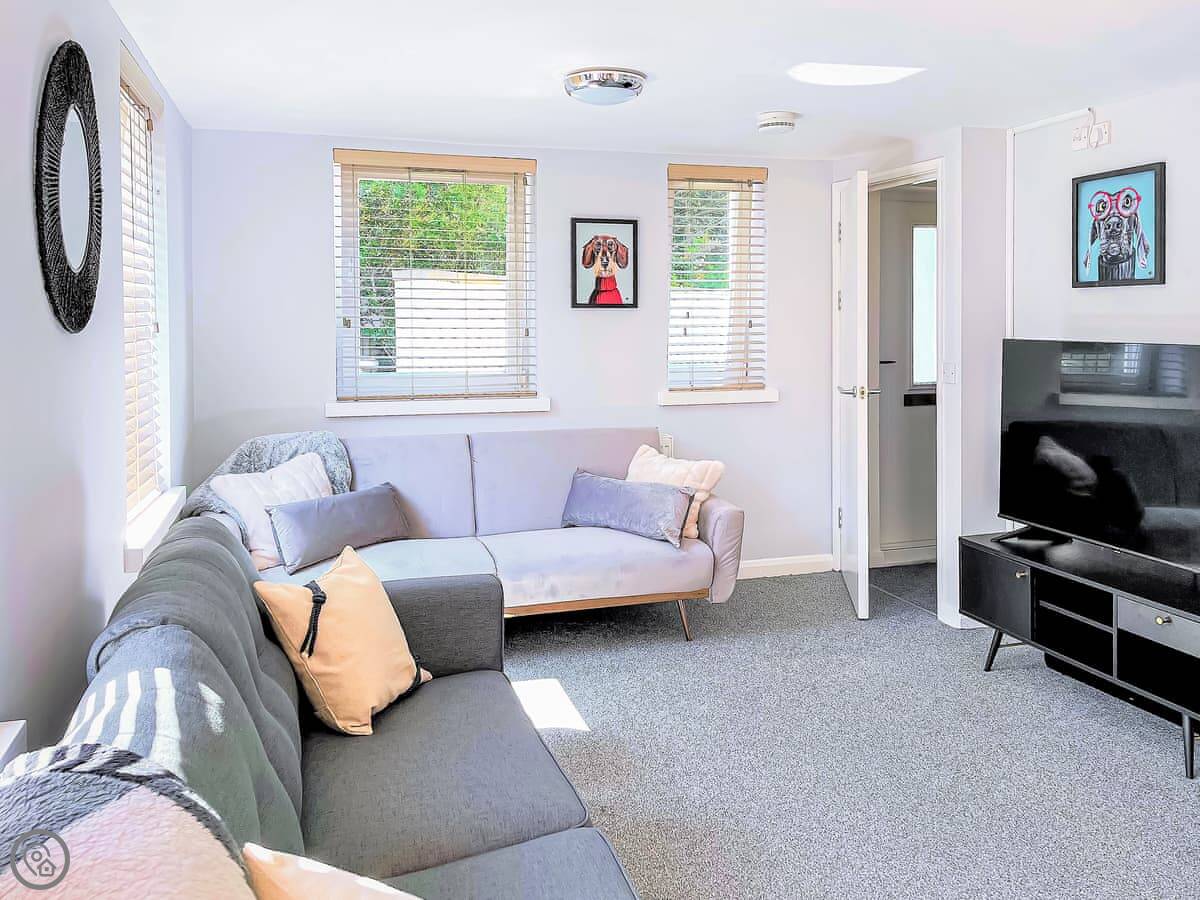 The lounge has two sofas and an armchair. One of the sofas converts to a bed if you need it. There’s a TV and WiFi.