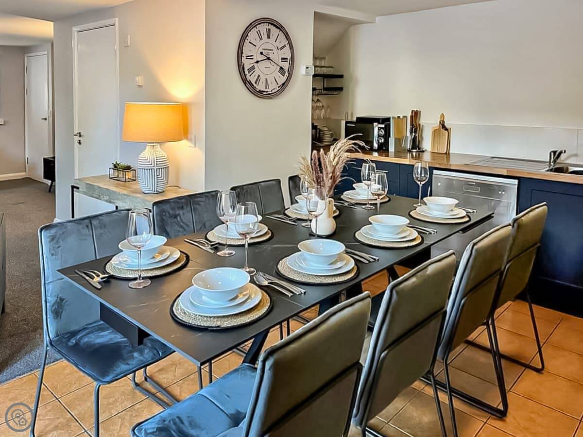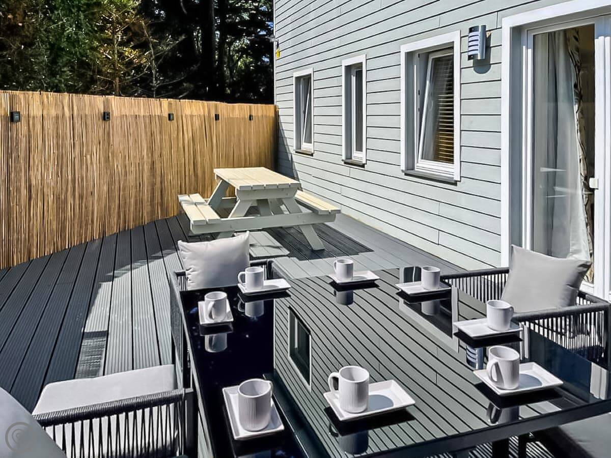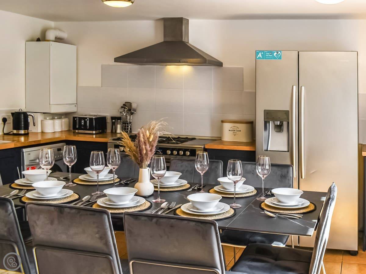Inside, the kitchen has what you'd need: a double oven, big fridge-freezer, dishwasher and washing machine. The dining table seats eight. Doors lead out to your own enclosed patio with seating.