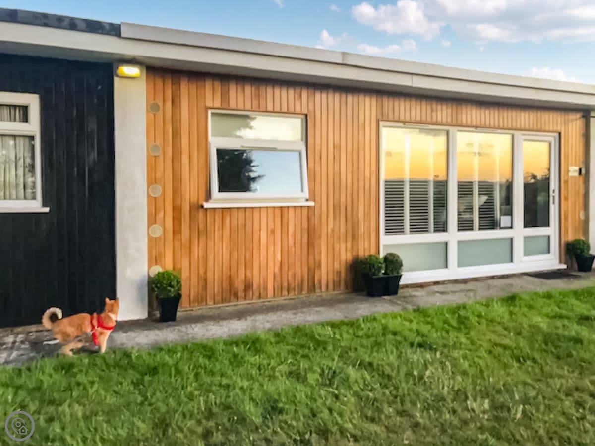 This is Chalet Peace. It's a bungalow on the Norton Park Holiday Village site near Dartmouth. The site is family-run and quiet. The chalet sits at the edge of it, so you look out over fields and hills from the front. It's very peaceful.