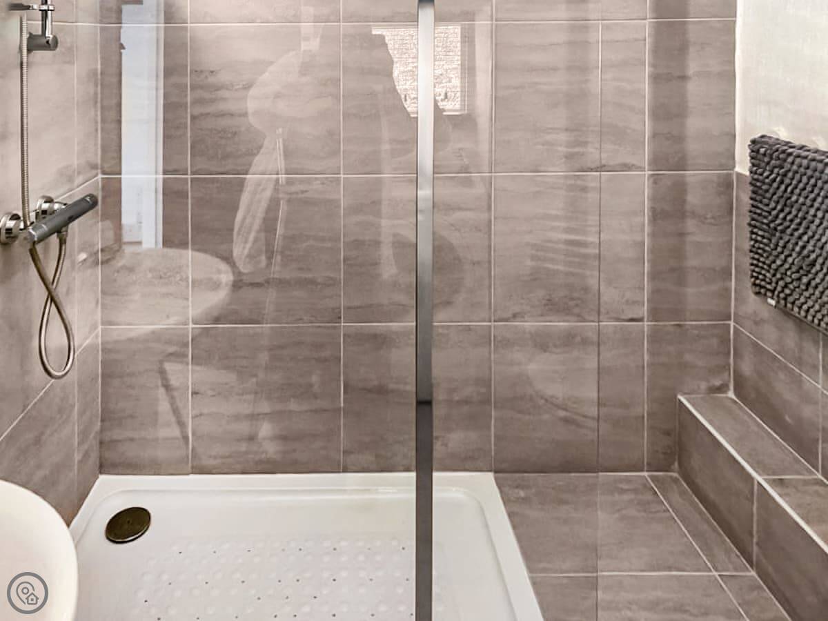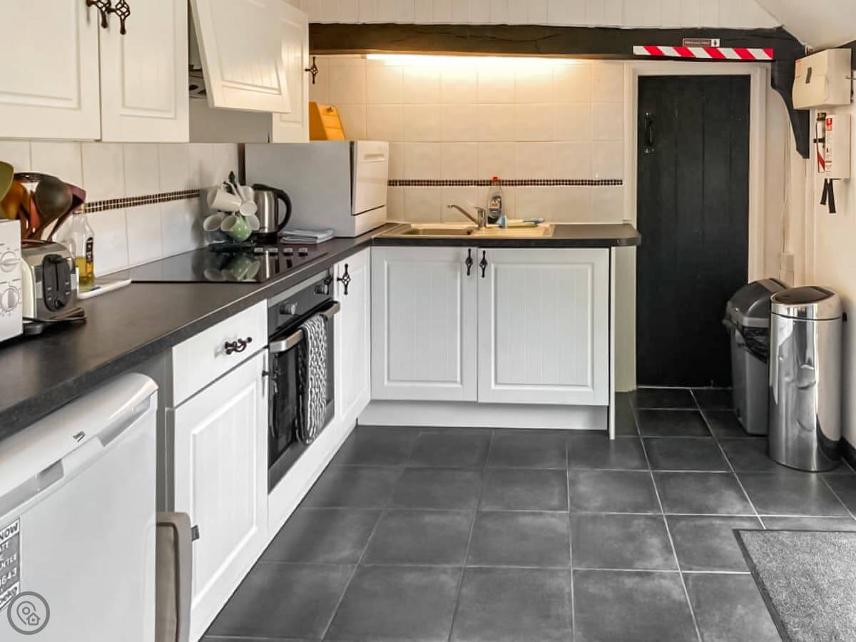 The bathroom has a shower cubicle. There's a washing machine and a dishwasher. Parking is right outside. The heating and hot water are electric, and there's an electric stove that looks like a wood burner if you want some atmosphere.