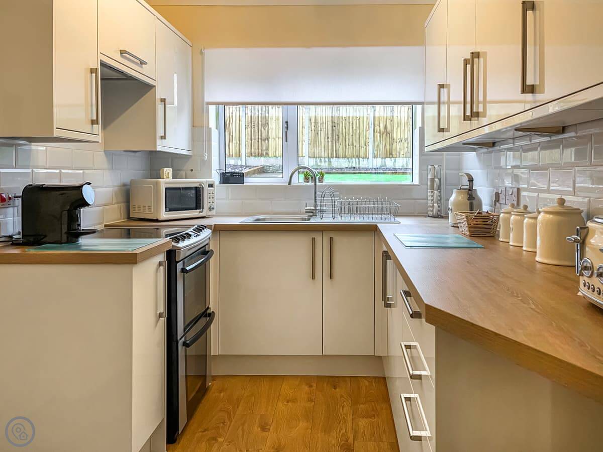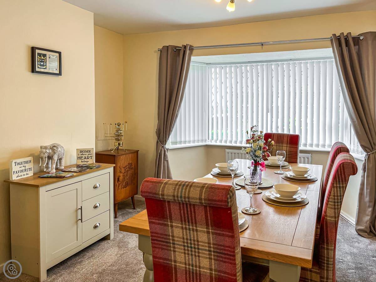 Downstairs is open plan. The kitchen has what you need. The dining table seats everyone. The sitting area has a smart TV and sofas. There's a utility room with a washing machine and space to store a couple of bikes.