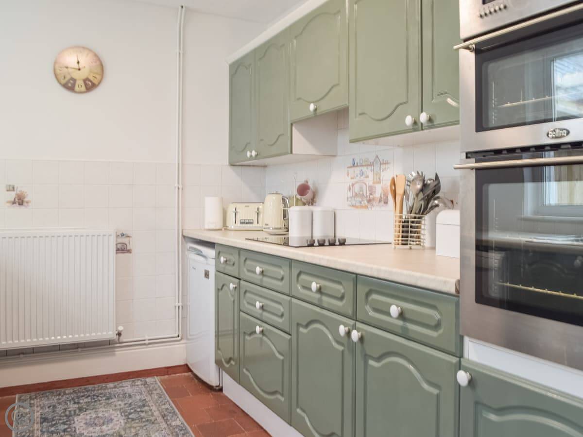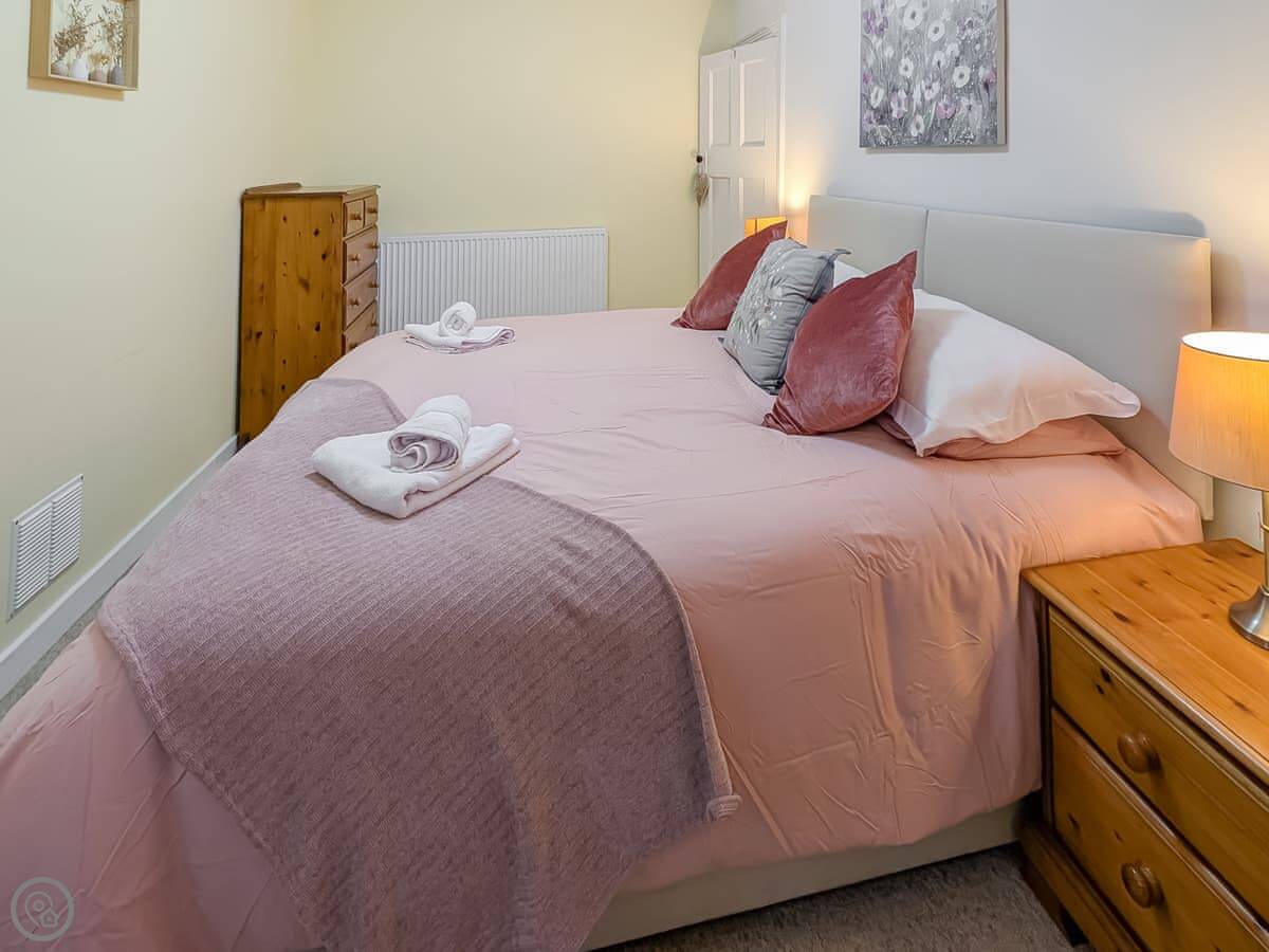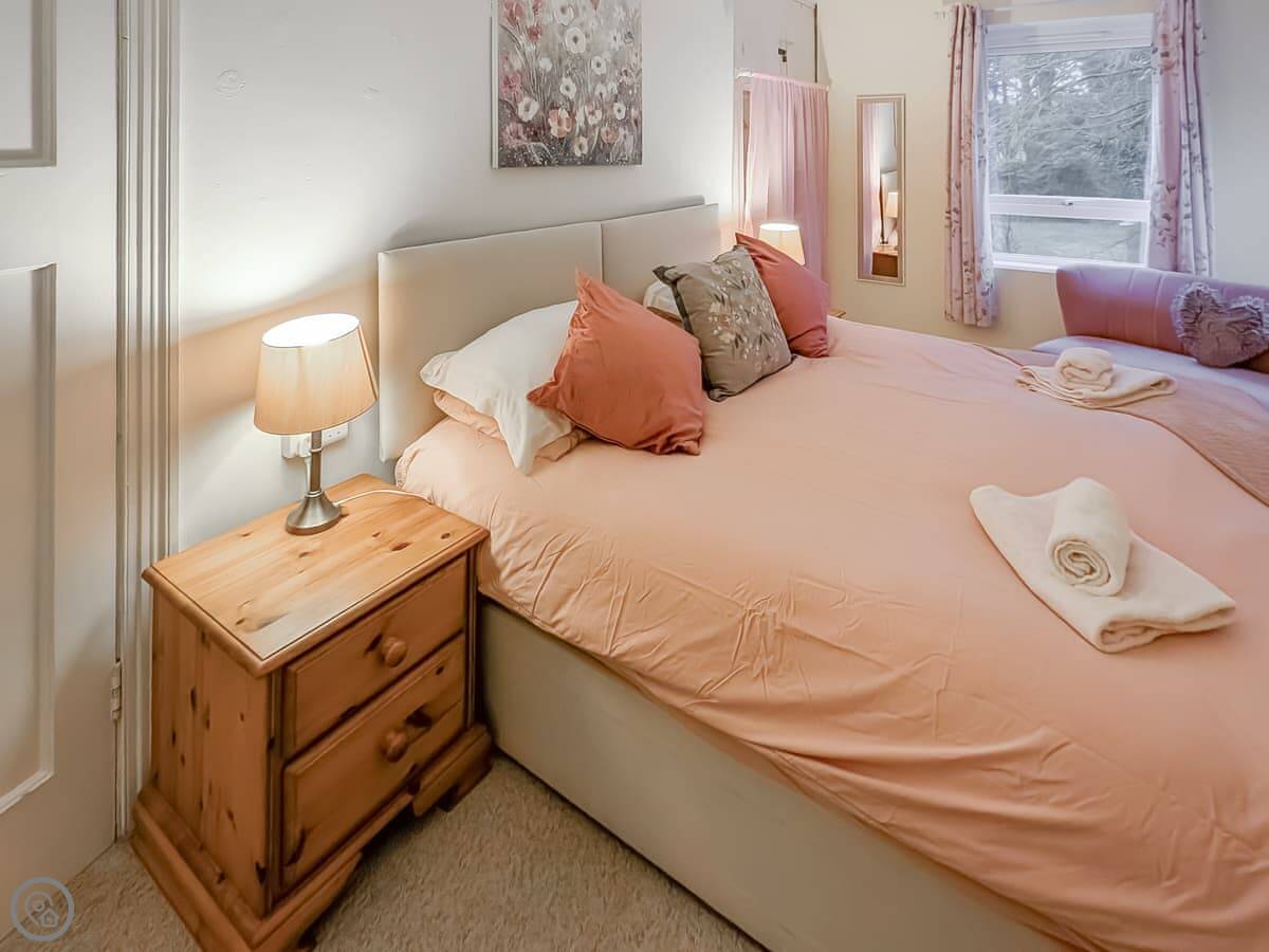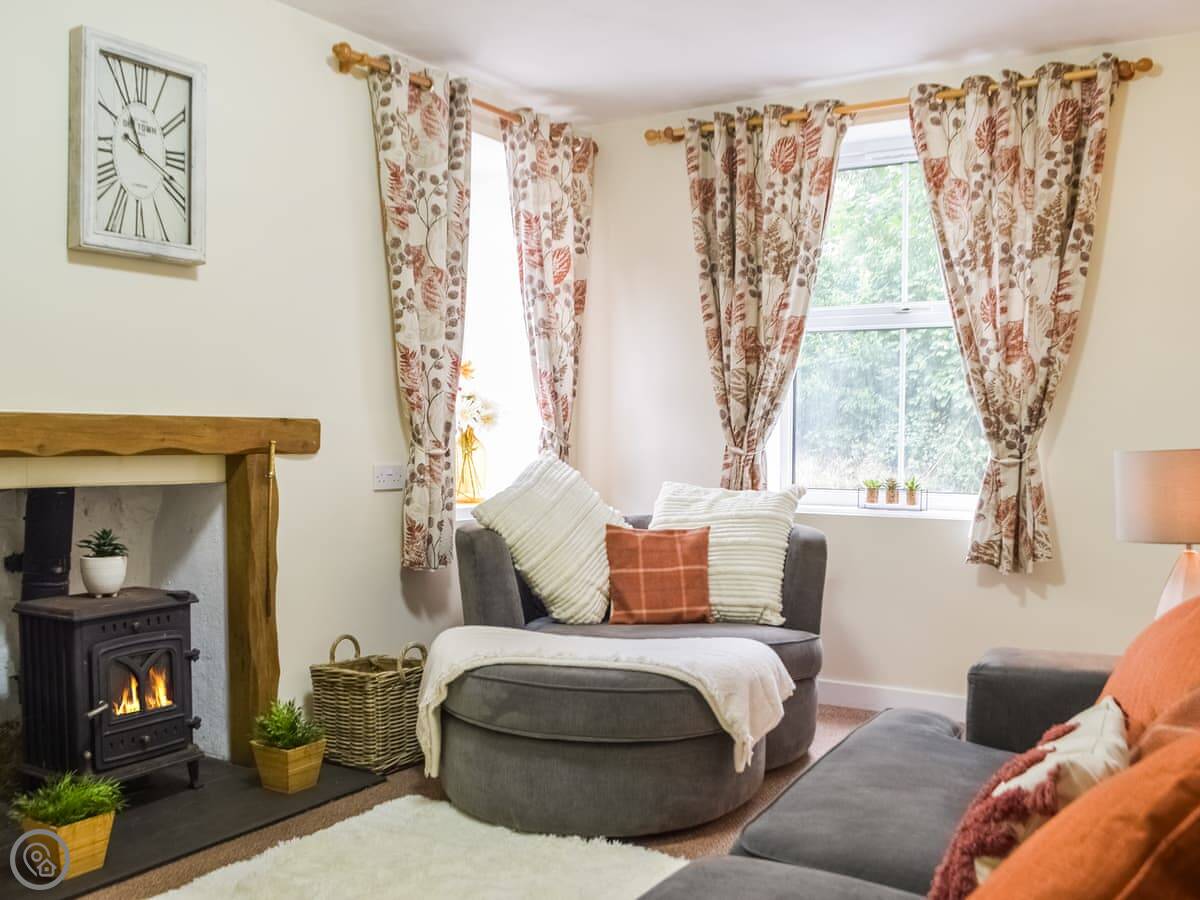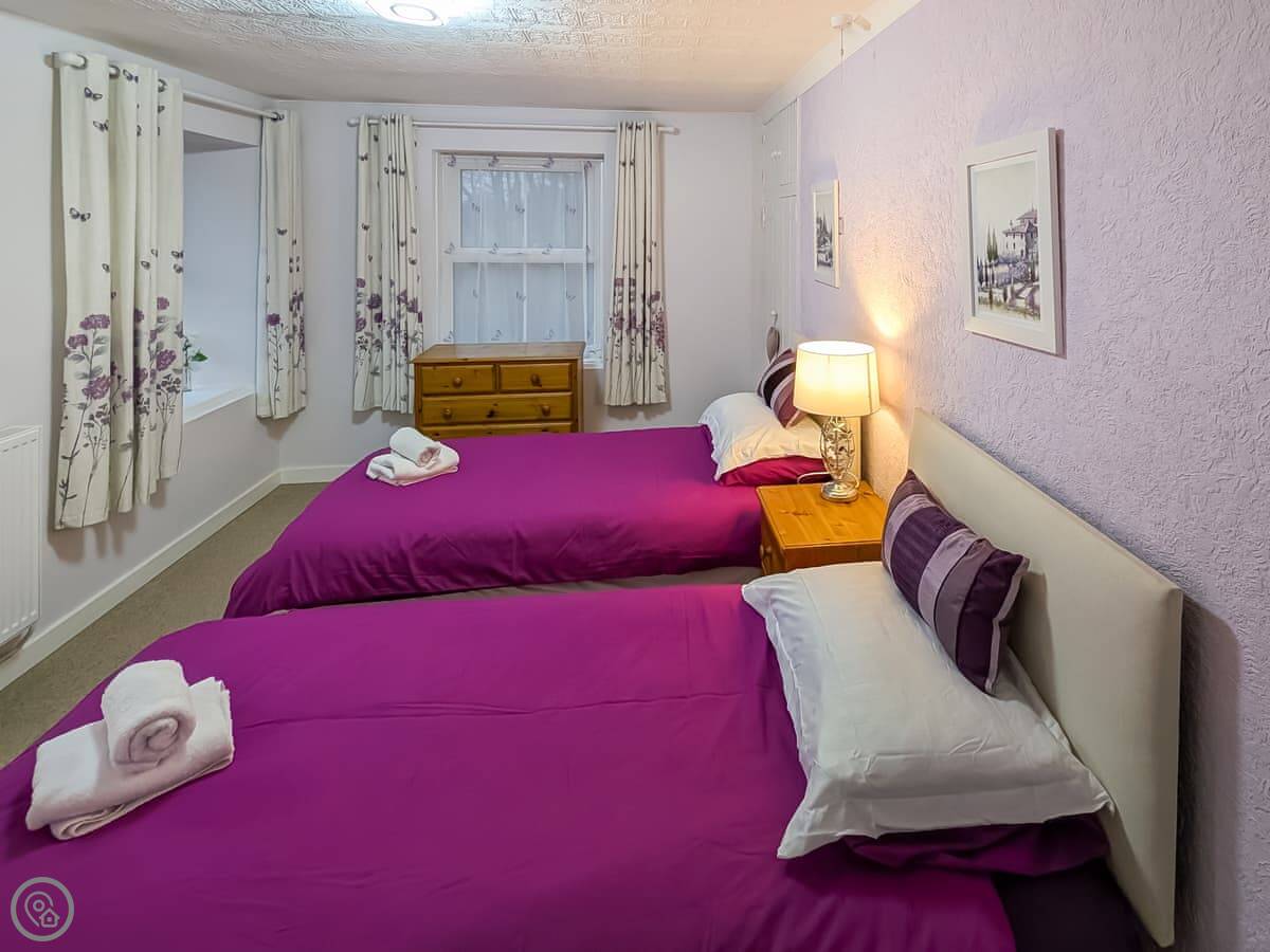 It's got a 4 Star rating. That means it's well equipped. There's a wood burner, a dishwasher, and a washing machine. Bedding and towels are included. The garden is enclosed, which is handy if you have dogs. It says pets welcome, up to two.