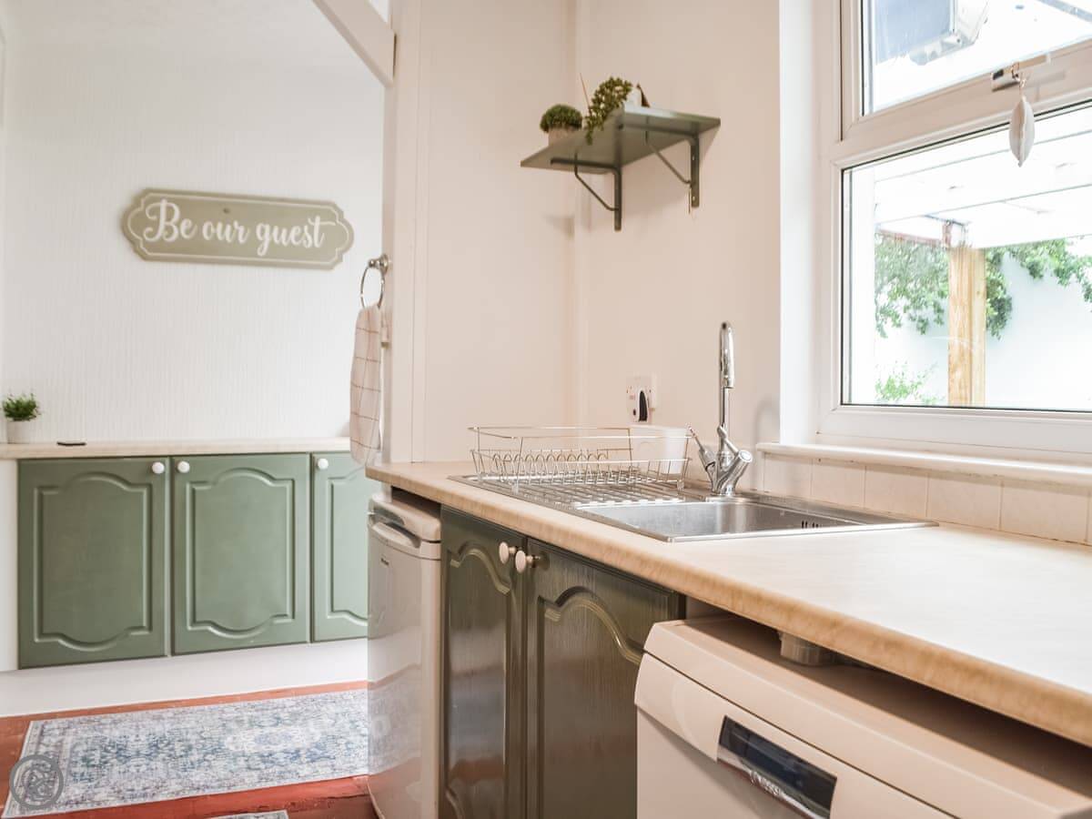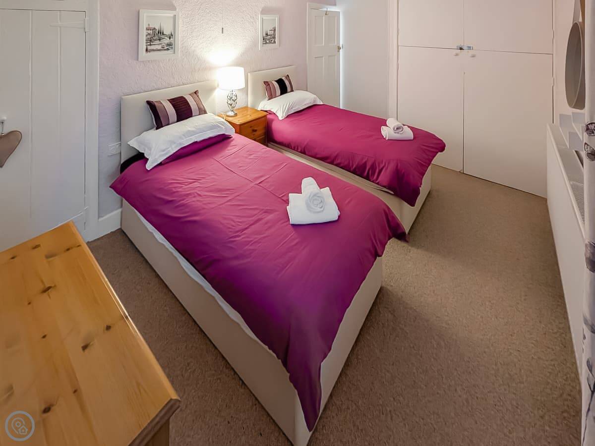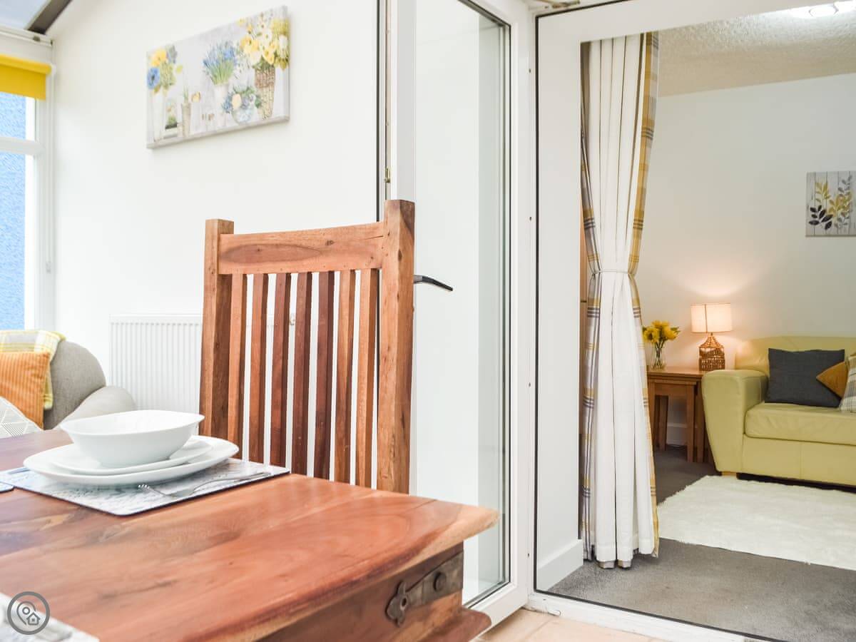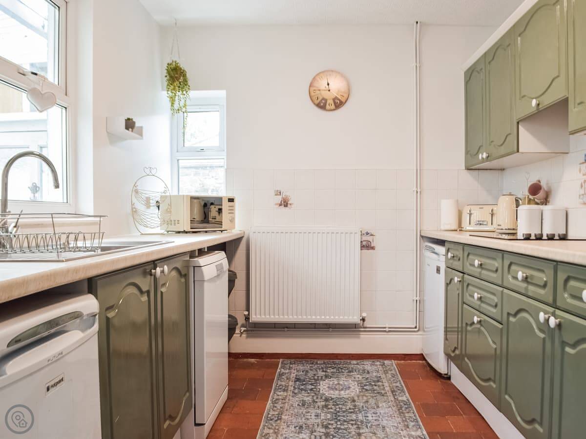 It's got a 4 Star rating. That means it's well equipped. There's a wood burner, a dishwasher, and a washing machine. Bedding and towels are included. The garden is enclosed, which is handy if you have dogs. It says pets welcome, up to two.