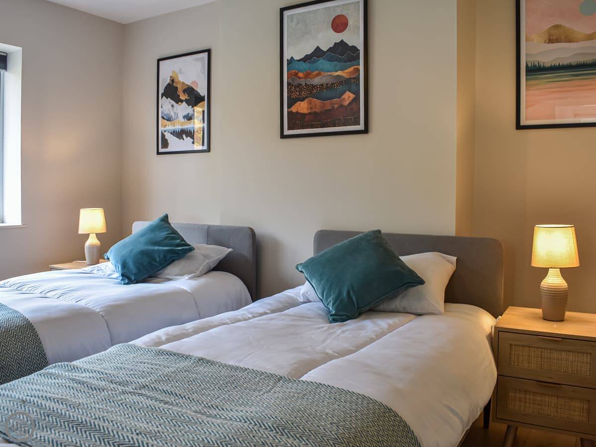 The cottage sleeps six in three bedrooms, with one bathroom. It's a 4 Star place, so it's comfortable and well looked after. It's a proper Lakeland cottage, so the ceilings are a bit low in places, and the stairs are fairly steep. Just something to be aware of.