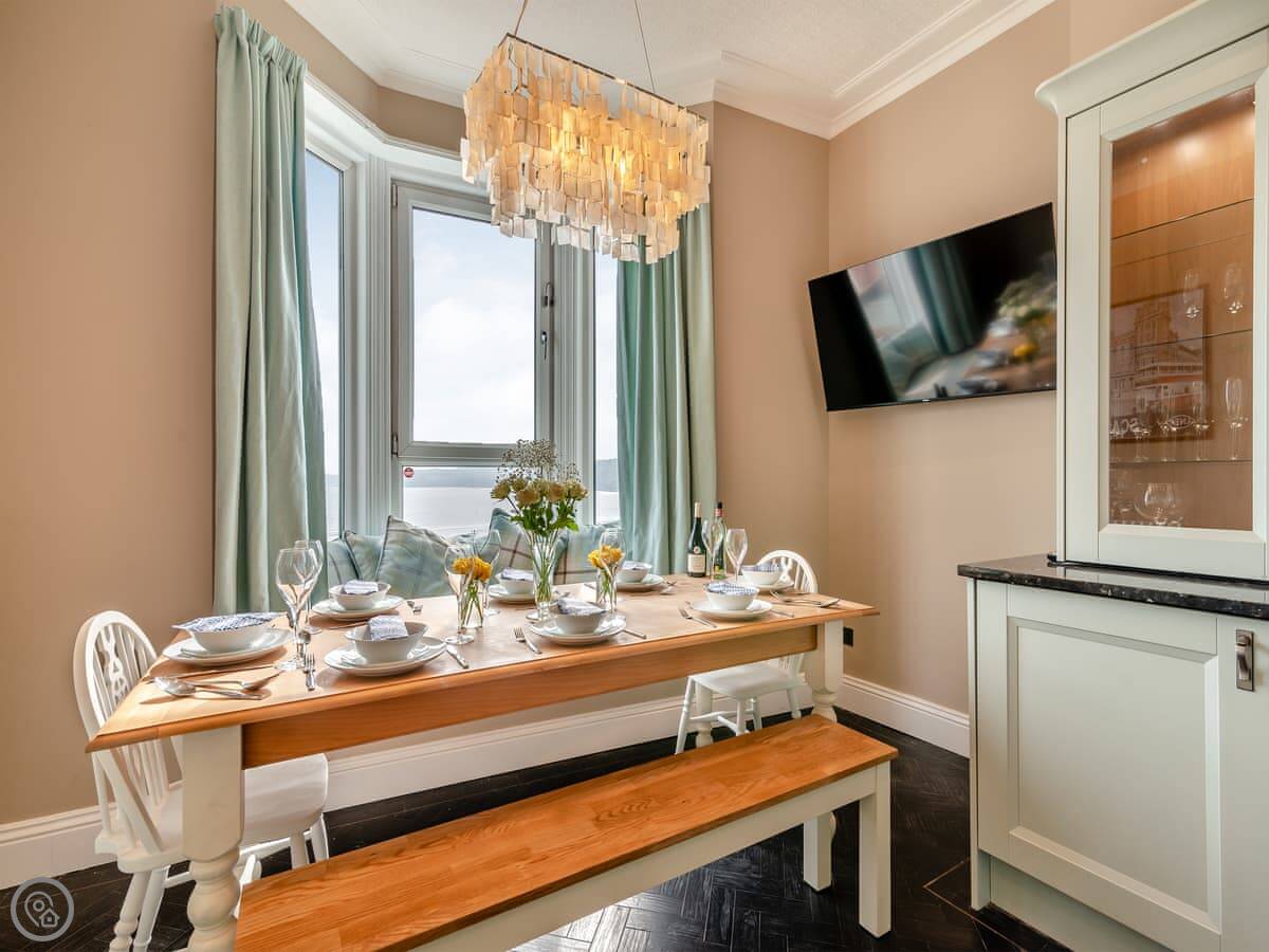 The kitchen and the main living room are on the first floor. The kitchen table is by the window so you can look out at the sea while you eat. The living room has a TV and enough sofas for everyone.