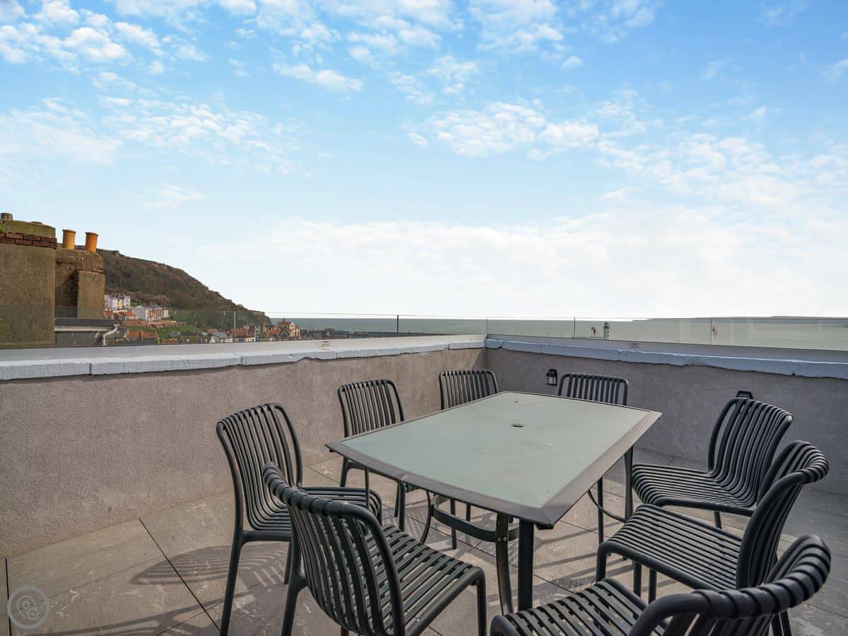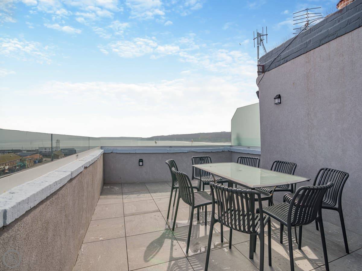 The top floor has another double bedroom and a terrace. The terrace looks right over the beach and the bay. It's a good spot.