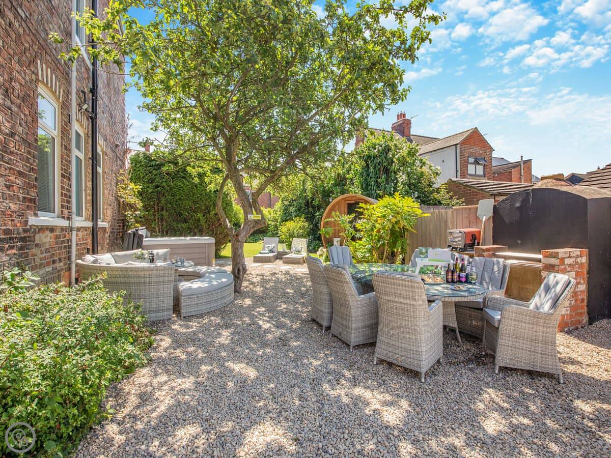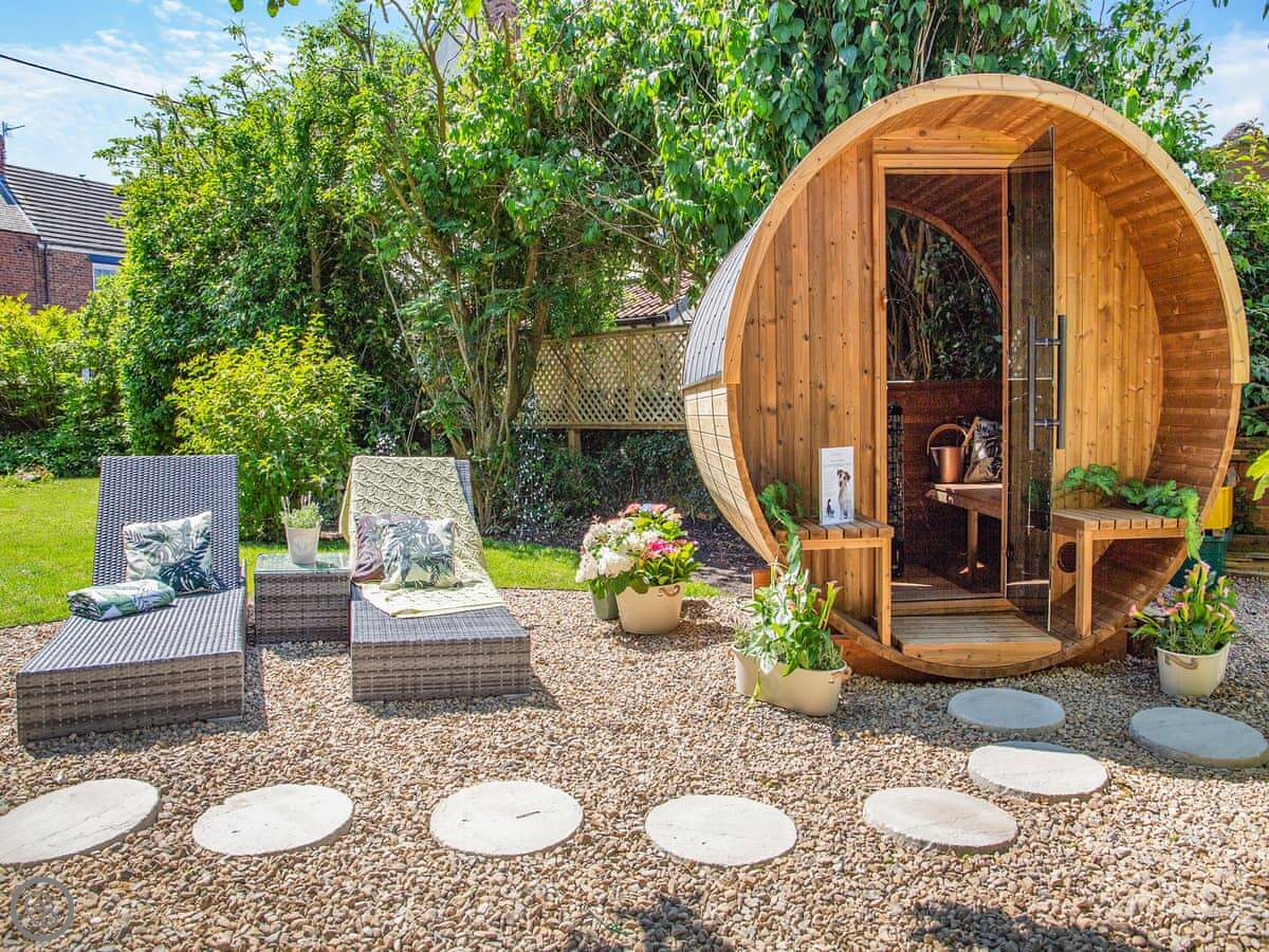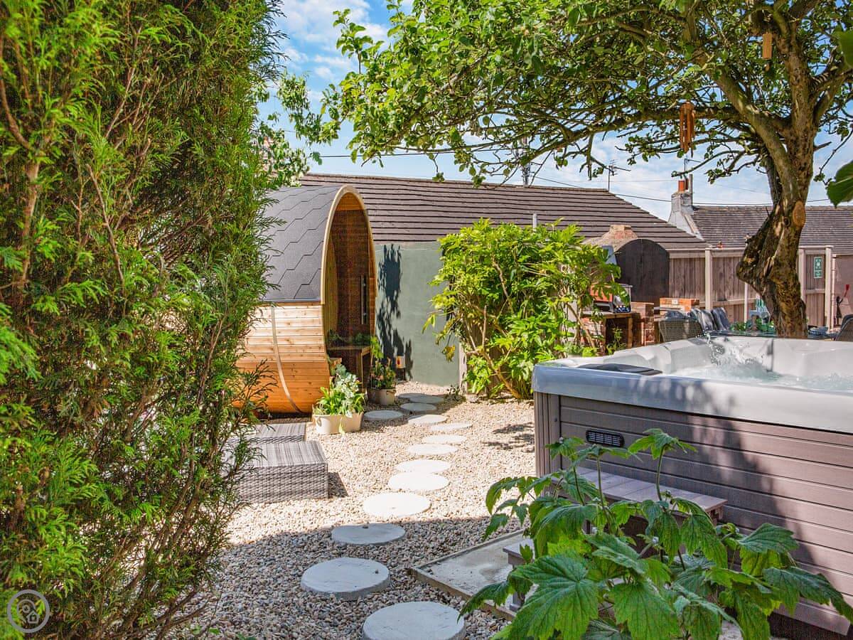 The garden is walled and gated, which is useful if you've got kids or dogs. There's a hot tub and a barrel sauna out there under some trees. Inside, there's a wood burner stove, a dishwasher, and a washing machine. The wifi is included. Bedding and towels are too.
