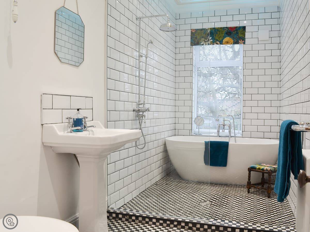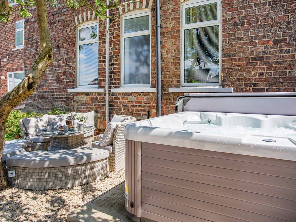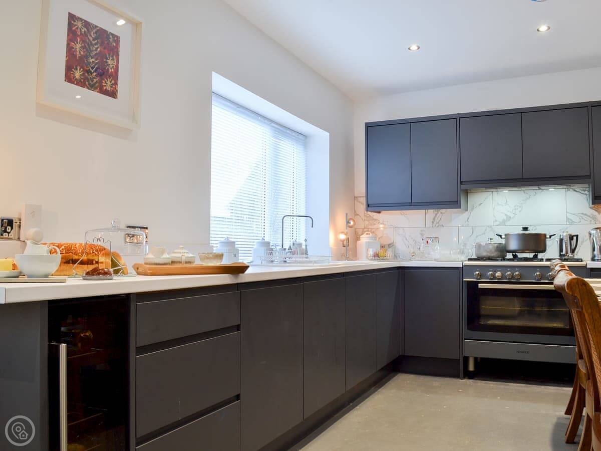 The garden is walled and gated, which is useful if you've got kids or dogs. There's a hot tub and a barrel sauna out there under some trees. Inside, there's a wood burner stove, a dishwasher, and a washing machine. The wifi is included. Bedding and towels are too.