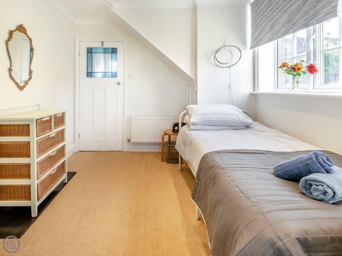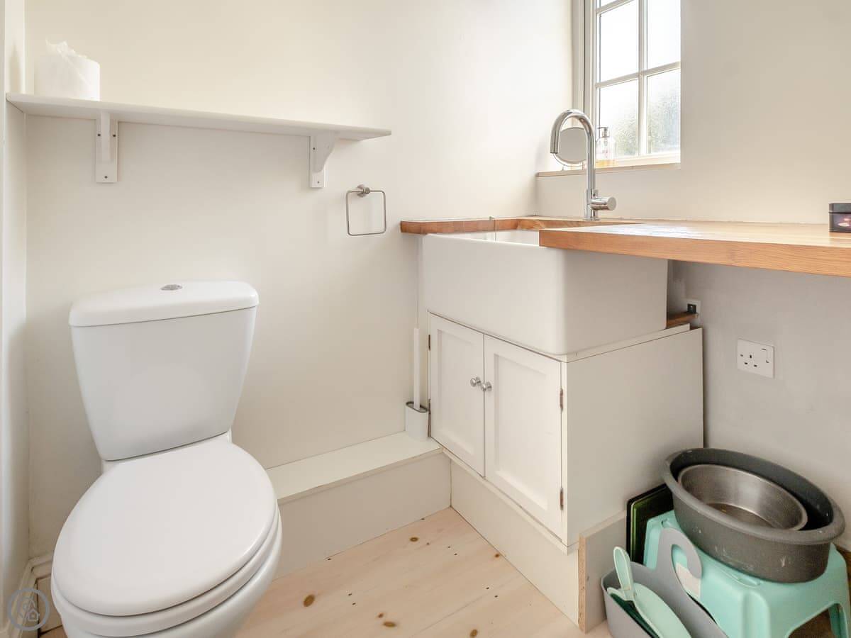 Sleeps five, but one of those is in a single bedroom downstairs. The other two bedrooms are up in the loft, a kingsize and a double. There's one bathroom, also upstairs. It's got a bath and a walk-in shower.