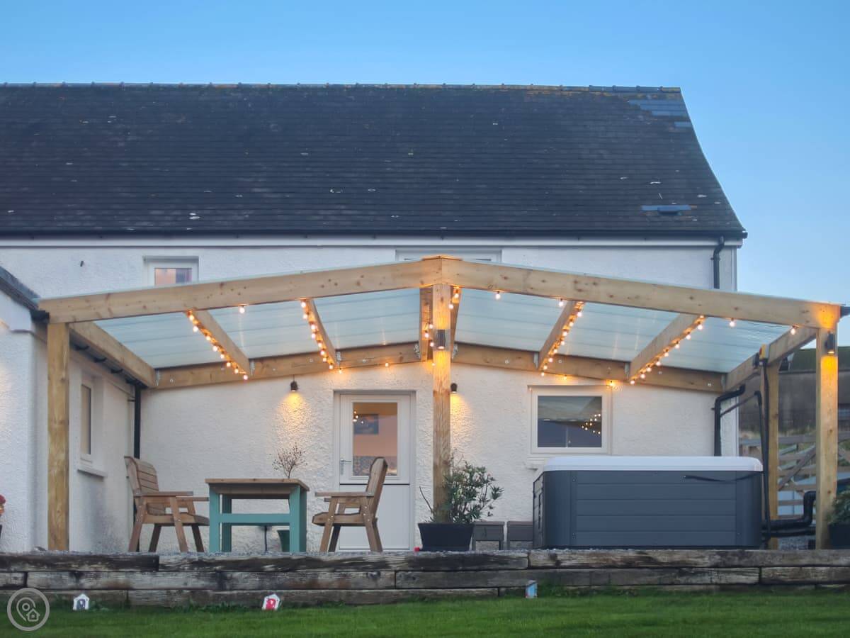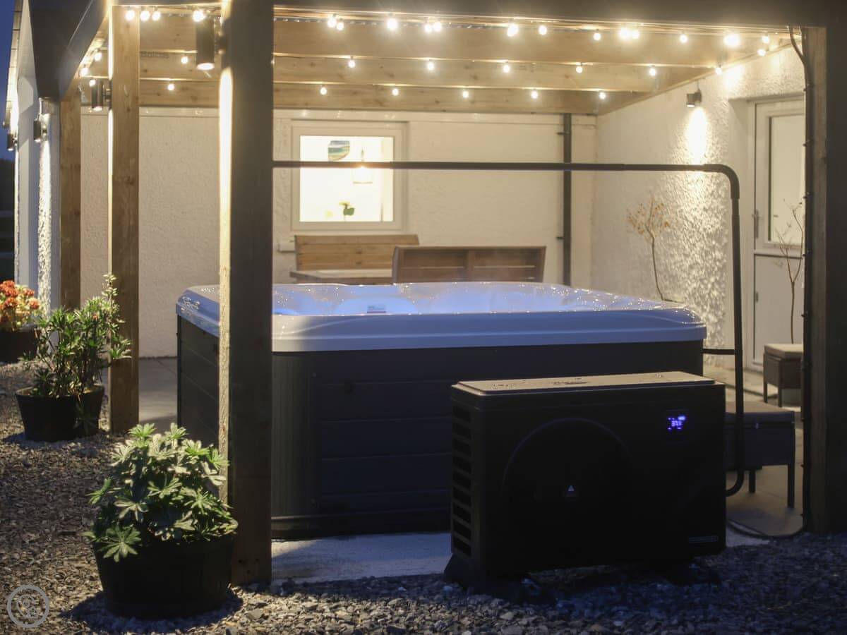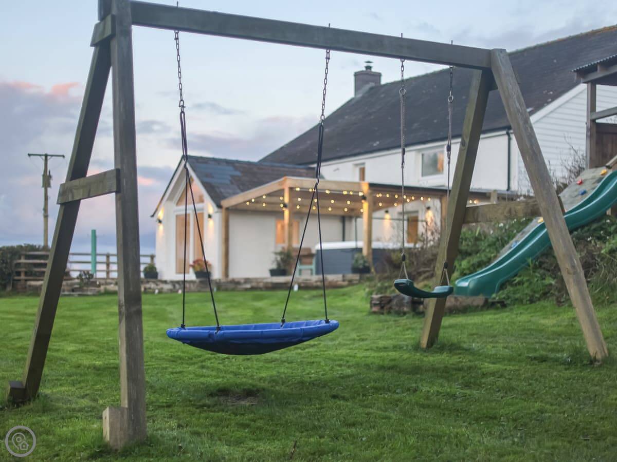 The garden is enclosed. There's a hot tub and a barbecue. There's a kids' play area with a slide and swing. You can bring two dogs.