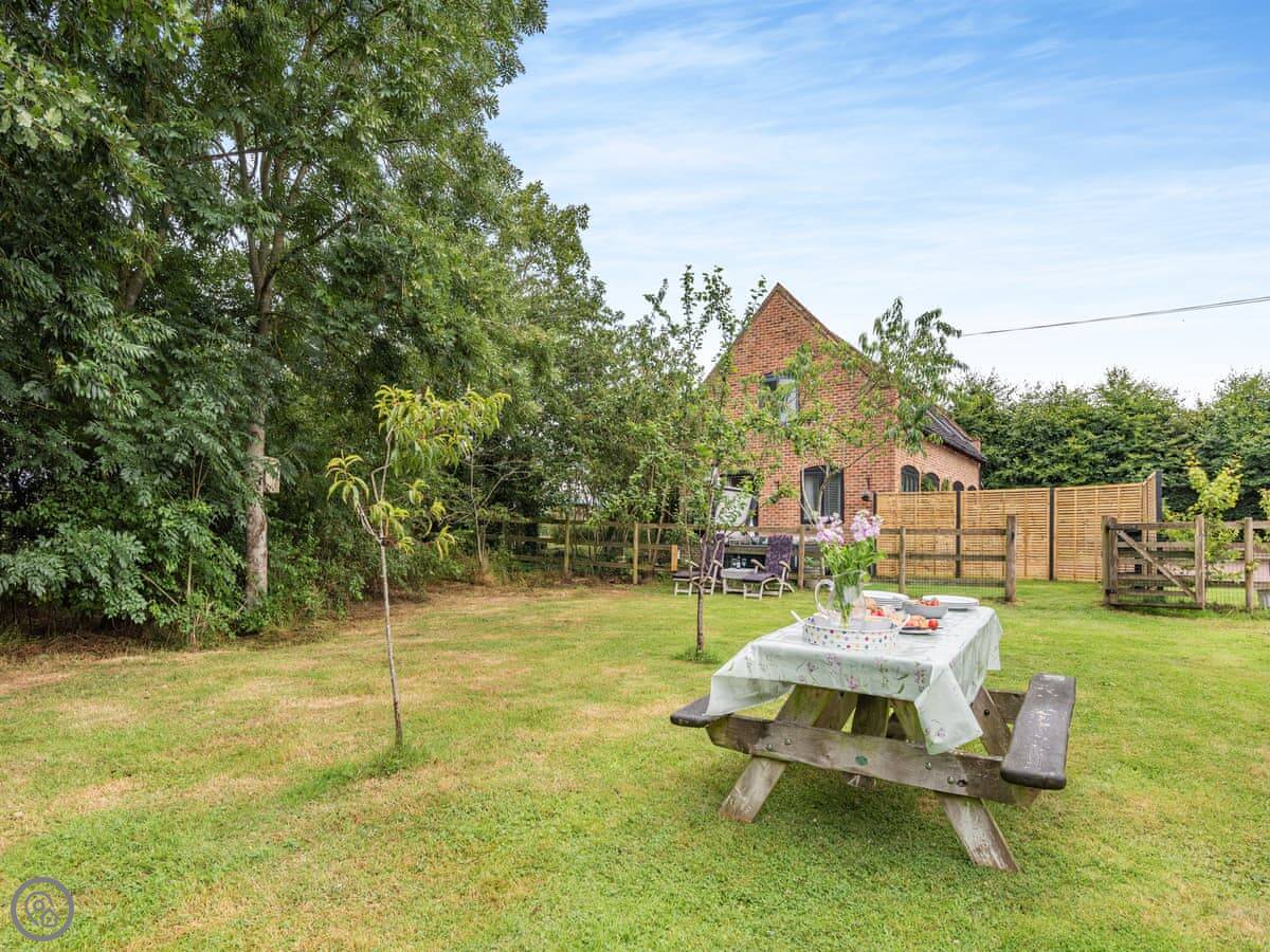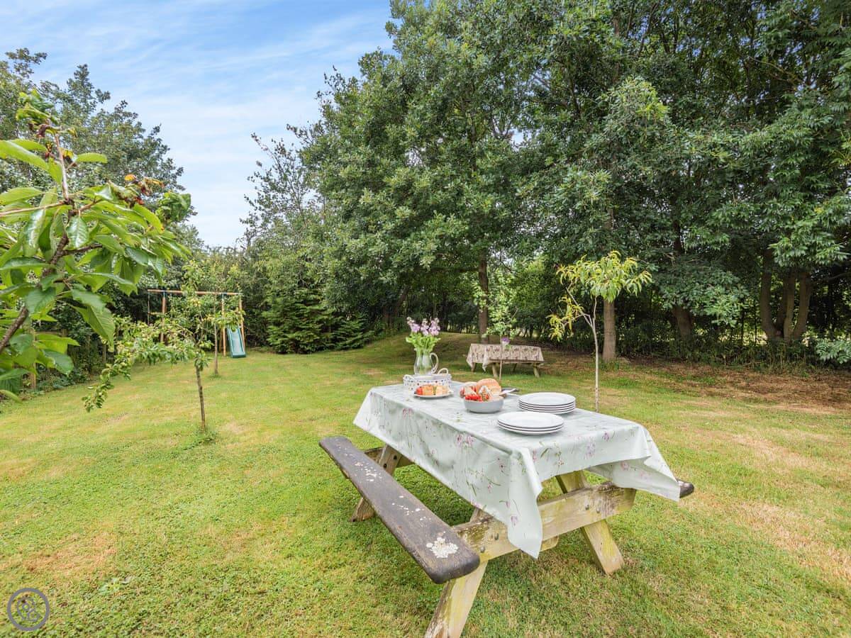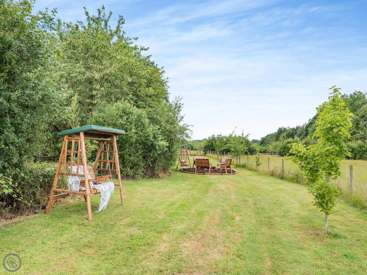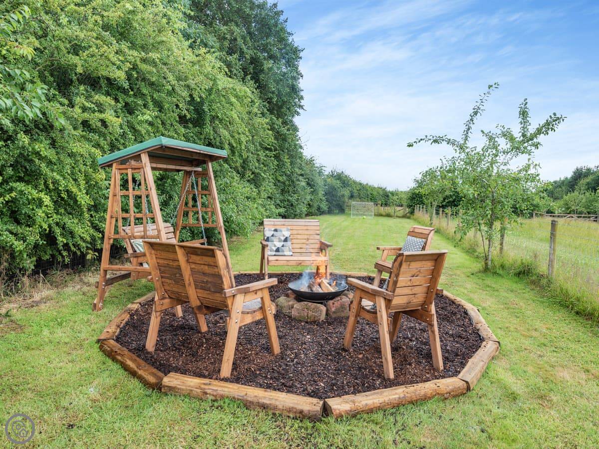 Outside, there's a patio with a hot tub. The garden is enclosed, so it's safe for kids and dogs. There's a bit of play equipment in the orchard part. You can use the BBQ and there's a fire pit with seating.