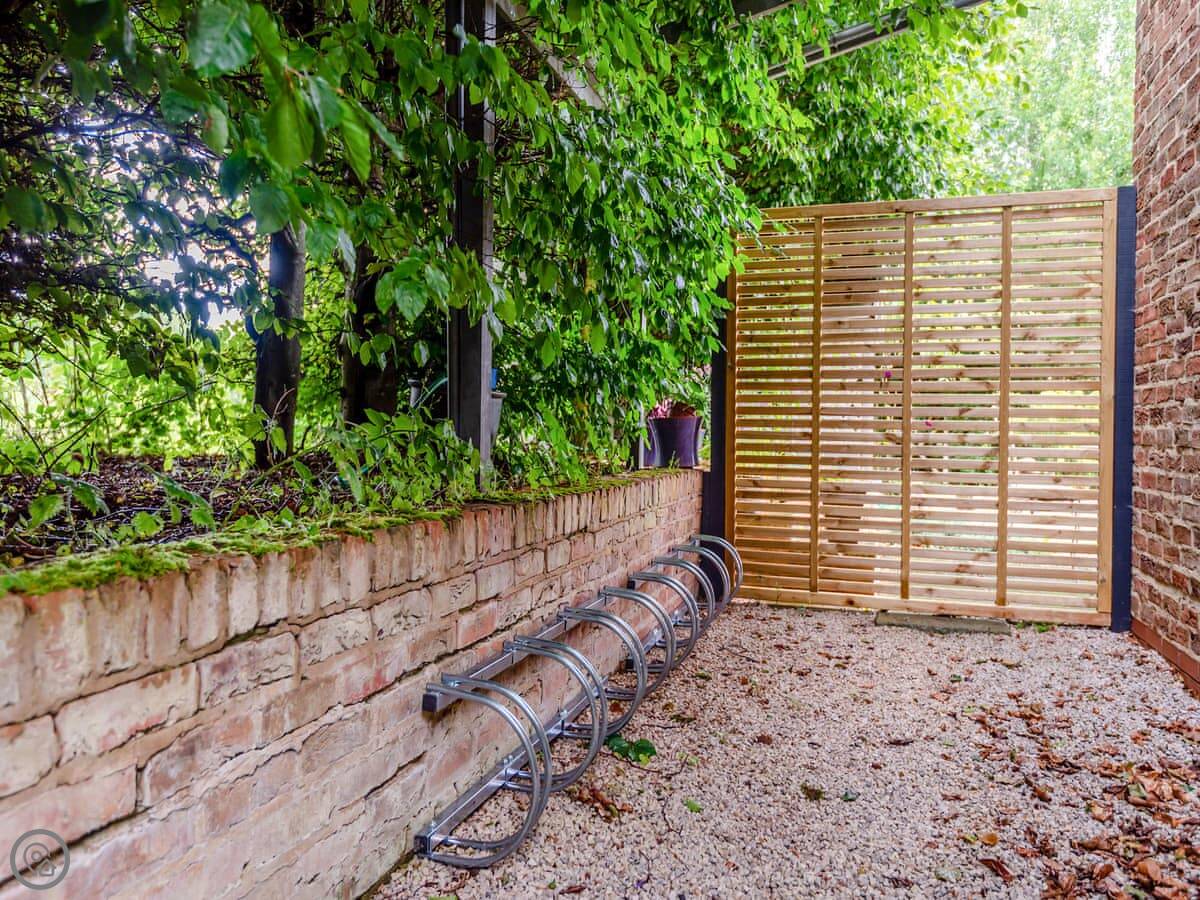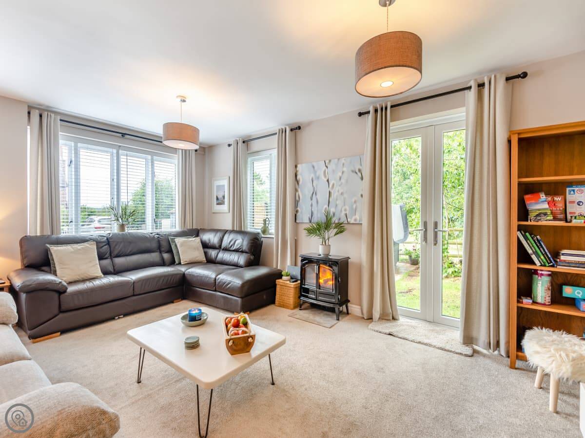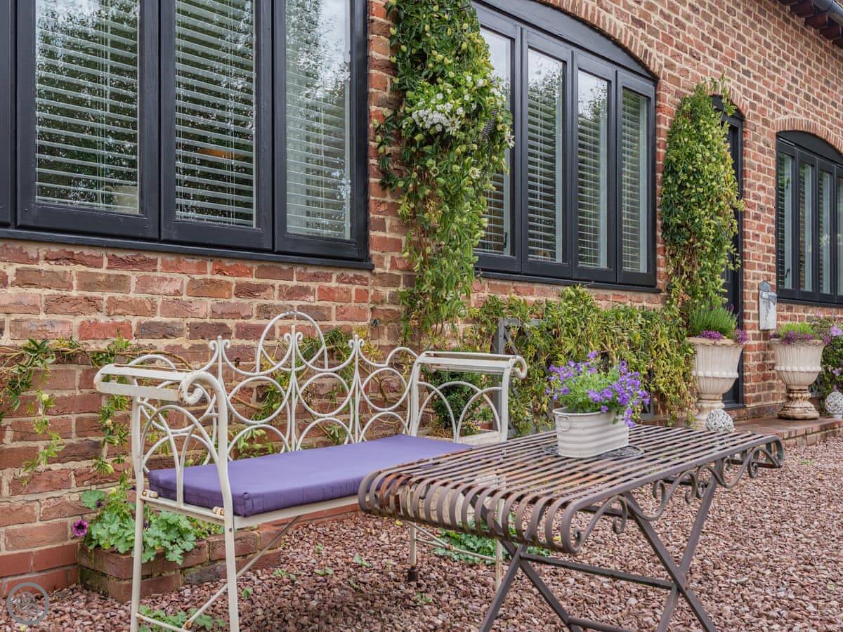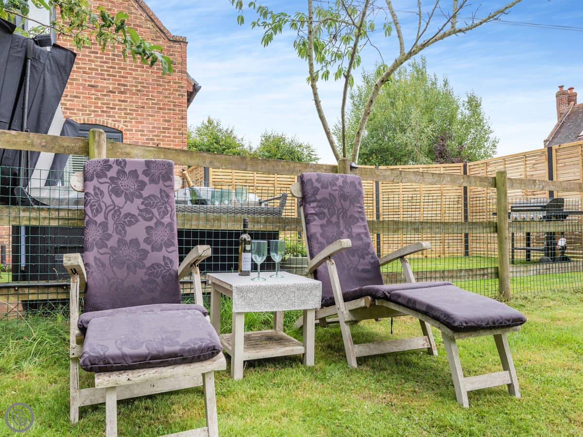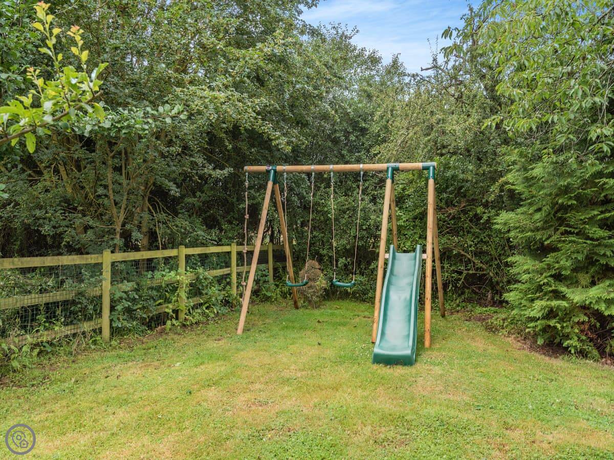 Outside, there's a patio with a hot tub. The garden is enclosed, so it's safe for kids and dogs. There's a bit of play equipment in the orchard part. You can use the BBQ and there's a fire pit with seating.