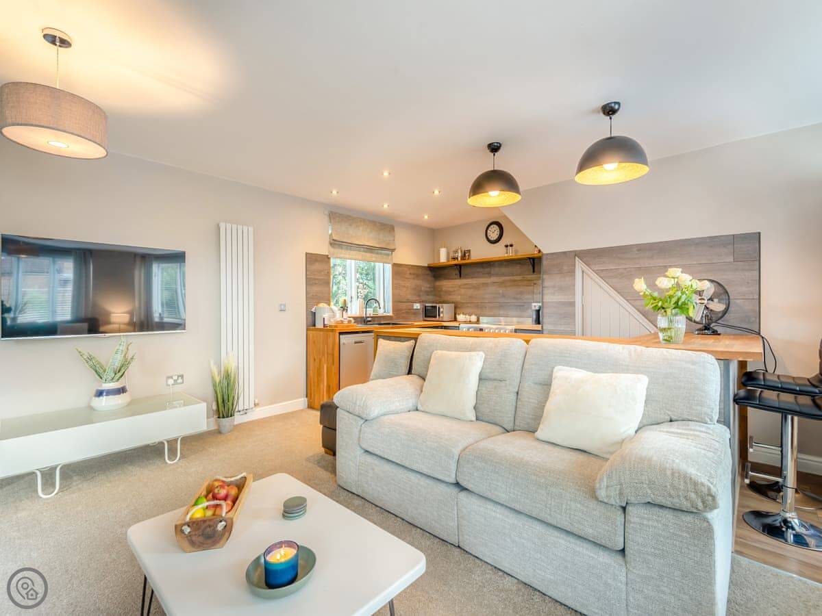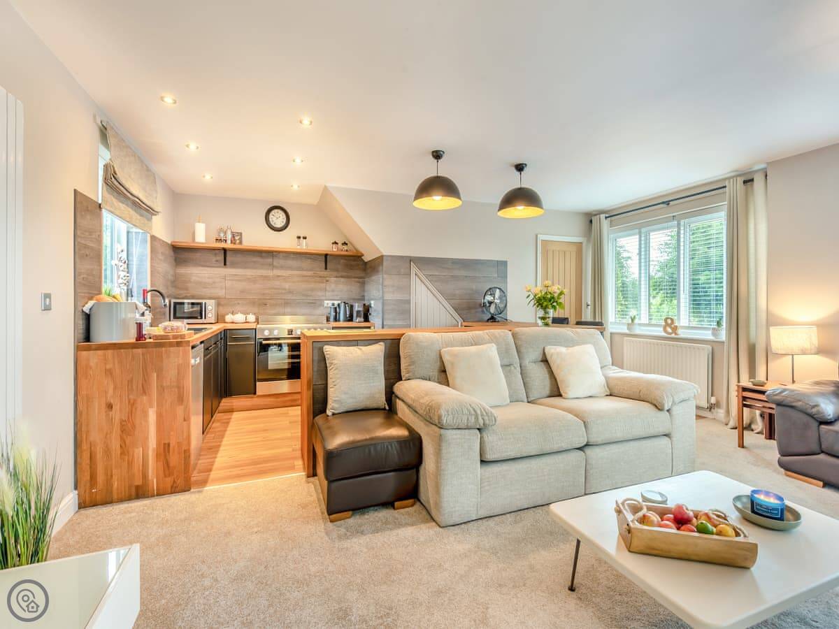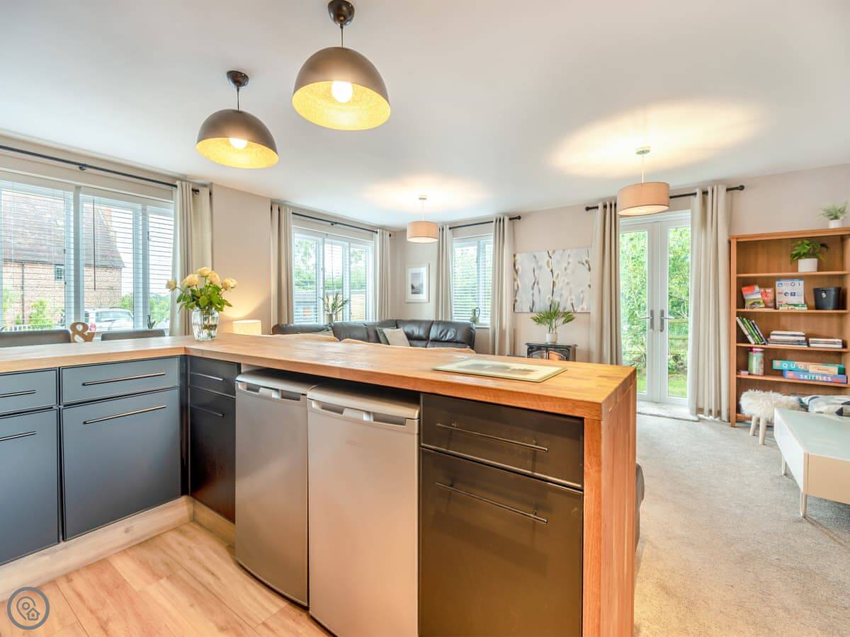 The kitchen is open-plan with the living area. It's a good space for everyone to be in. There's a separate dining room that seats eight. The stairs are a standard flight, not steep.