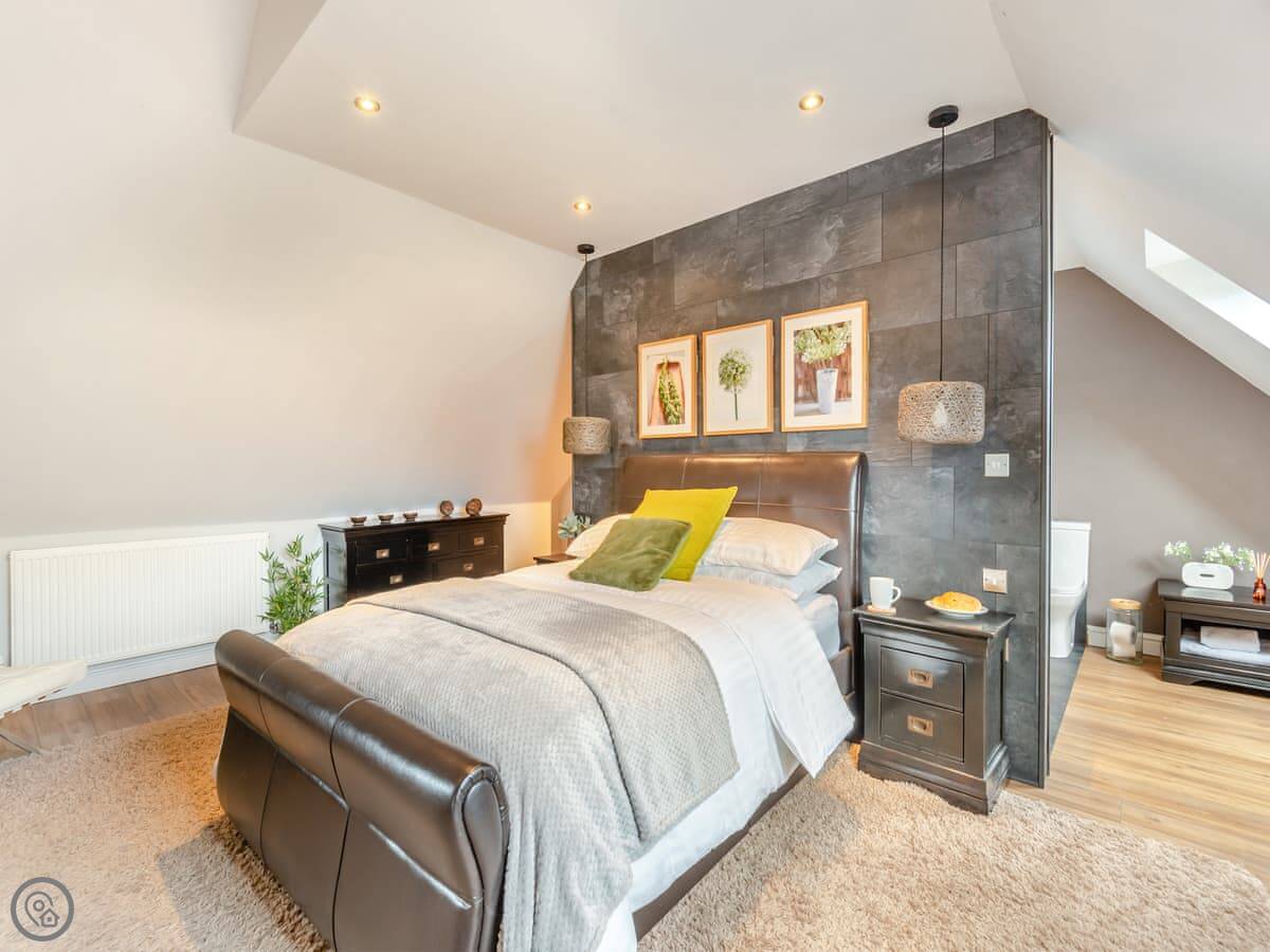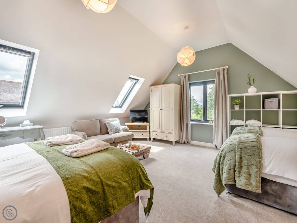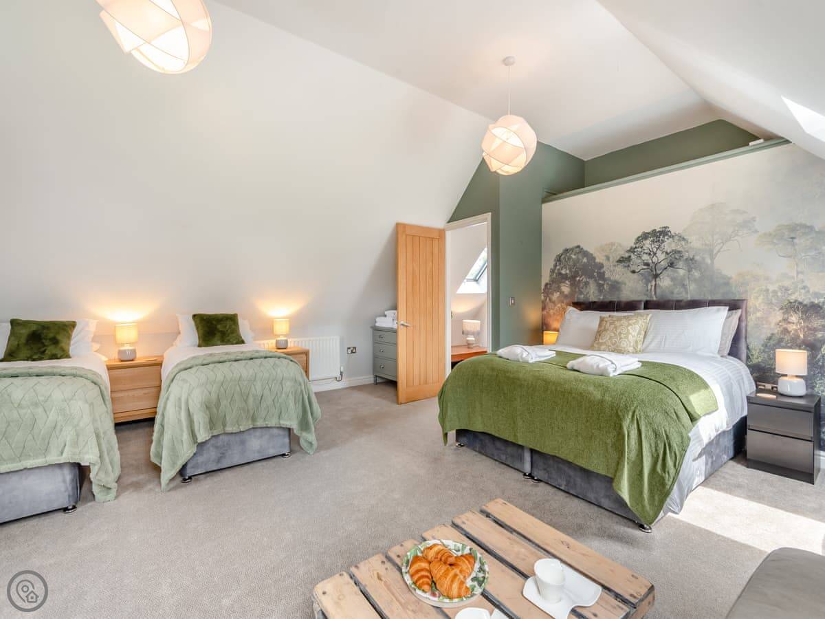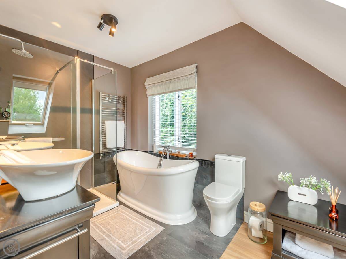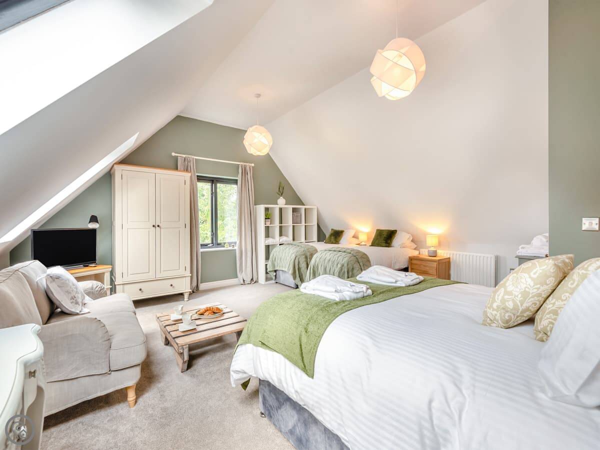 It sleeps eight, but it's three bedrooms. That's because one room is set up as a family room. It has a king-size bed and then two singles, plus a sofa and TV. It works well if you've got kids. The master bedroom has an en-suite with a free-standing bath and a big walk-in shower. The third bedroom is downstairs, which is handy. There's a second shower room next to it.