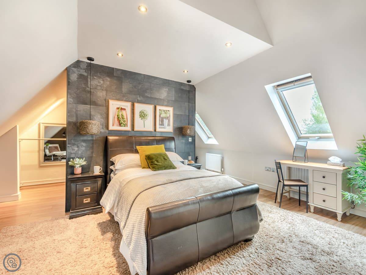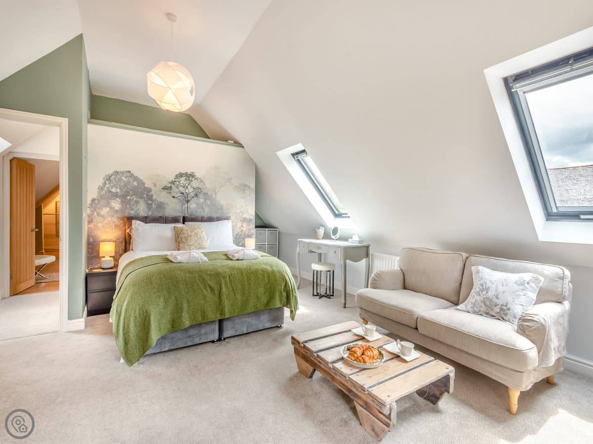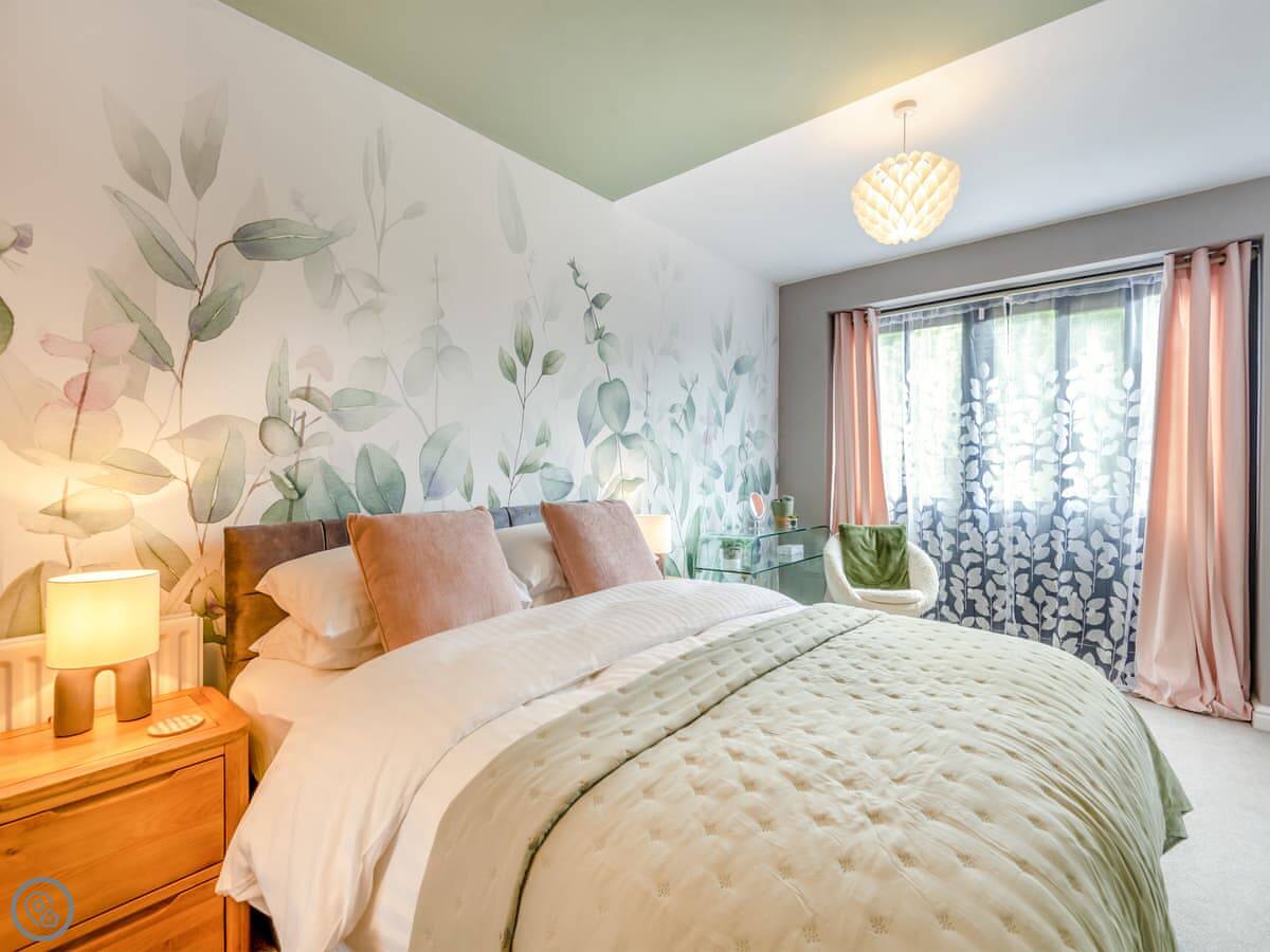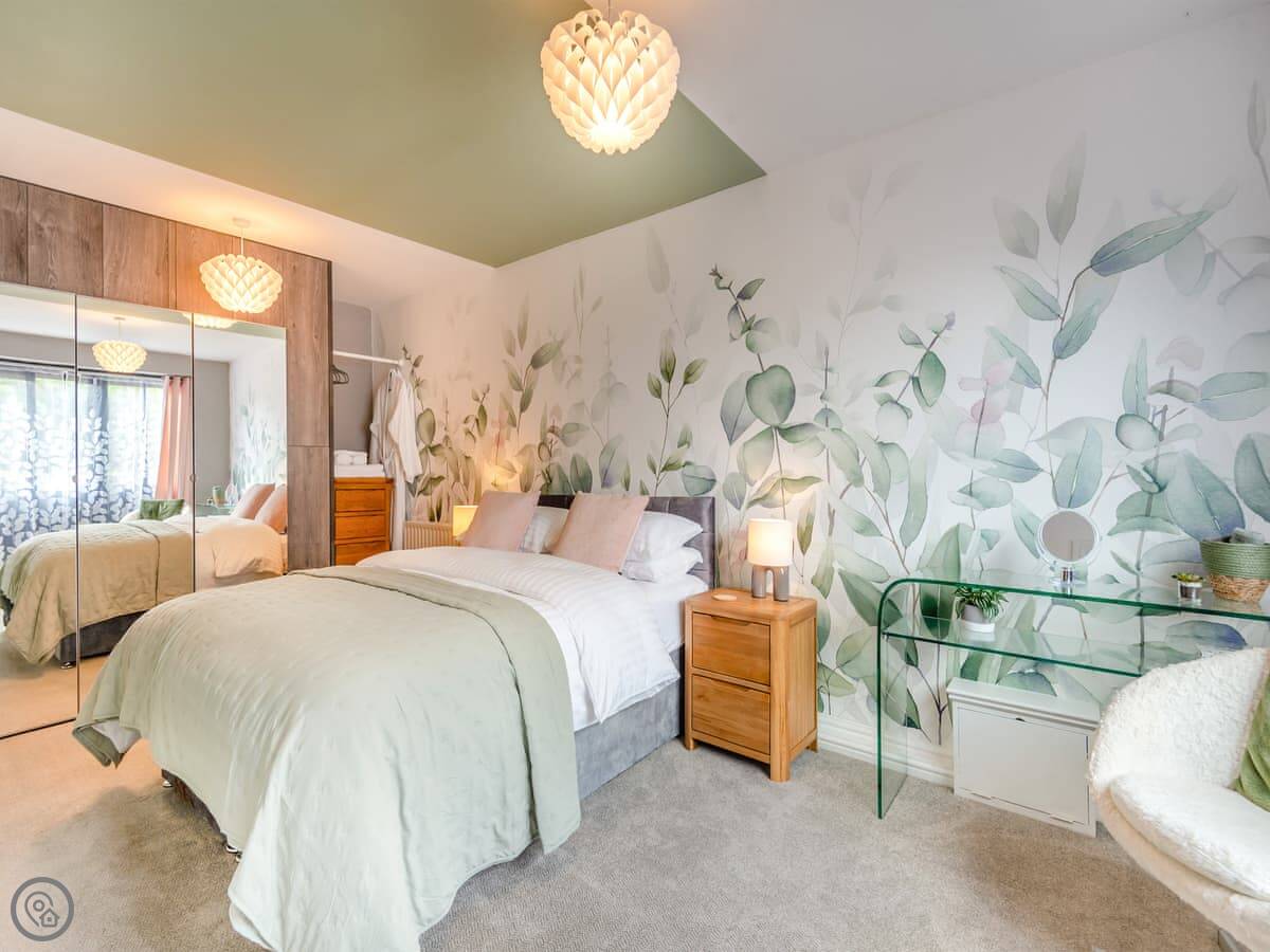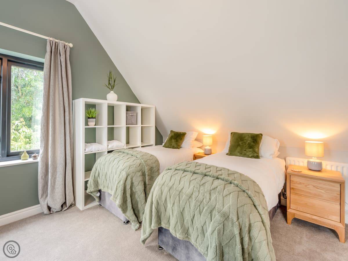 It sleeps eight, but it's three bedrooms. That's because one room is set up as a family room. It has a king-size bed and then two singles, plus a sofa and TV. It works well if you've got kids. The master bedroom has an en-suite with a free-standing bath and a big walk-in shower. The third bedroom is downstairs, which is handy. There's a second shower room next to it.