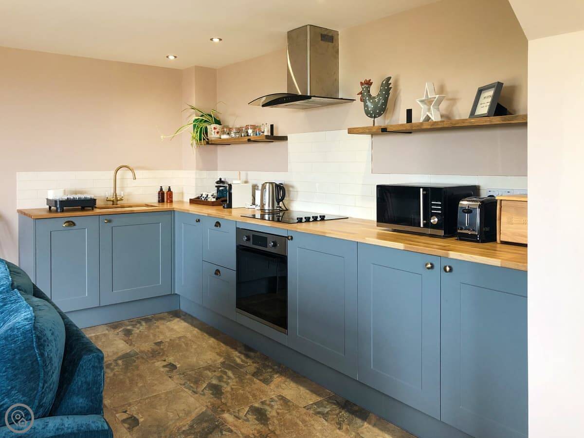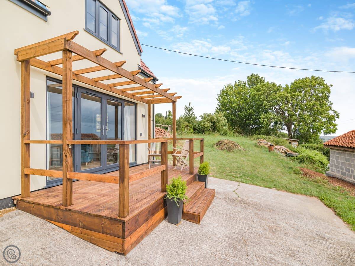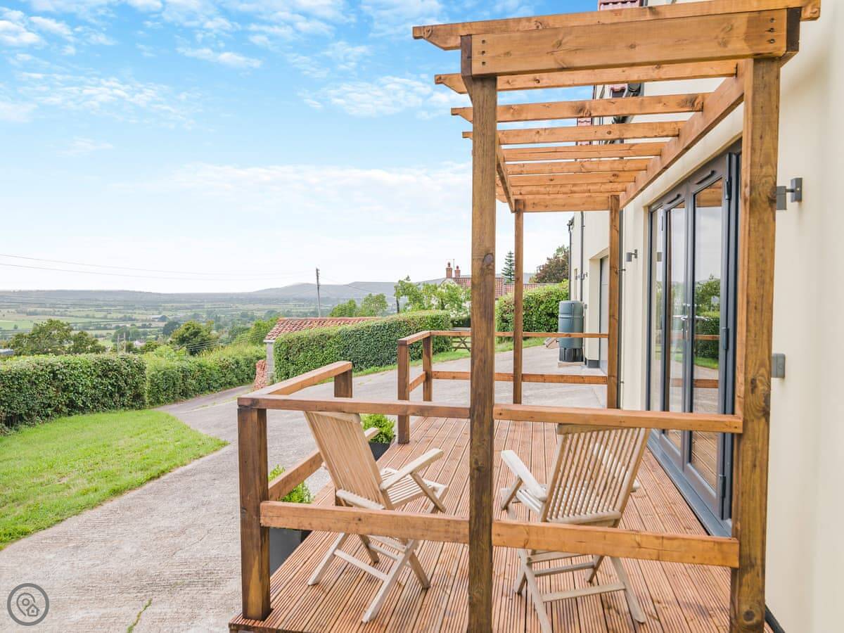It's a 5 Star place, which means it's been finished to a high standard. It's clean, modern, and everything works. You get the whole space to yourselves. It's open plan downstairs. The sofa, dining table and kitchen are all in one room. There are French doors that open onto a deck. The views from there are good. On a clear day, you can see right out to the sea.