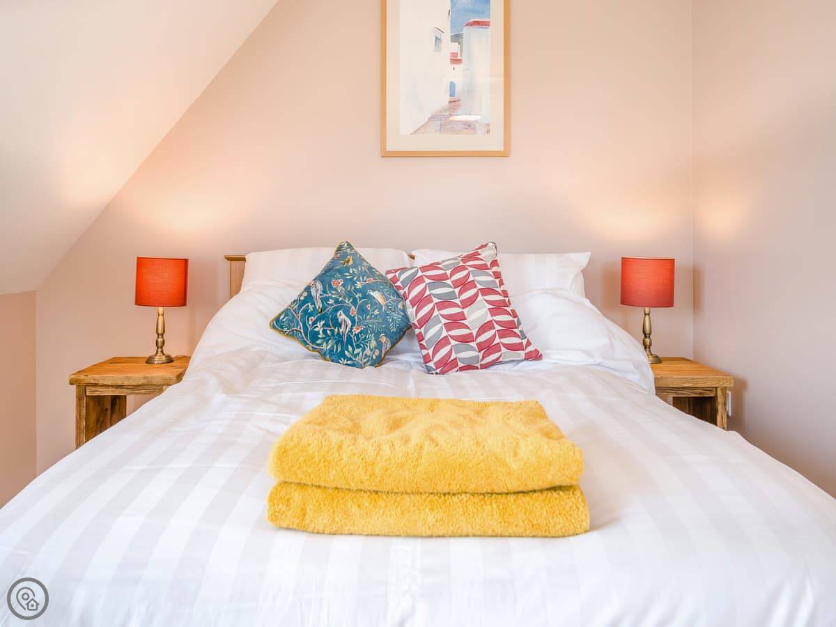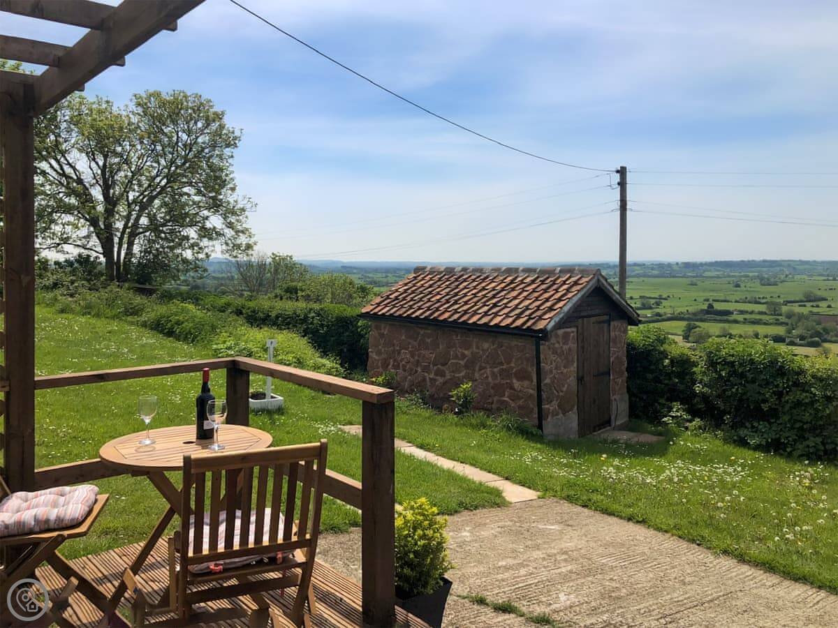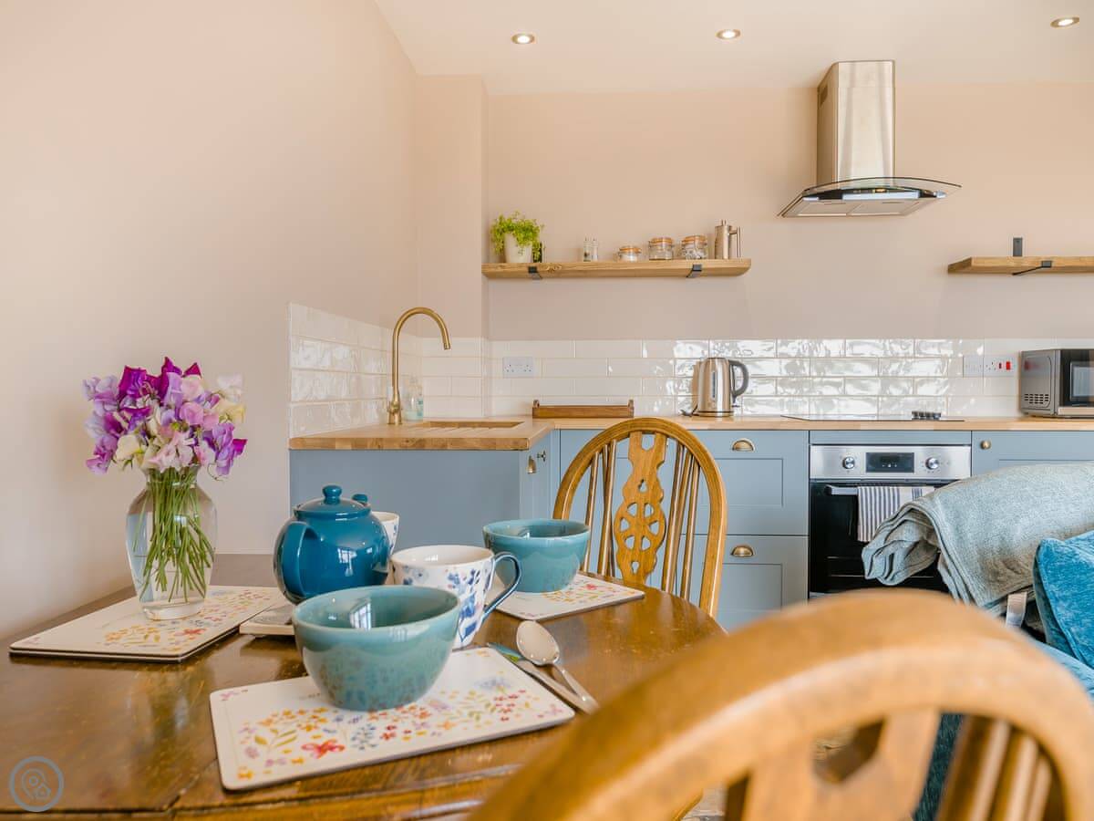 It's a 5 Star place, which means it's been finished to a high standard. It's clean, modern, and everything works. You get the whole space to yourselves. It's open plan downstairs. The sofa, dining table and kitchen are all in one room. There are French doors that open onto a deck. The views from there are good. On a clear day, you can see right out to the sea.