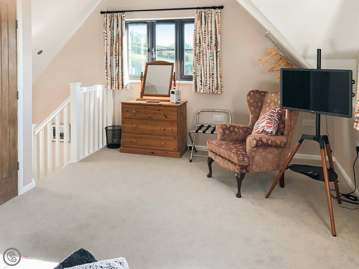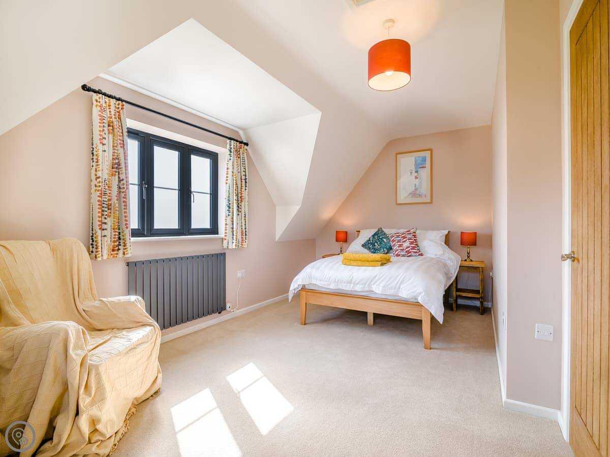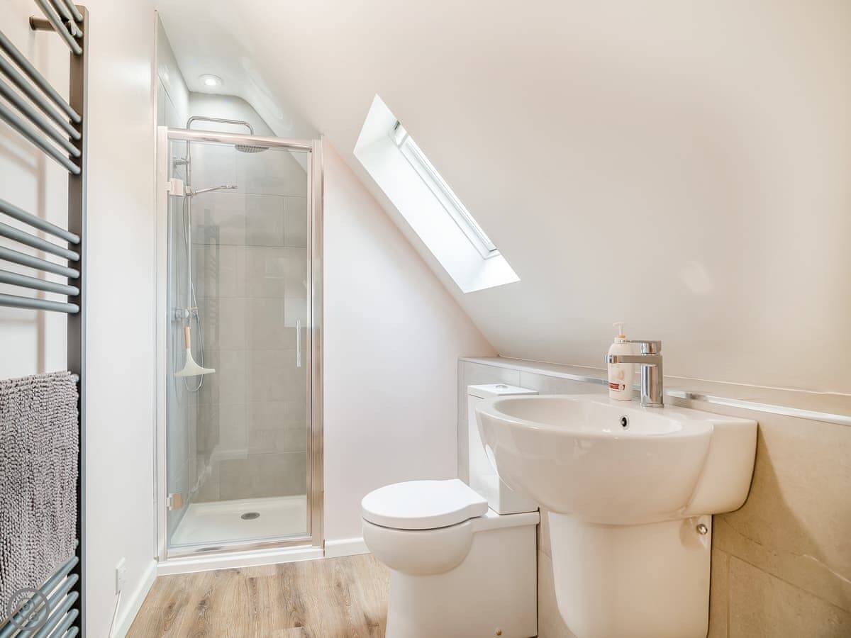 Upstairs is the bedroom and an en-suite shower room. The stairs are a standard staircase, not a ladder, which is worth mentioning as some places like this have those. It has underfloor heating downstairs. There's a washing machine and tumble dryer in a separate utility room. It has an electric vehicle charger.