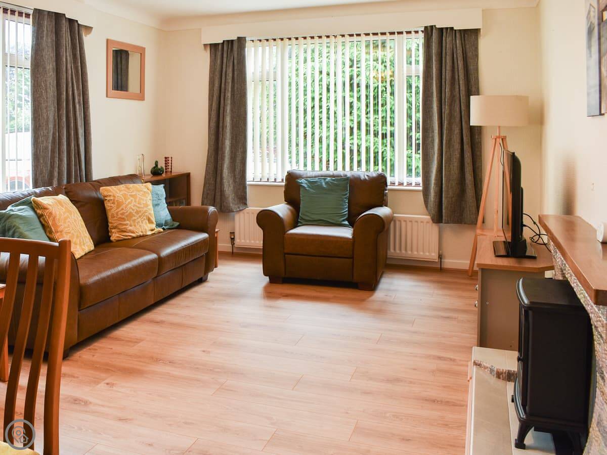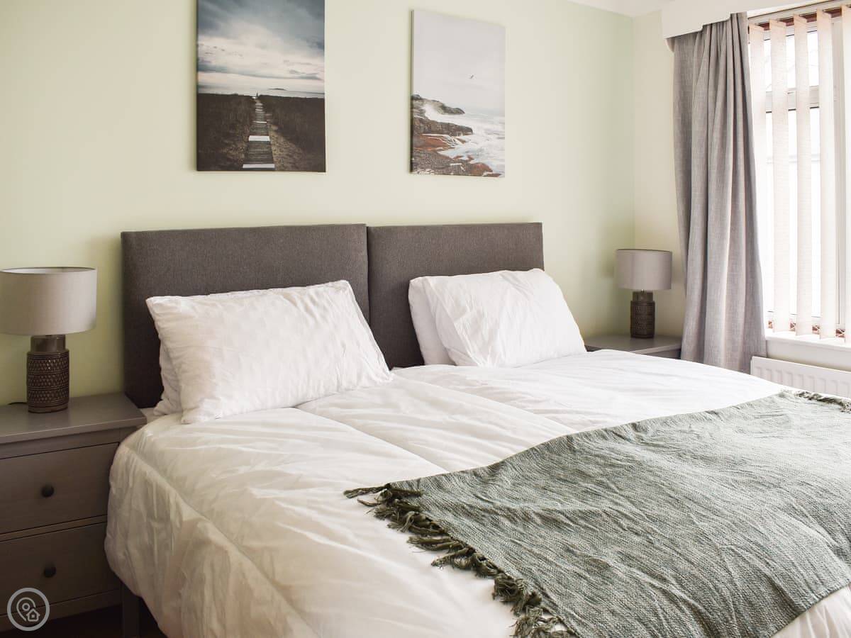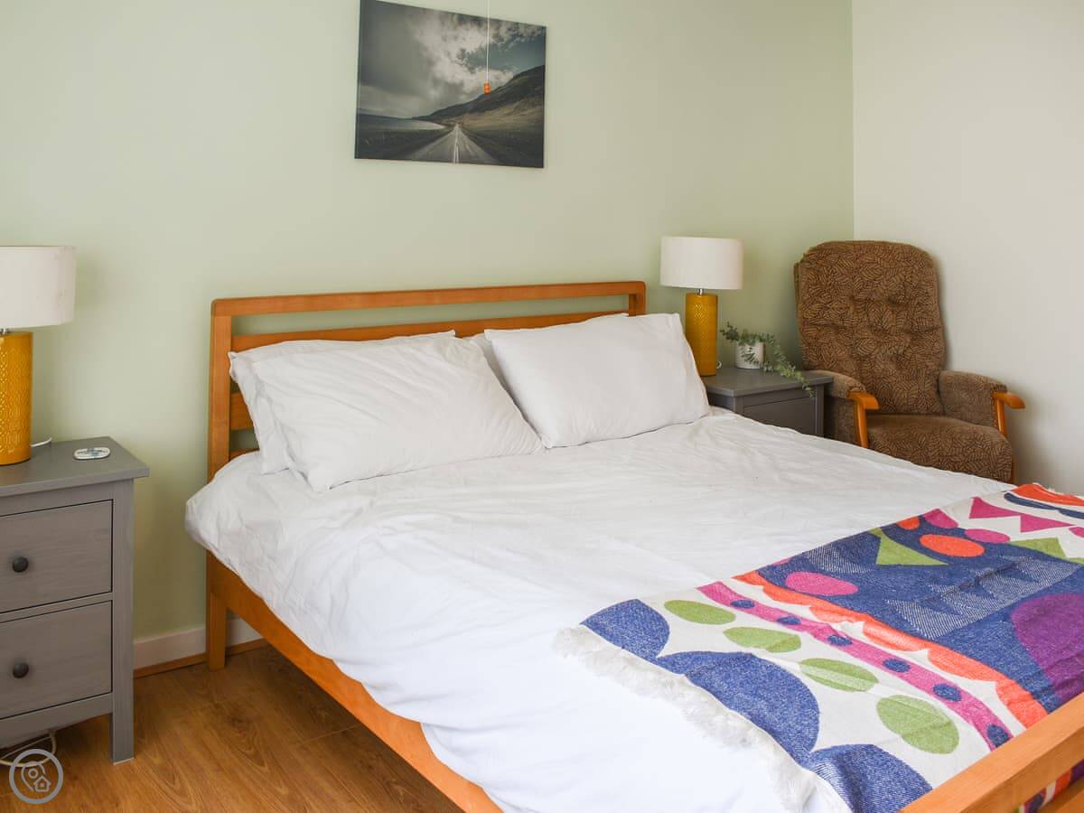 It sleeps four. There are two bedrooms on the ground floor. One has a double bed, the other has a zip-and-link bed that can be either a king-size or two singles. One bathroom with a shower over the bath. It's got a 3 Star rating, which means it's clean, comfortable and everything works, but it's not luxury. The entrance and the main rooms are wheelchair accessible.